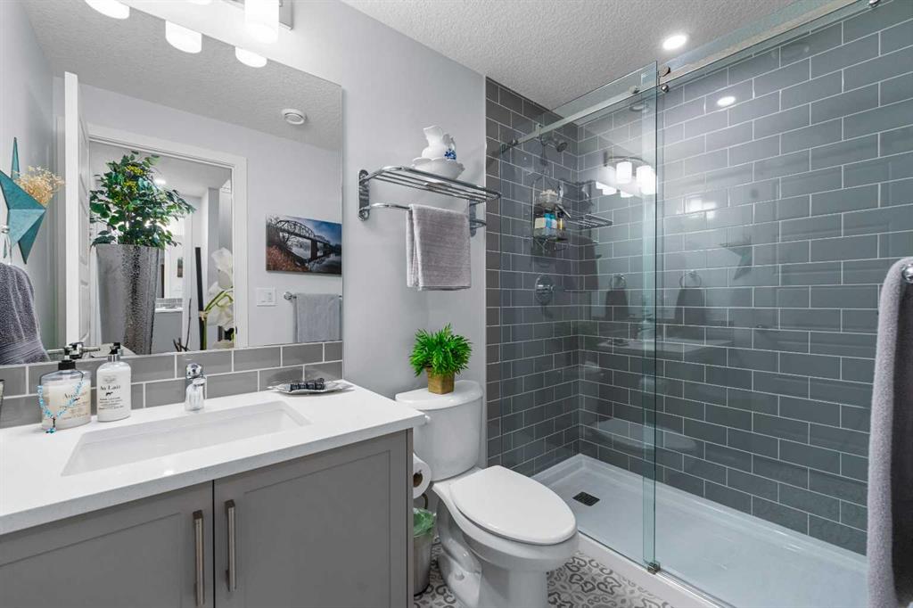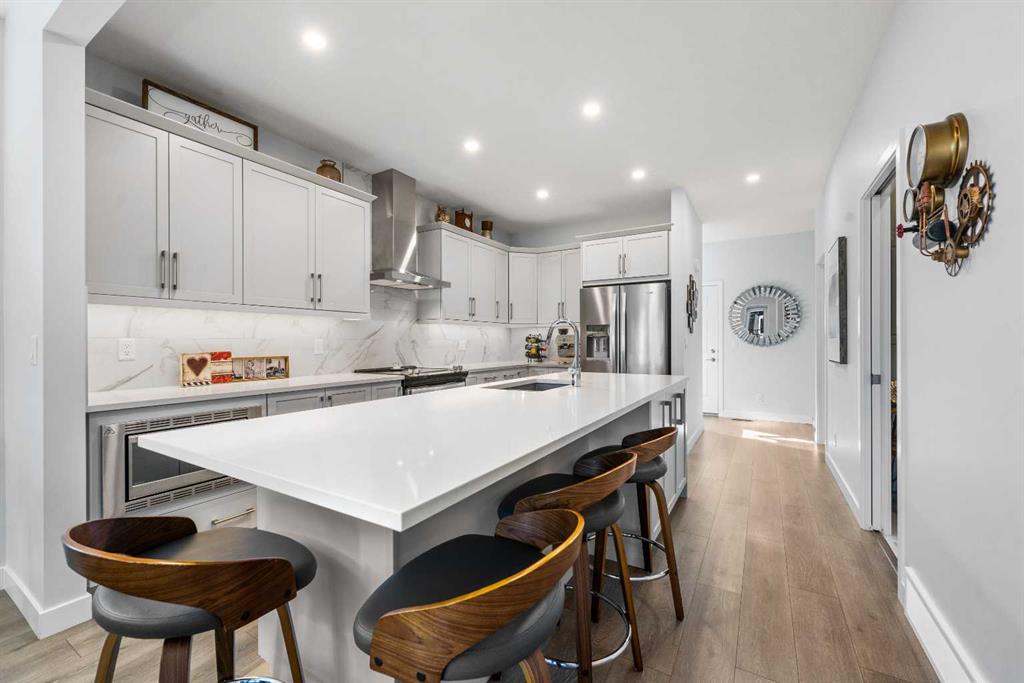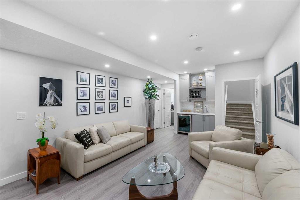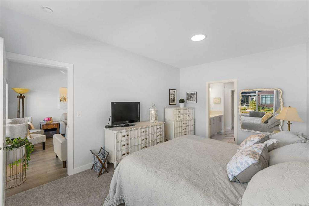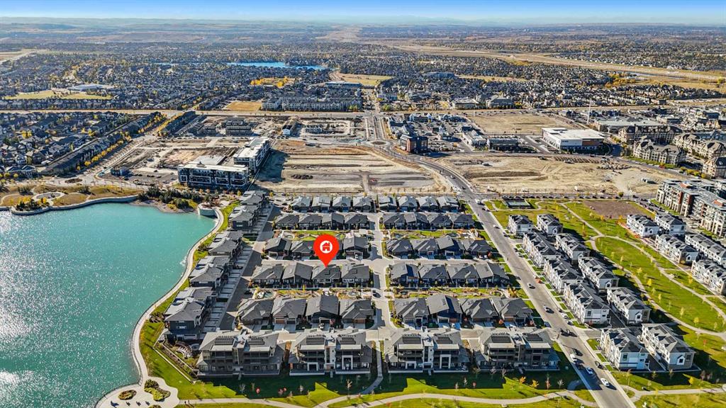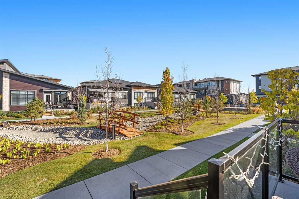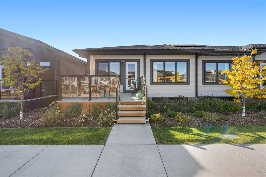 Welcome to THE STREAMS of Mahogany, a must-see lakeside complex community where everyday living feels elevated. Perfectly positioned directly on to the center park, this 3 bedroom bungalow duplex is set within a quiet and picturesque lake community offering an exceptional walking score. Scenic pathways, neighbourhood paths, and lush green spaces surround the home, while shops, services, and amenities are all just steps away. One of the most alluring features of this home is its peaceful setting and sun-filled mornings. Natural light pours in as the day begins, making coffee on the deck a refreshing daily ritual. The thoughtfully designed landscape and flowing water features enhance the overall vibe, creating a setting that is as calming as it is visually stunning. Inside, the floor plan is immediately inviting, showcasing soaring 9 foot ceilings and a spacious open-concept design. The kitchen is both striking and functional, featuring stone countertops, sleek stainless steel appliances, a large centre island, and an abundance of cabinetry. The living room is warm and welcoming, anchored by a modern electric fireplace and framed by beautiful windows. The primary bedroom is conveniently located off of the family room and offers and unforgettable ensuite that is nothing short of captivating. Dual vanities, a deep soaker tub, a stand-alone glass shower, and a generous walk-in closet. Throughout the home, you’ll appreciate the exceptional number of cupboards and closets; a rare and valuable feature, especially in newer homes. The fully finished lower level adds versatility, offering a large entertainment and recreational space complete with a stylish bar area, effective acoustic insulation, and substantial additional storage. 2 spacious guest bedrooms and a full bathroom make this level ideal for hosting family and friends while maintaining privacy and comfort. Enjoy all the advantages of condo living without the annoyance of condo living – No elevators, noise, or parking frustrations. The double attached garage ensures year-round convenience, while the community’s communal BBQ and gathering areas foster a welcoming sense of connection through neighbourhood events and casual social gatherings. Built with efficiency and sustainability in mind, this home includes solar panels, triple-pane windows, a high-efficiency furnace with MERV 13 filtration, UV-C air purification system, HRV, Navien tankless hot water, dual-zone heating, EV charging rough-in, and Built Green Canada certification — offering modern comfort and long-term peace of mind. This is a lifestyle defined by space, serenity, and sophistication. Welcome home!