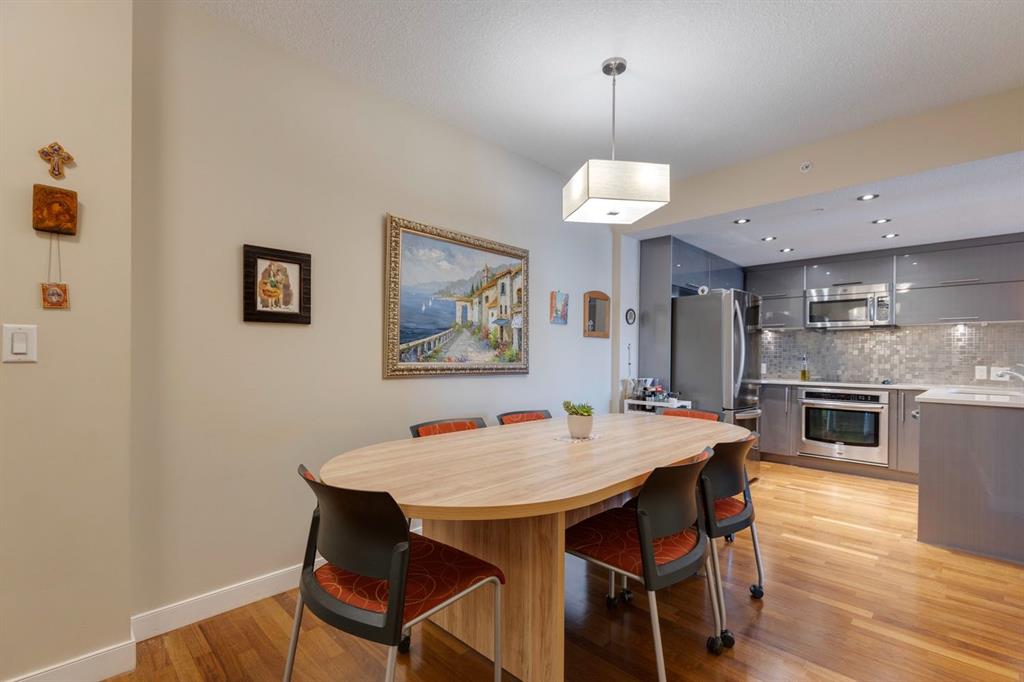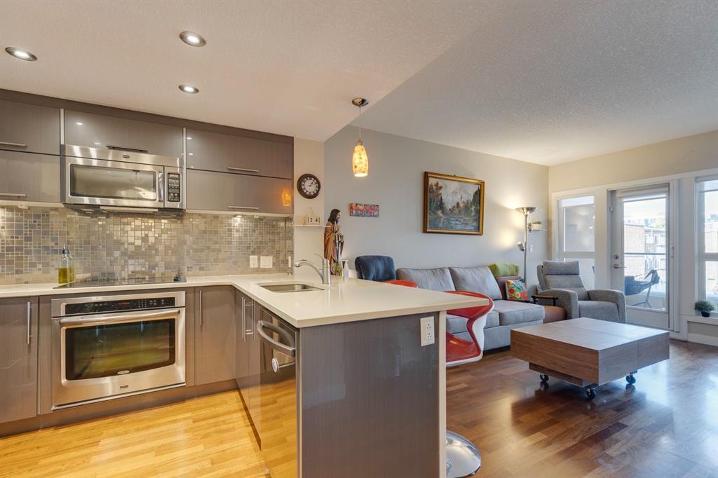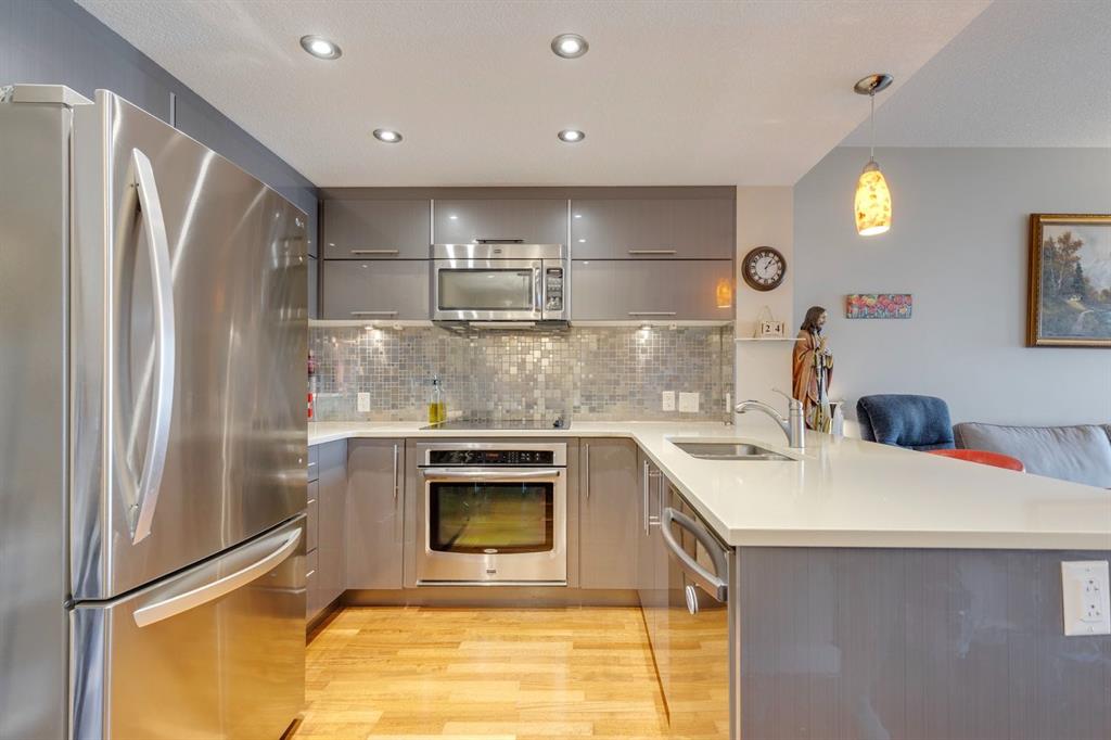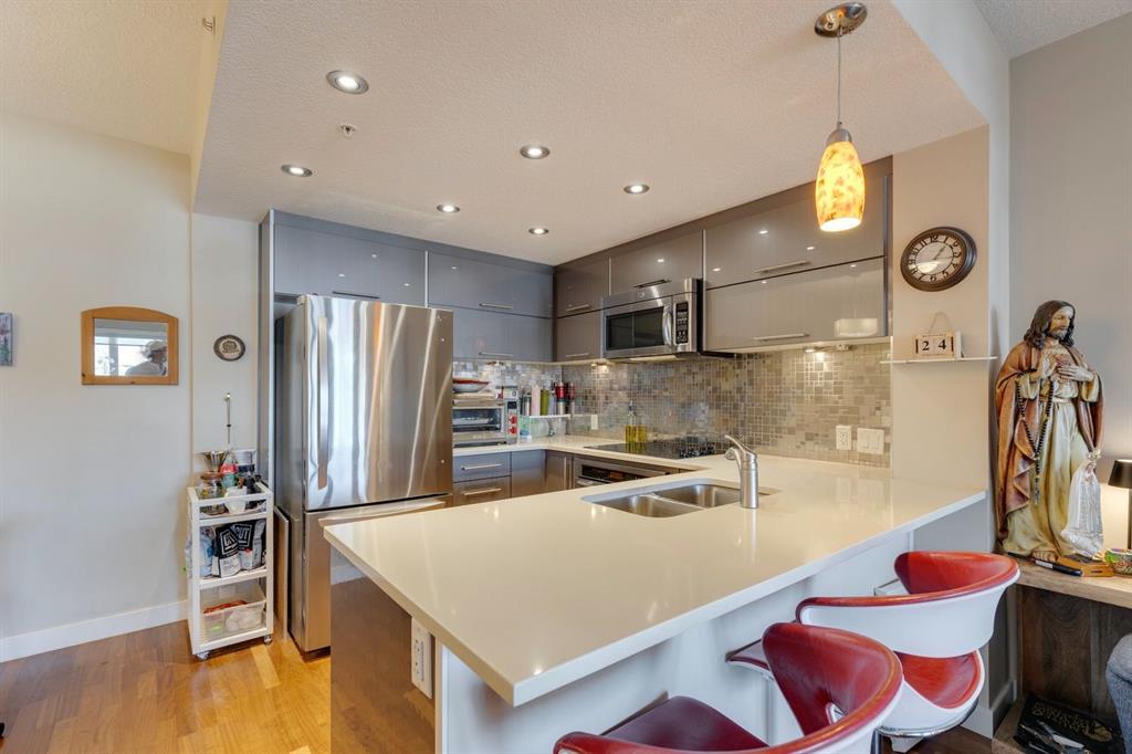 Discover the perfect blend of urban energy and everyday comfort in this beautifully designed 1-bedroom, 1-bathroom condo, ideally situated in the vibrant community of Hillhurst. Just steps from the iconic Kensington district, this home puts Calgary’s best shopping, dining, and culture at your doorstep while still offering the peace and privacy of your own retreat. Wake up with a coffee from your favourite local café, stroll or bike the scenic Bow River pathways, and walk to downtown in minutes. Inside, you’ll be welcomed by an open concept layout filled with natural light from oversized windows. The modern kitchen is both stylish and functional, featuring quartz countertops, warm wood cabinetry, stainless steel appliances, and a peninsula with bar seating; perfect for casual entertaining. The living and dining areas flow seamlessly, making the most of every square foot. Whether it’s morning coffee, afternoon lounging, or evening drinks, the convenient balcony truly elevates your lifestyle. The spacious bedroom offers a serene escape with large windows a walk-in closet and 4pc ensuite. Additional conveniences include in-suite laundry, a titled underground parking stall, and a dedicated storage locker for all your seasonal items. The secure, well managed St. John’s on Tenth building offers bike storage, visitor parking, and optional additional underground spots through ParkPlus. With street level retail, a walkable community, and an unbeatable location, this home captures the essence of inner-city living. Whether you’re a first-time buyer, looking to downsize, or investor, this is more than just a condo, it’s a lifestyle opportunity you don’t want to miss. Book your private showing today and experience the best of Kensington living.