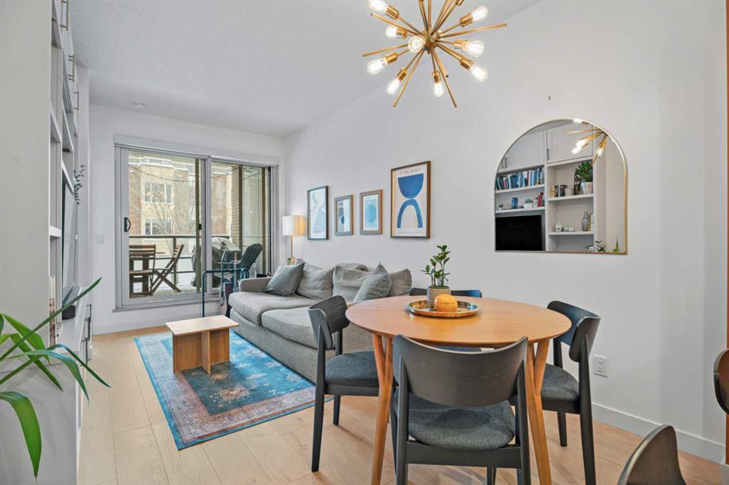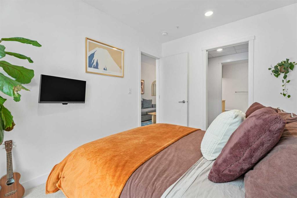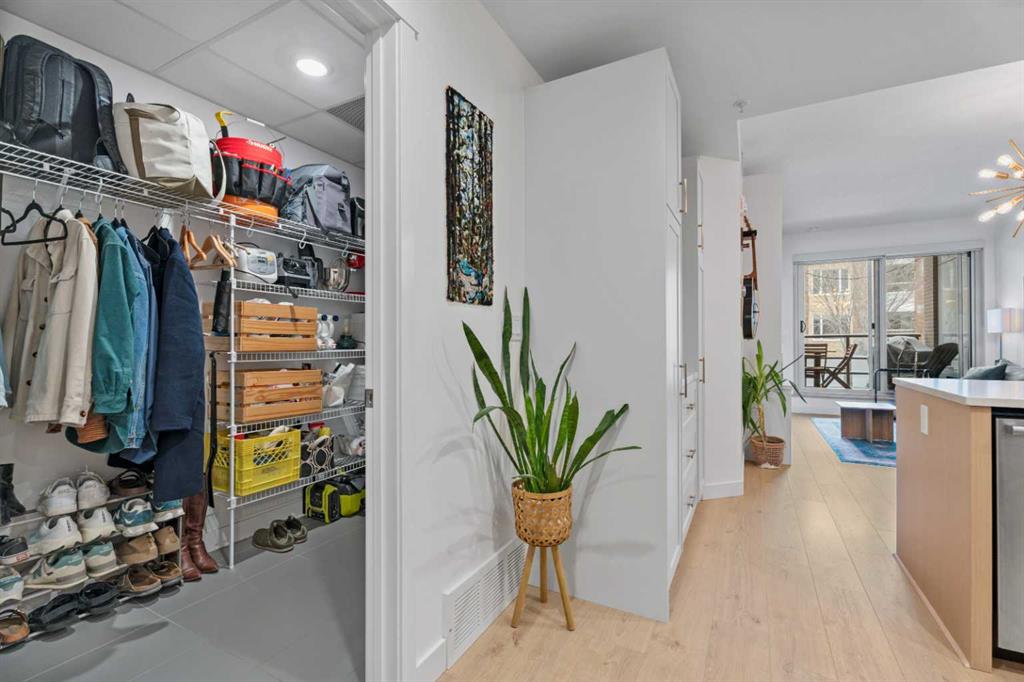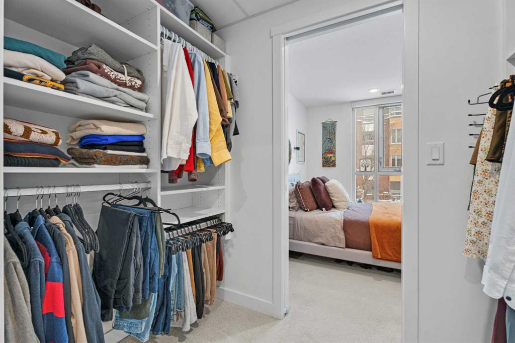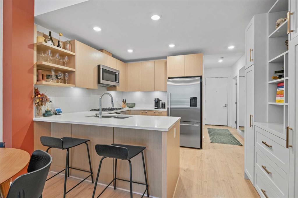 OPEN HOUSE 3-5pm SUNDAY April 19 – Welcome to Radius, an amenity-rich building offering something for every lifestyle, located in the desirable neighbourhood of Bridgeland. This spacious and extensively upgraded 2-bedroom, 2-bathroom unit features modern finishes and a bright, inviting atmosphere with a soft contemporary design. The well-appointed kitchen includes a built-in oven, gas range, ample counter space, and quality appliances, flowing seamlessly into the open-concept dining and living area complete with beautiful custom built-ins for storage and media. The generously sized primary bedroom offers a walk-in closet with California Closets organizers and a stylish ensuite with automatic floor lighting, a large vanity, and a walk-in shower. The versatile second bedroom is equipped with built-in storage and a Murphy bed with integrated desk attachments, making it ideal for guests or a functional home office. Additional highlights include a rare oversized in-suite storage and laundry room, along with a well-appointed 4-piece main bathroom. Residents enjoy access to exceptional building amenities including concierge and the main gym (1st floor), delivery room (2nd floor), secondary gym (3rd floor), yoga/barre room (4th floor), spin room (5th floor), rooftop patio and gardens with stunning city views (7th floor), dog wash station and bike storage (P1). This unit also comes with titled underground parking, and a dedicated storage room, offering convenience and comfort in one of Calgary’s most vibrant communities.
