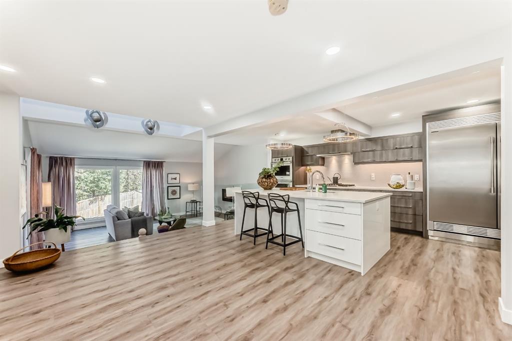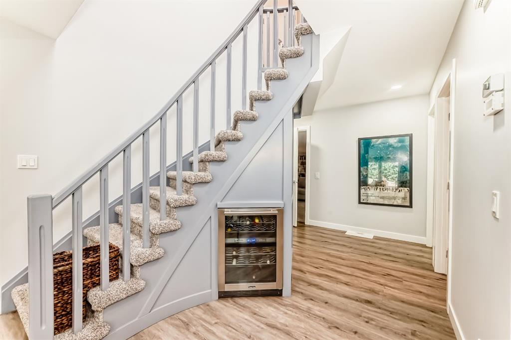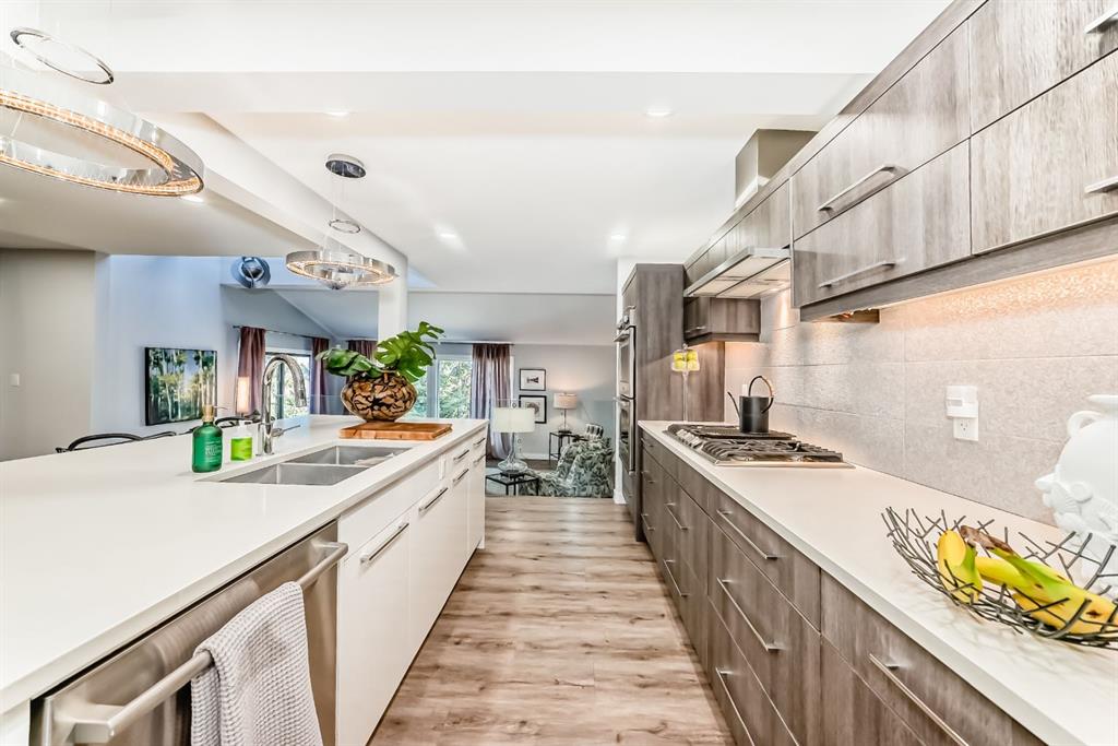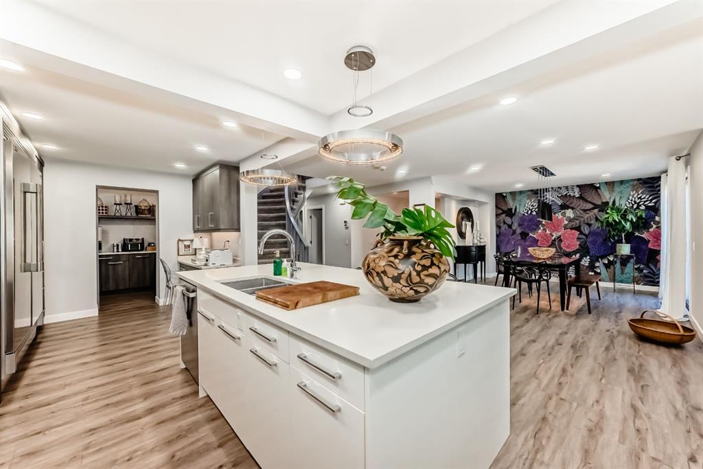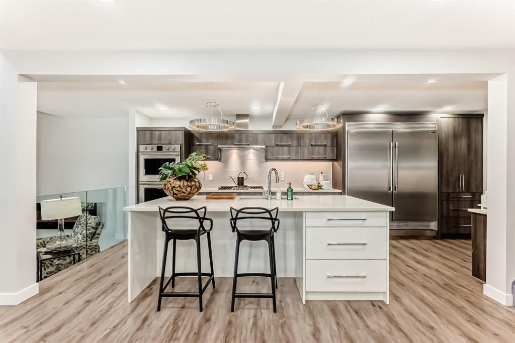 The standout chef’s kitchen offers expansive cabinetry, quartz countertops, premium appliances, a full-size fridge and freezer, gas cooktop, double wall ovens, and a fully equipped spice kitchen with an additional fridge and dishwasher—perfect for hosting. The walk in pantry gives lots of storage for kitchen devices and food. You usually only see this type of kitchen in a million dollar home. The main floor showcases a bright, open-concept layout with a sunken living room, feature fireplace, glass railings, and a spacious dining area, all framed by oversized windows that bring in plenty of natural light.
