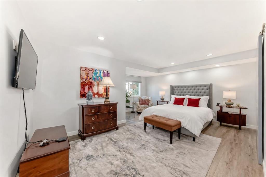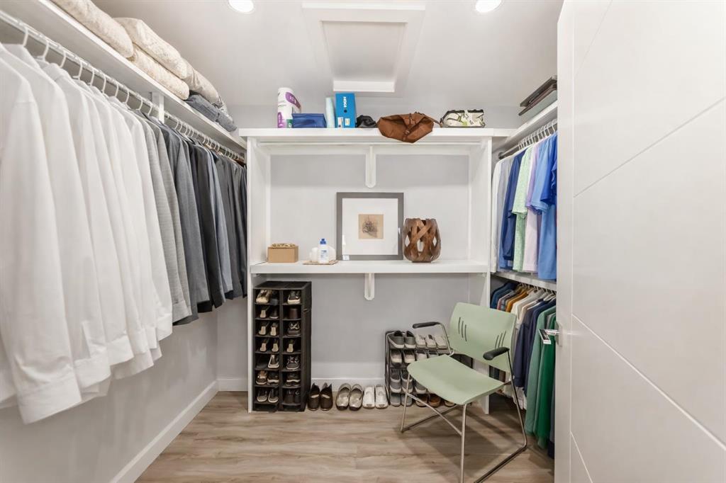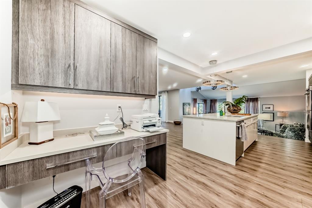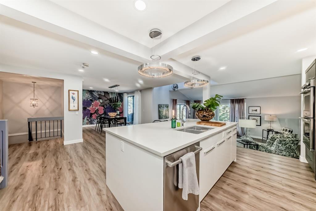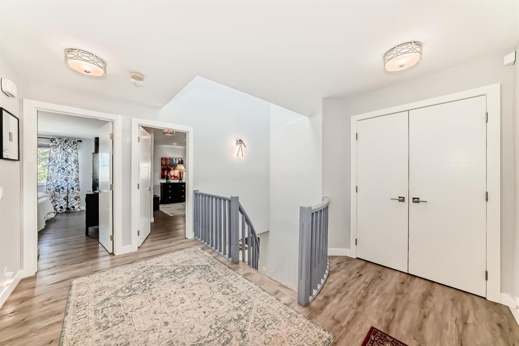 The standout chef’s kitchen offers expansive cabinetry, quartz countertops, premium appliances, a full-size fridge and freezer, gas cooktop, double wall ovens, and a fully equipped spice kitchen with an additional fridge and dishwasher—perfect for hosting. The walk in pantry gives lots of storage for kitchen devices and food. You usually only see this type of kitchen in a million dollar home. The main floor showcases a bright, open-concept layout with a sunken living room, feature fireplace, glass railings, and a spacious dining area, all framed by oversized windows that bring in plenty of natural light.