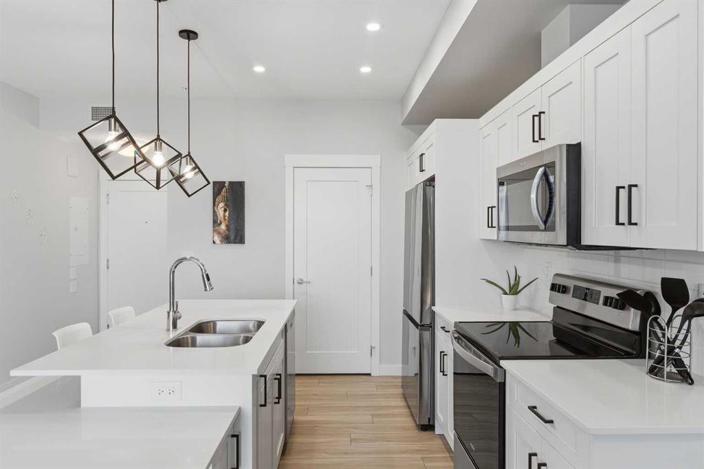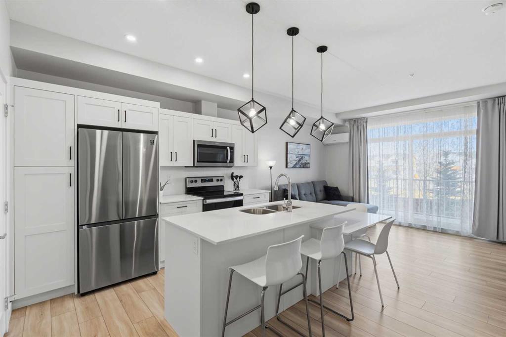 MODERN CONDO LIVING at it’s best in the highly desirable LAKE COMMUNITY of Auburn Bay! DON’T MISS OUT on this stunning 2 bed/2 bath with loads of UPDATES, including AIR CONDITIONING, underground TITLED PARKING, and a storage locker. PRIME LOCATION only steps away from shopping, restaurants, groceries, and all your local amenities… including NO NEIGHBORS behind you! Highlights of this immaculate unit include a bright & open layout, a modern light color design theme, updates to flooring | lighting | gas line | kitchen & bathroom undermount sinks | AC unit, QUARTZ counters, PANTRY storage, and loads more! This larger unit layout offers more width and length for the living spaces, allowing a more spacious feel. The luxury level of finishing shines throughout, with stunning kitchen and bathroom designs. There are 2 large bedrooms each with access to a bathroom, and a large balcony for your summer retreat. The complex has multiple outdoor spaces with benches all around. The storage locker is conveniently located in front of the underground parking stall. Enjoy the lake amenities all year around and the local conveniences that are only steps away! Come see this one before it’s gone!