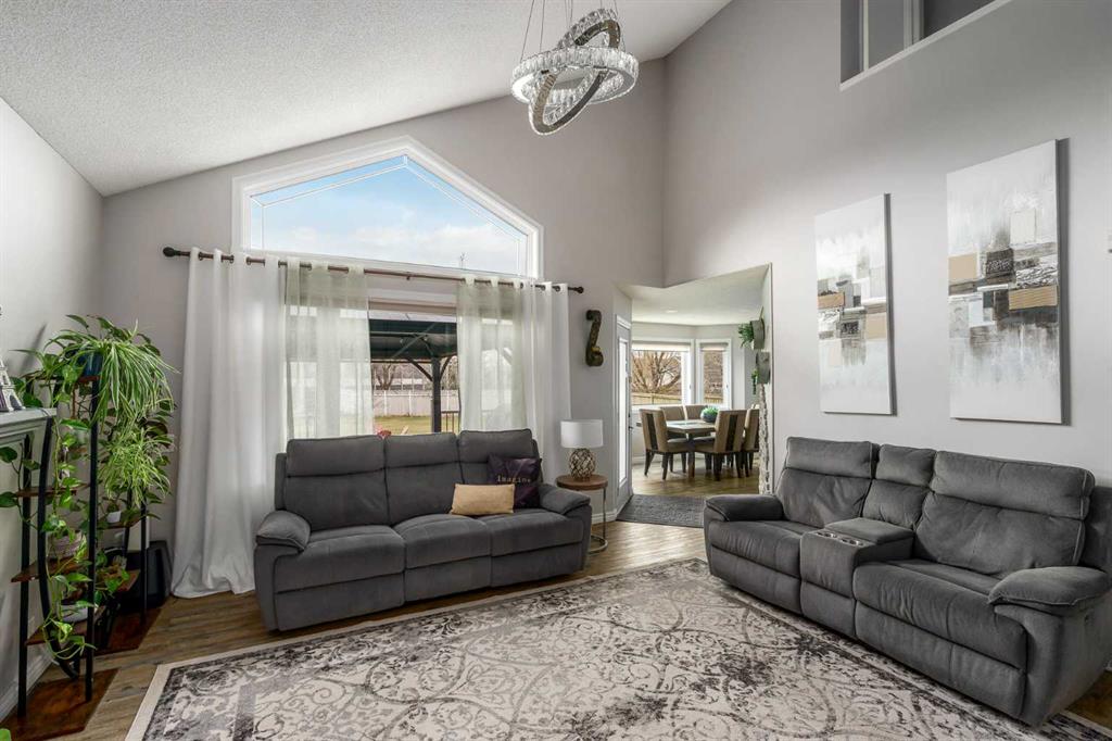 featuring a large composite deck with a gazebo, leading to a custom stamped concrete keyhole fireplace area perfect for entertaining or private relaxation. This property offers nearly 2,300 sq ft of fully developed living space, including a fully finished basement with a bedroom and ensuite. Inside, you’ll find a fully renovated kitchen that elevates the entire home. The living room welcomes you with a soaring vaulted ceiling and large windows, filling the space with natural light and creating an open, airy feel, anchored by a striking stone-faced fireplace feature wall. The dining area overlooks the expansive backyard, featuring a mature apple tree, beautifully maintained flower beds and raspberry bushes creating a peaceful and scenic setting.