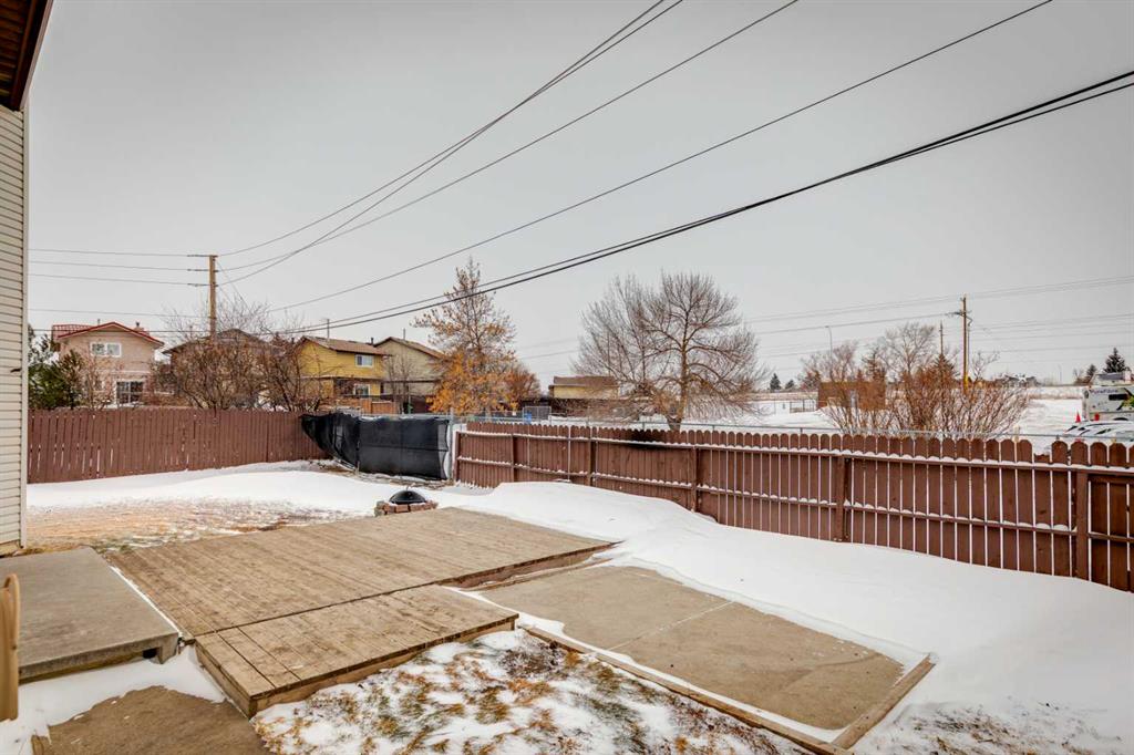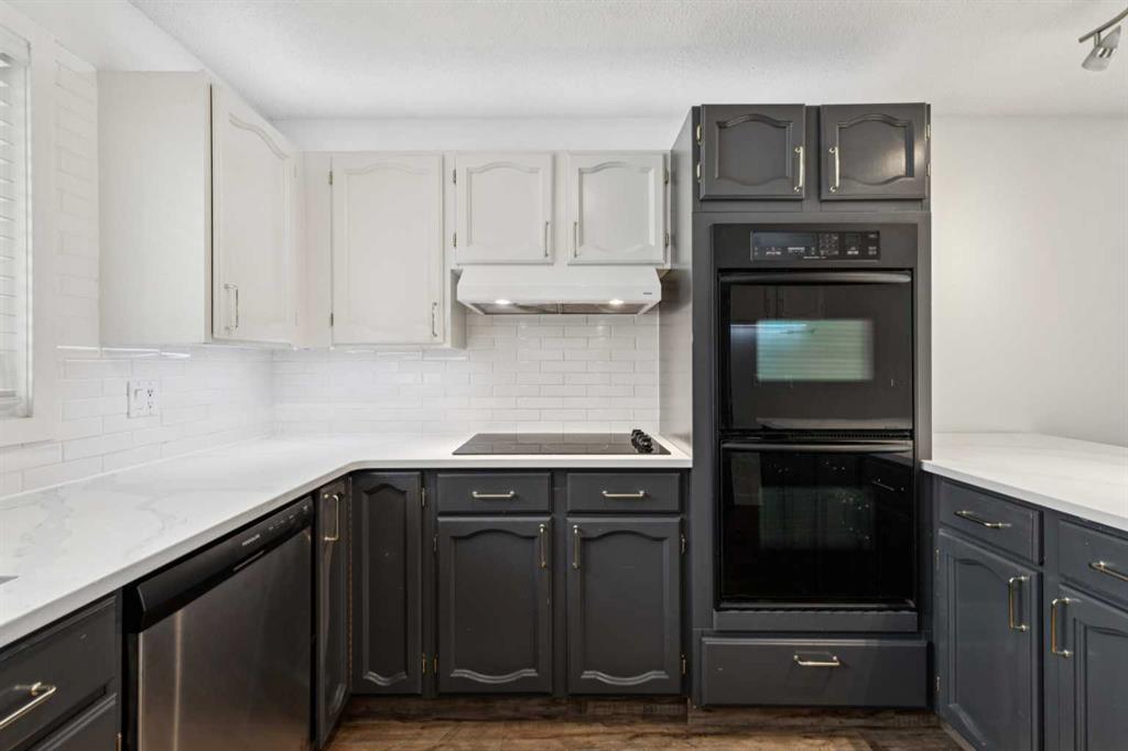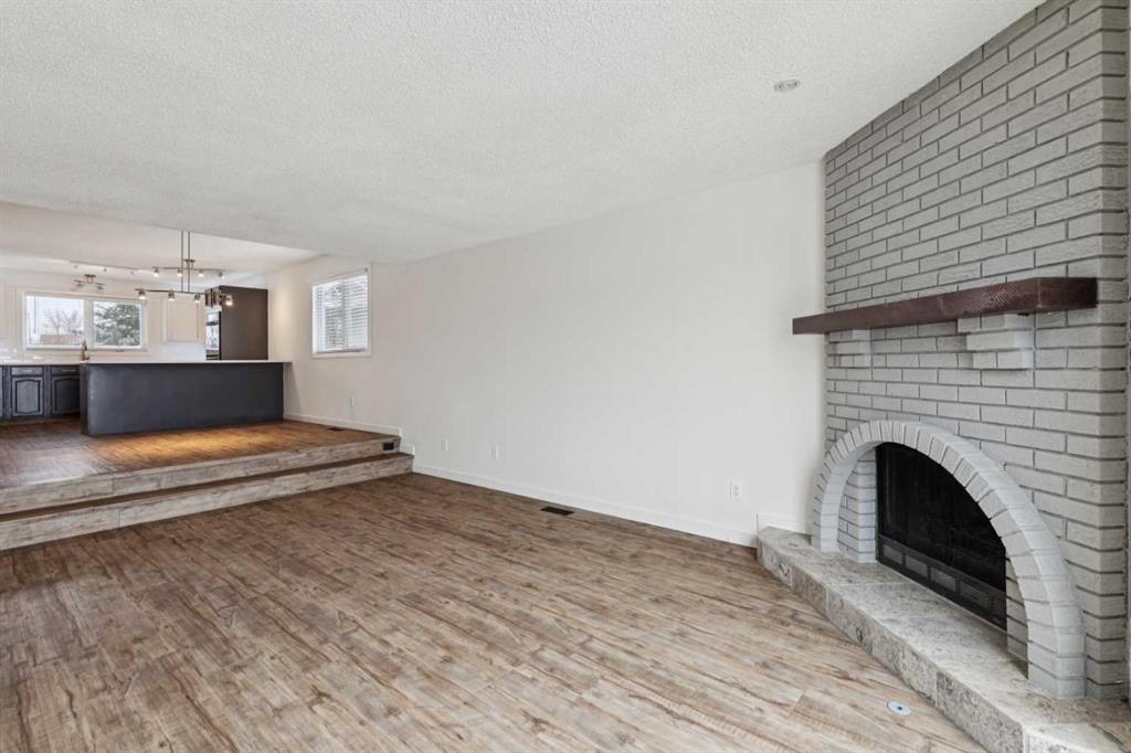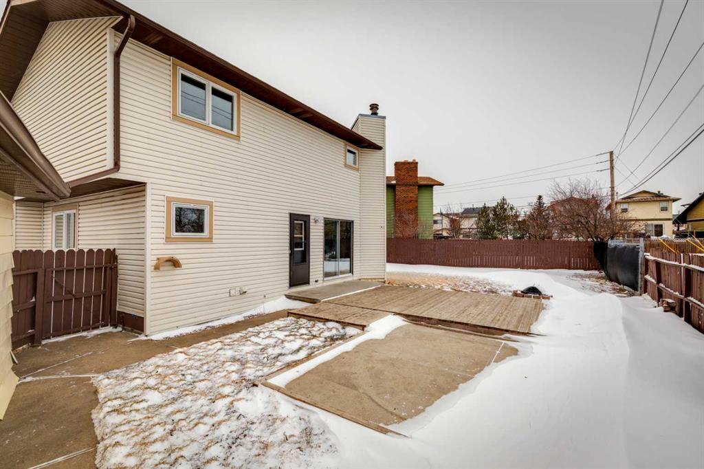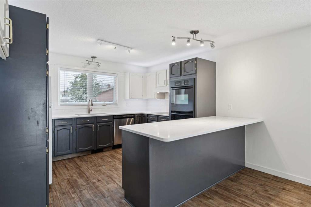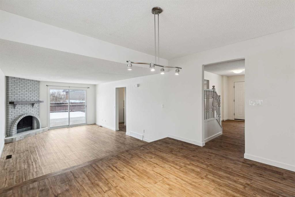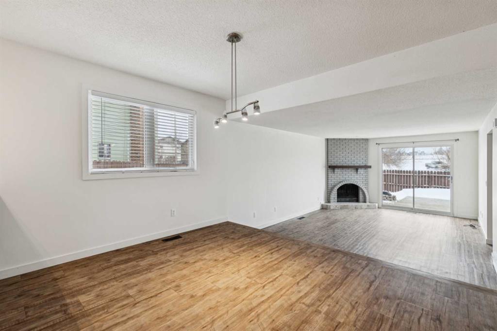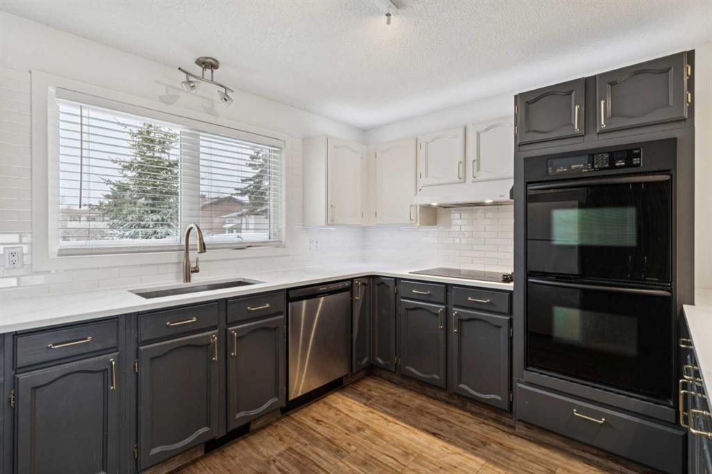 As you step into the home, you are greeted by a functional front entryway featuring a convenient closet for easy jacket and shoe storage. The foyer opens immediately into an expansive living room, where a large bay window floods the space with an abundance of natural light. The main floor transitions seamlessly into the open-concept dining area and kitchen, tied together by durable, vinyl-plank flooring. The modernized kitchen is a chef’s delight, showcasing a stylish two-toned cabinet design—crisp white uppers paired with deep blue lowers. This space is fully equipped with an electric cooktop, built-in double oven, and a sleek white refrigerator, all framed by elegant white quartz countertops and a subway tile backsplash. A unique multi-level design leads down to an additional living space, anchored by a classic brick-surround fireplace and sliding glass doors that provide direct access to the rear deck. Moving to the upper level, a classic white spindle staircase leads to the private bedrooms. The primary suite is notably spacious, easily accommodating a king-sized bed and complimented by a 3 pc ensuite, while the additional bedrooms feature large windows and updated closet doors, making them perfect for children’s rooms or a home office. These rooms share a clean, modern 4-piece bathroom with updated fixtures. The lower level offers even more versatility with a finished basement featuring plush carpeting, perfect for a media room or home gym. You’ll also find a secondary room offering great flexibility for a home office or guest space. Outside, the property features a fully fenced backyard with a spacious deck, ideal for summer gatherings, leading to the detached garage for secure parking and extra storage. Benefits continue with a back gated fence perfect for RV storage! Located in the heart of the established community of Temple, this home is just minutes away from everything a family needs. You are within walking distance to multiple schools, including Annie Foote and Father Scollen, as well as local parks and the Temple Community Association. With quick access to Stoney Trail and McKnight Blvd, plus the nearby Village Square Leisure Centre and Sunridge Mall, this location perfectly balances quiet residential living with city convenience.