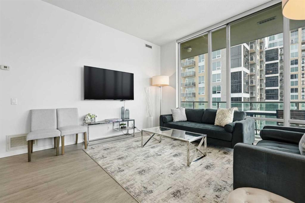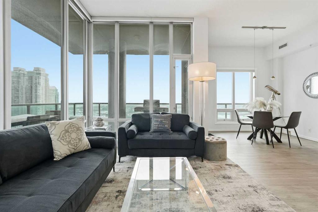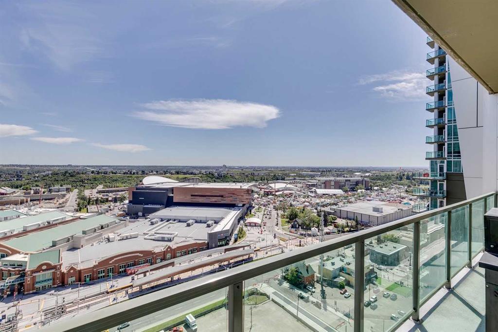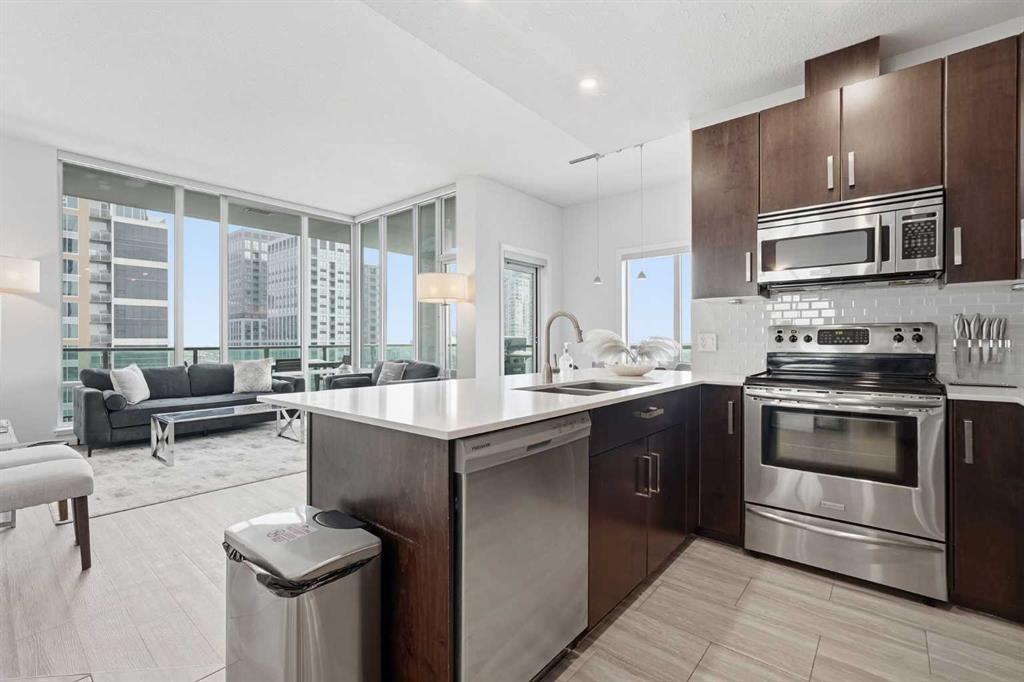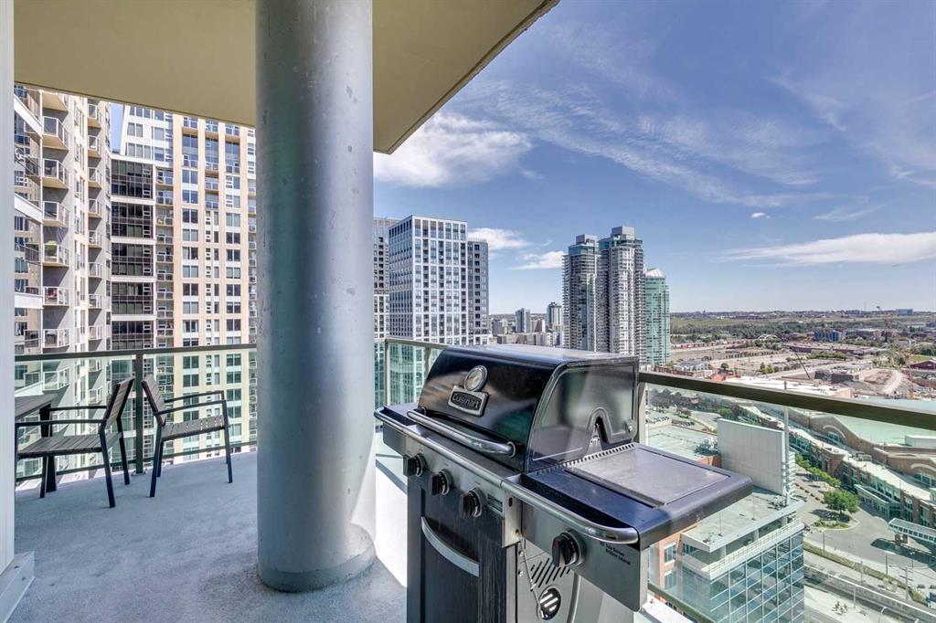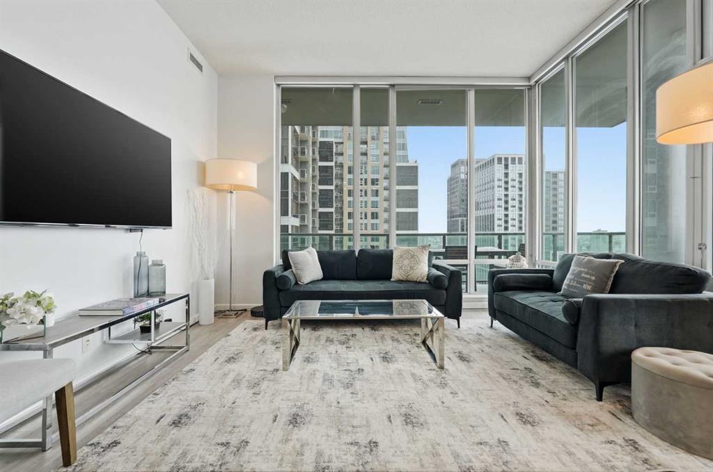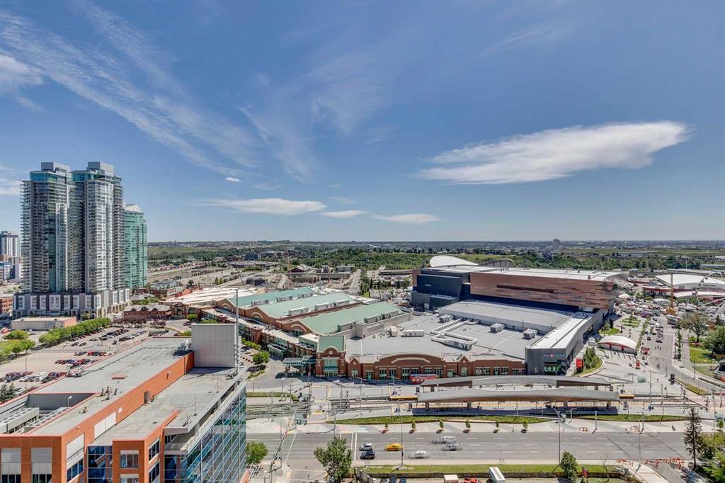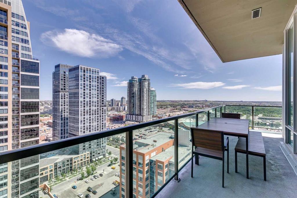 Rare Turnkey Opportunity on the 22nd Floor of Sasso with Stunning Bird’s-Eye Views of Stampede Park & Downtown! Just move in and enjoy — all furniture is included in this beautifully appointed 2-bedroom, 2-bathroom corner unit, offering over 1,200 sq ft of living space with incredible north, east, and downtown views. The open-concept floor plan features brand new laminate flooring, high ceilings, and floor-to-ceiling windows that flood the space with natural light. The updated kitchen is stylish and functional, boasting refreshed quartz countertops, a peninsula with eating bar, subway tile backsplash, ample storage, and stainless steel appliances. The kitchen flows seamlessly into the spacious living and dining areas — perfect for entertaining — and a built-in computer desk provides an ideal work-from-home nook. The primary suite offers a walk-through closet with custom built-ins and a luxurious 5-piece ensuite complete with dual sinks, a jetted tub, and a separate shower. The second bedroom, featuring a custom wood closet, is conveniently located next to a 3-piece bath — perfect for guests. Step outside to the massive wrap-around balcony and take in the panoramic views of Stampede Park, the city skyline, and downtown Calgary — truly a spectacular vantage point. Additional highlights include in-suite laundry, a large ground-floor storage locker, and one titled corner underground parking stall. Residents of Sasso enjoy first-class amenities, including concierge service, fully equipped fitness room, recreation room with pool table & fireplace, hot tub, sauna and movie theatre. All this in an unbeatable central location — walking distance to Stampede Park, MNP Community & Sport Centre, Elbow River pathways, cafes, restaurants, 17th Avenue nightlife, public transit, and downtown. Don’t miss this rare chance to own a move-in-ready home in one of Calgary’s most desirable buildings!