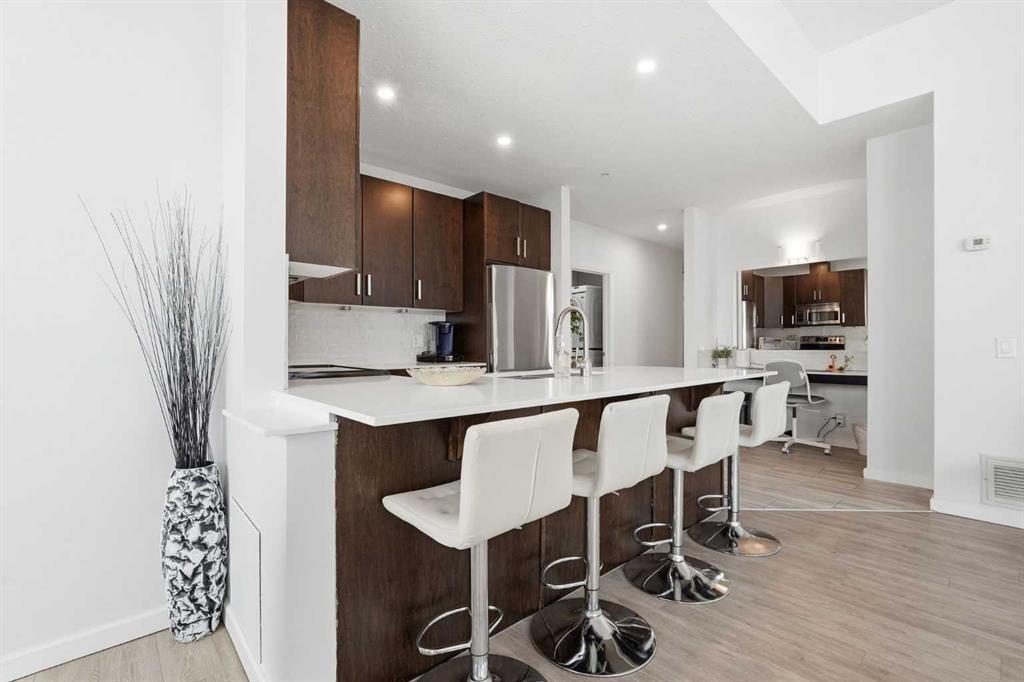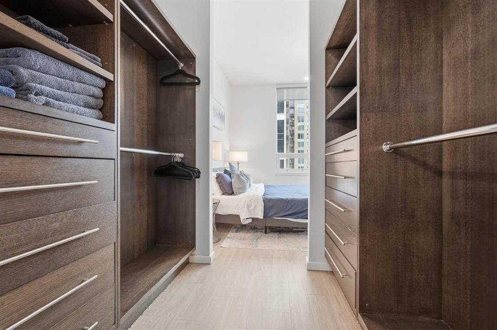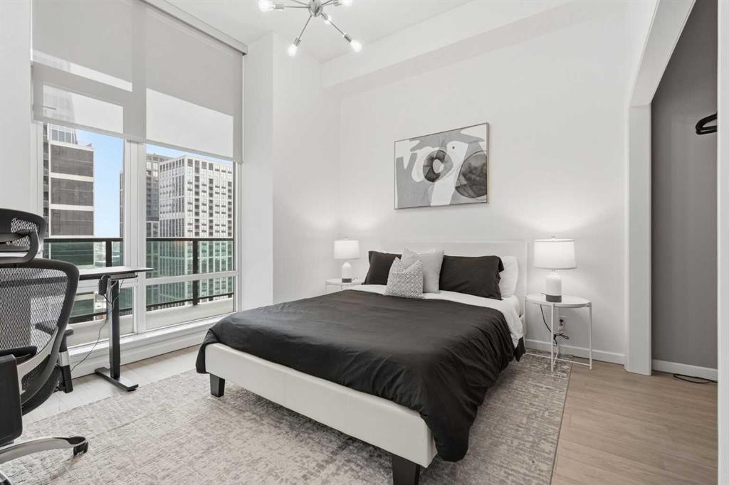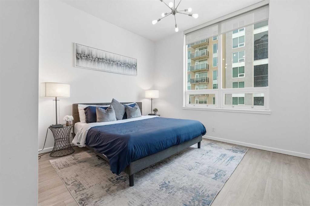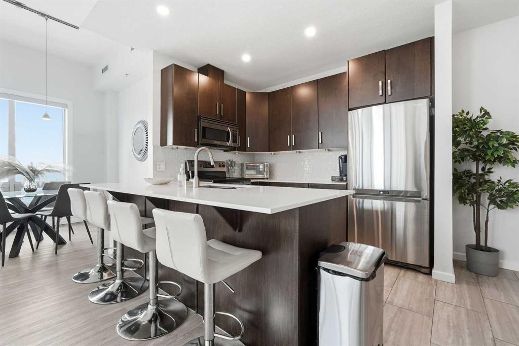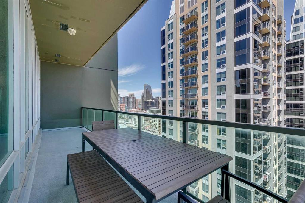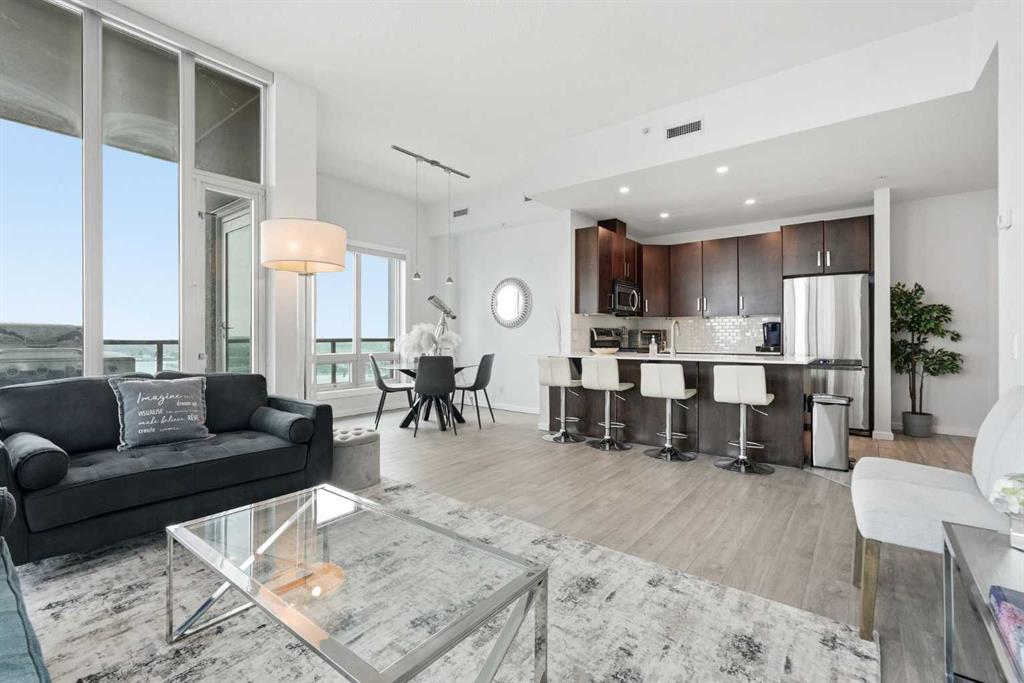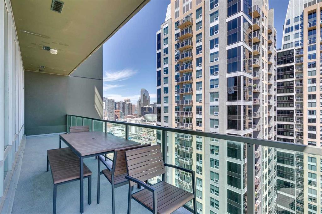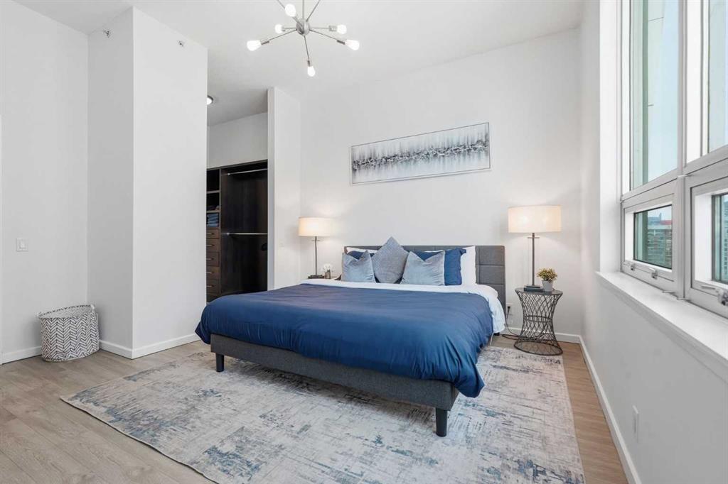 Rare Turnkey Opportunity on the 22nd Floor of Sasso with Stunning Bird’s-Eye Views of Stampede Park & Downtown! Just move in and enjoy — all furniture is included in this beautifully appointed 2-bedroom, 2-bathroom corner unit, offering over 1,200 sq ft of living space with incredible north, east, and downtown views. The open-concept floor plan features brand new laminate flooring, high ceilings, and floor-to-ceiling windows that flood the space with natural light. The updated kitchen is stylish and functional, boasting refreshed quartz countertops, a peninsula with eating bar, subway tile backsplash, ample storage, and stainless steel appliances. The kitchen flows seamlessly into the spacious living and dining areas — perfect for entertaining — and a built-in computer desk provides an ideal work-from-home nook. The primary suite offers a walk-through closet with custom built-ins and a luxurious 5-piece ensuite complete with dual sinks, a jetted tub, and a separate shower. The second bedroom, featuring a custom wood closet, is conveniently located next to a 3-piece bath — perfect for guests. Step outside to the massive wrap-around balcony and take in the panoramic views of Stampede Park, the city skyline, and downtown Calgary — truly a spectacular vantage point. Additional highlights include in-suite laundry, a large ground-floor storage locker, and one titled corner underground parking stall. Residents of Sasso enjoy first-class amenities, including concierge service, fully equipped fitness room, recreation room with pool table & fireplace, hot tub, sauna and movie theatre. All this in an unbeatable central location — walking distance to Stampede Park, MNP Community & Sport Centre, Elbow River pathways, cafes, restaurants, 17th Avenue nightlife, public transit, and downtown. Don’t miss this rare chance to own a move-in-ready home in one of Calgary’s most desirable buildings!
