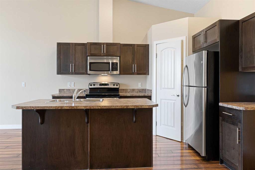 Immaculate 2 bedroom, 2 bath condo offering over 1,100 sq ft of modern living space in the desirable Evergreen SW community. This bright and well-maintained home features dark laminate floors, a spacious Master suite with a walk-in-closet and 4-piece ensuite bath. The second bedroom is ideal as a guest room or home office, with an additional 4-piece bathroom nearby. Enjoy the sun-filled living room with large windows and access to a private balcony to enjoy BBQ with friends or just relaxing evening coffee. . The dining area boasts vaulted ceilings, while the kitchen offers a center breakfast island, corner pantry and stainless steel appliances. Additional highlights include in-suite laundry, two parking stalls, and condo fees that include heat, water and sewer. Conveniently located with shops adjacent to the complex, and close to shopping, schools, parks and the scenic Stoney Trail. You will not be disappointed!