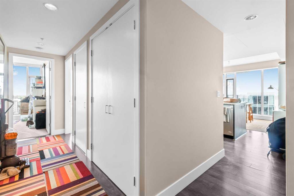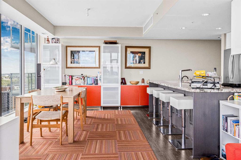 Experience luxury living in this 2 bed, 2 bath condo at the iconic Evolution in East Village. Enjoy breathtaking panoramic views of the Bow River and Calgary’s sparkling skyline through floor-to-ceiling windows. It features floor-to-ceiling windows with views of the city, chef’s kitchen with gas range, granite counters, central air conditioning and ensuite. Enjoy a spacious balcony with amazing Views. This unit comes with storage locker, and premium amenities including 24 hours security/concierge services, fitness centre, sauna, and BBQ area. Steps away from Studio Bell, grocery stores, RiverWalk, LRT, Library, and top restaurants.Your dream lifestyle awaits — book your private tour today and experience “Luxury Living Above It All” in East Village.