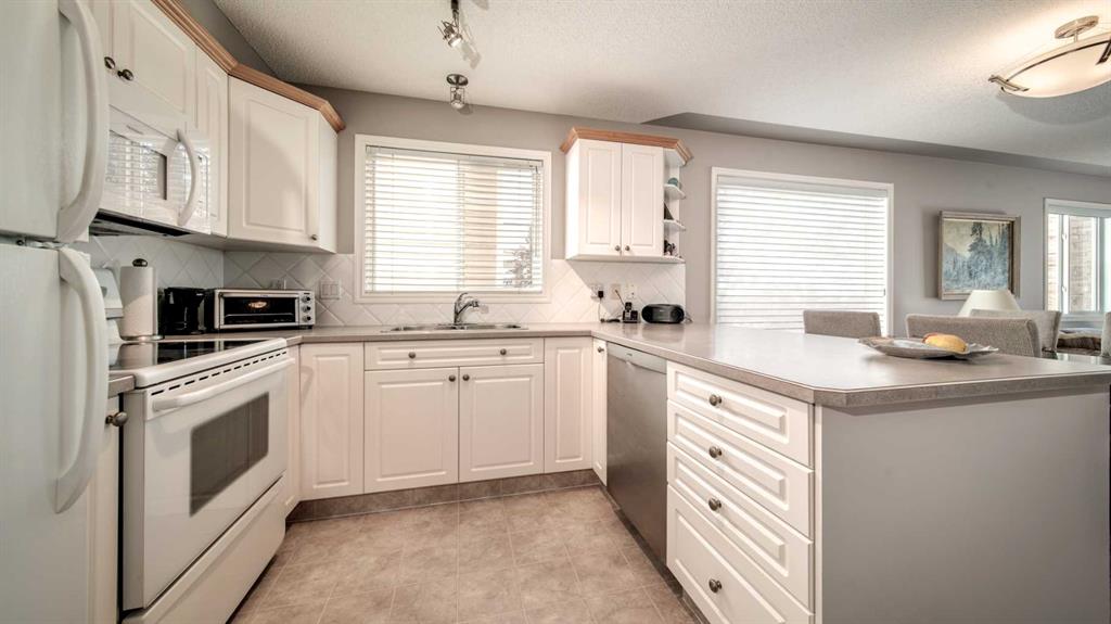 Unbeatable value in this fabulous 2 bedroom, 2 full baths, end unit in Mountain View Terrace in Springbank Hill! Meticulously maintained, this bright and open corner unit is inviting and perfect for entertaining, offering, a spacious living/dining room with corner gas fireplace and open to a sparkling, white kitchen with ample cupboard and counter space. The master bedroom is complimented by a generous walk-in closet and huge 4-piece ensuite. The second bedroom is conveniently located on the other side of the unit providing privacy and ease of access to main bath. New stacked washer and dryer (2024) and new microwave hood cover (2025)! Enjoy a large, south facing deck including exterior storage room, in-suite laundry and a secured underground, titled parking stall with additional caged storage in front of stall. Perfect location! A wonderful place to call home!
