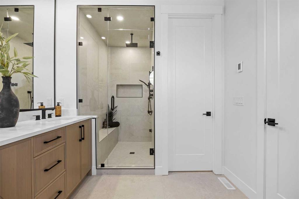Upstairs, the primary suite is a true retreat, distinguished by vaulted ceilings and a statement white oak beam that adds warmth and architectural character. The spa-inspired 5-piece ensuite is beautifully appointed with dual vanities, full-height tile, a standalone soaker tub, and a custom steam shower with bench, while the spacious walk-in closet is complete with built-in organizers. Two additional generously sized bedrooms, a beautifully finished 4-piece bath, and an upper laundry room complete the second level with both style and practicality.