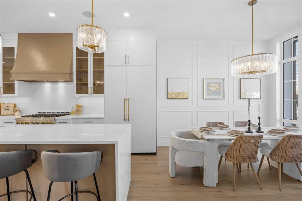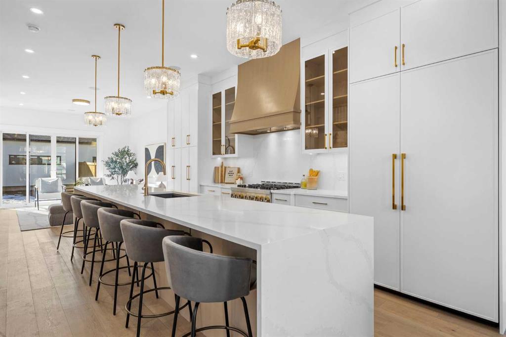 Inside, the home showcases an impressive sense of scale and elegance, with 10-foot ceilings on the main floor, rich engineered hardwood flooring, and a seamless open-concept layout tailored for both everyday living and upscale entertaining. The dining area flows effortlessly into the showpiece kitchen, where full-height custom cabinetry, built-in JennAir appliances, a pantry with pull-out drawers, and an extraordinary 12-foot waterfall island create a space that is both stunning and highly functional.