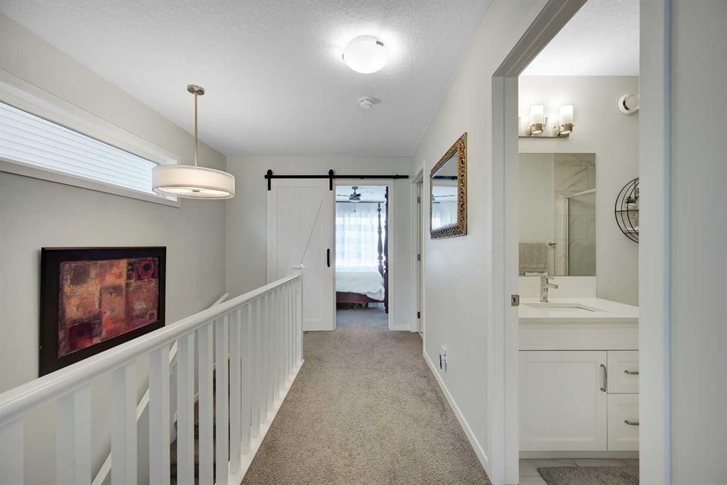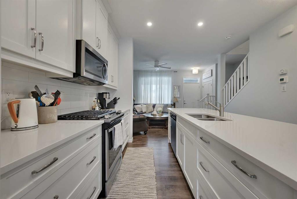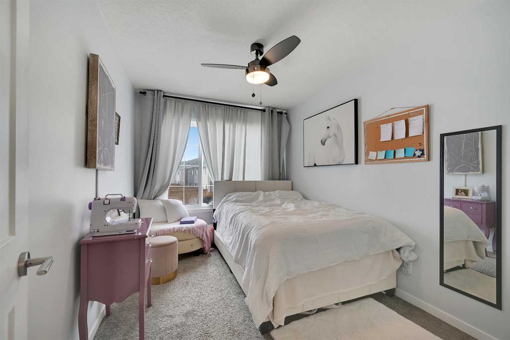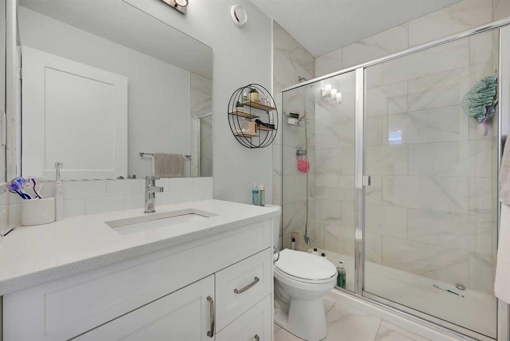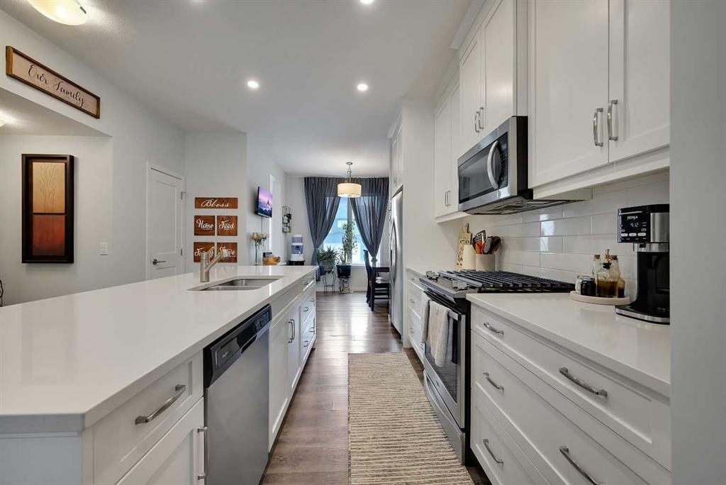 Step inside to an airy and spacious main floor highlighted by 9-foot ceilings, rich luxury vinyl plank flooring, and large triple-pane windows that flood the home with natural light. A charming faux fireplace creates a cozy focal point for relaxing evenings. The upgraded kitchen is a true showstopper, featuring a 9-foot quartz island, floor-to-ceiling shaker-style cabinetry, stainless steel appliances, and a gas range. Soft-close cabinetry and a walk-in pantry provide both style and functionality. The main floor also includes a rear dining area ideal for entertaining and a convenient 2-piece powder room. Upstairs, the spacious primary suite comfortably fits a king-sized bed and includes a walk-in closet and stylish barn door leading to the ensuite, complete with a stand-up shower beautifully tiled to the ceiling. Two additional well-sized bedrooms offer beautiful mountain views, and this level is finished with a 4-piece bathroom and a full laundry room for added convenience. The fully finished lower level provides a versatile family or recreation room, an additional bedroom, and a 4-piece bathroom, making it perfect for guests, extended family, or extra living space. Step outside to enjoy the back deck overlooking the partly fenced backyard, offering plenty of room to relax, entertain, or create your dream outdoor space. Residents of Crossfield enjoy fantastic community amenities including community garden boxes, approximately 4 km of walking trails, 5 acres of protected wetlands, and over 20 acres of green space, along with an outdoor hockey rink, skateboard park, sports fields, stocked fishing pond, splash park, playgrounds, and picnic areas with fire pits.