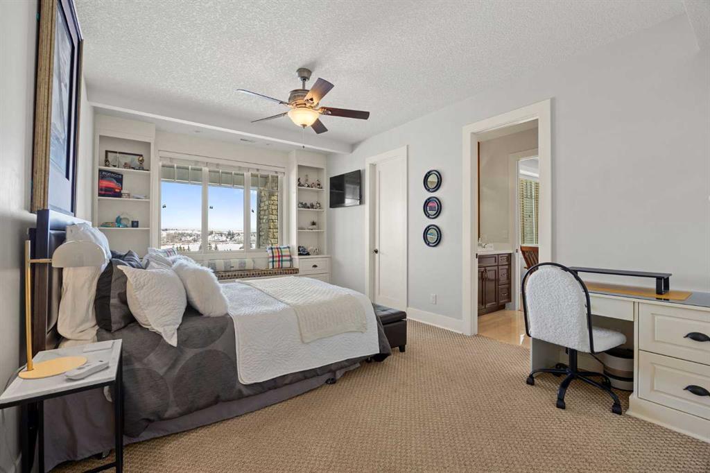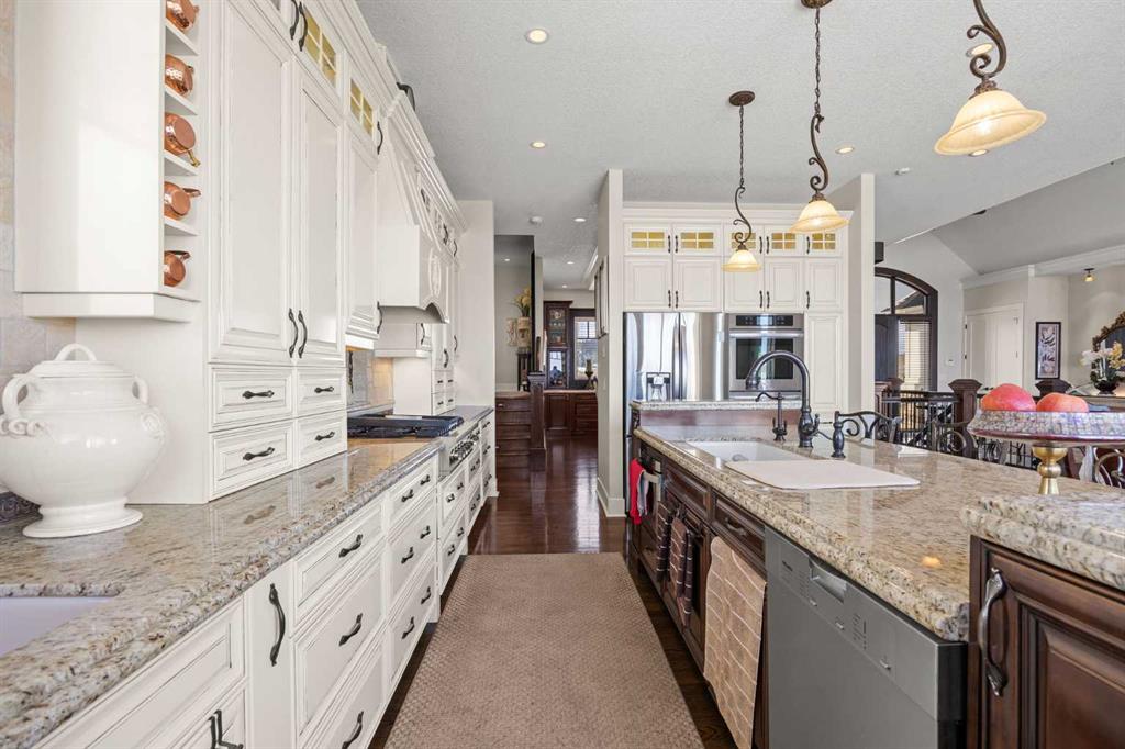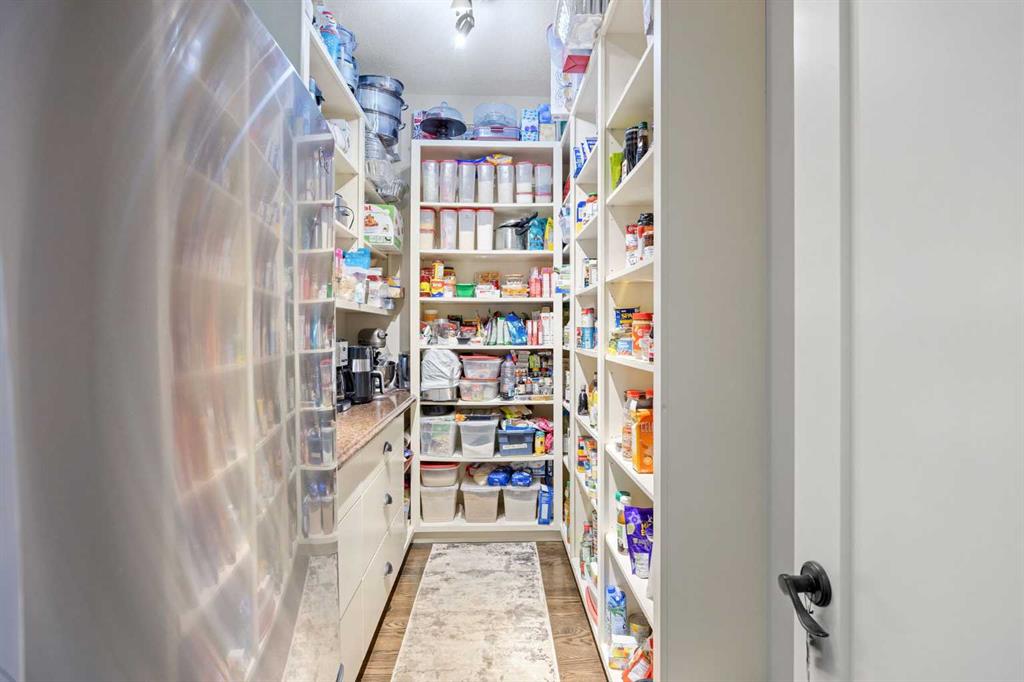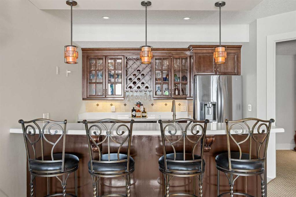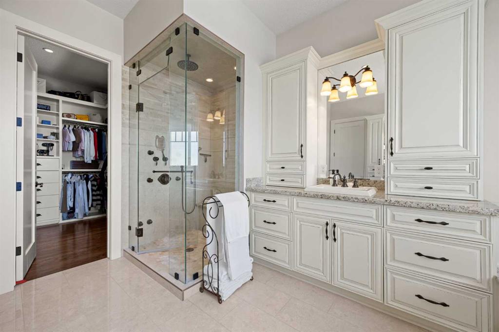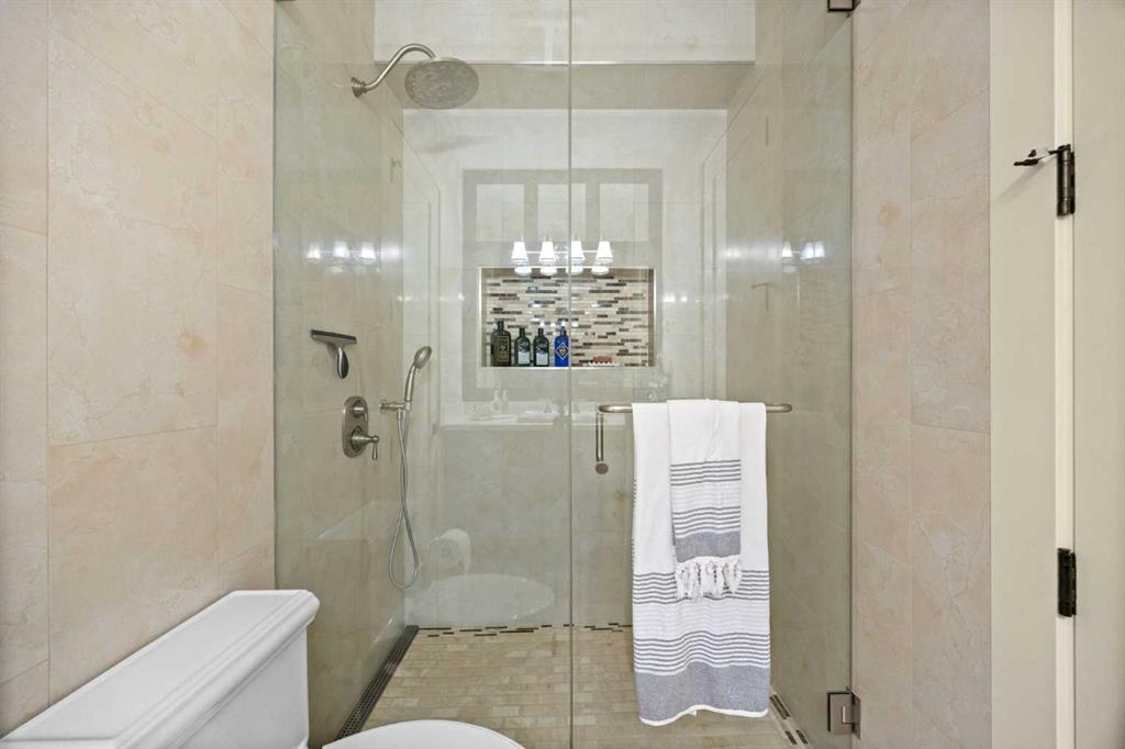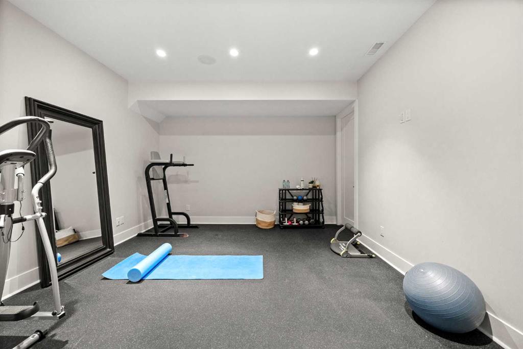 The fully developed walkout basement expands the home’s versatility with three additional bedrooms, multiple bathrooms, a large family room, full bar, gym, and flexible spaces including a den and extensive storage . In-floor heating throughout the lower level and primary ensuite adds an extra layer of comfort year-round, while direct access to the lower patio creates a seamless indoor-outdoor connection.