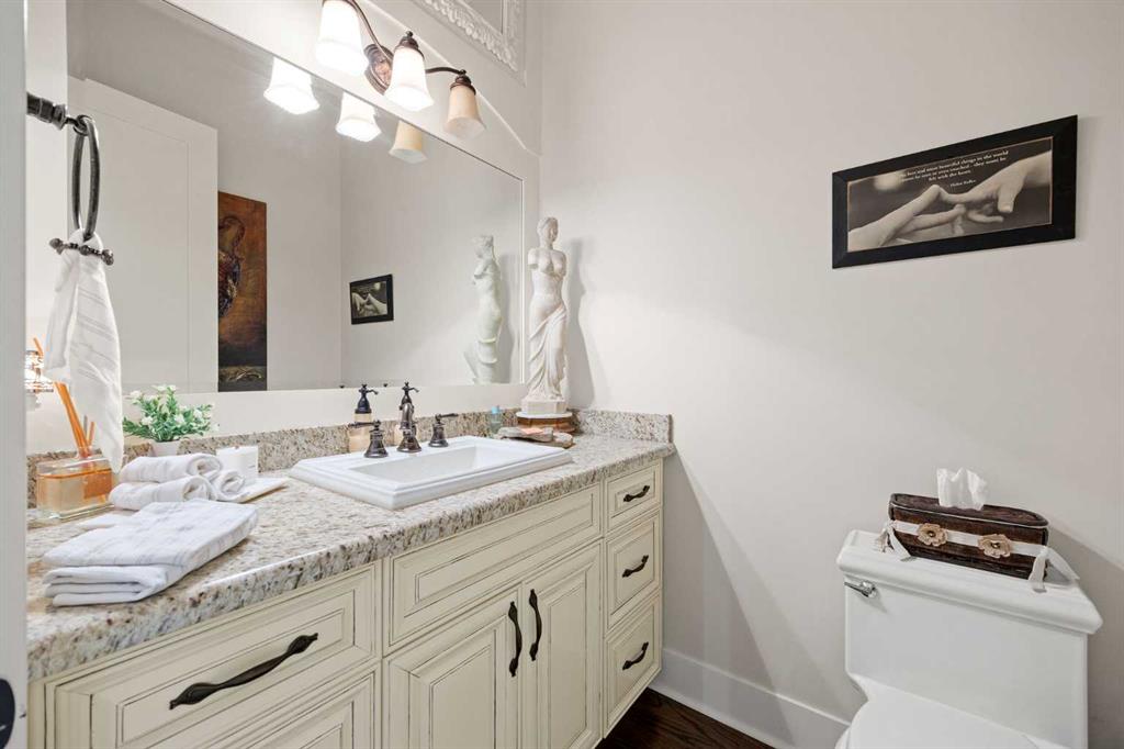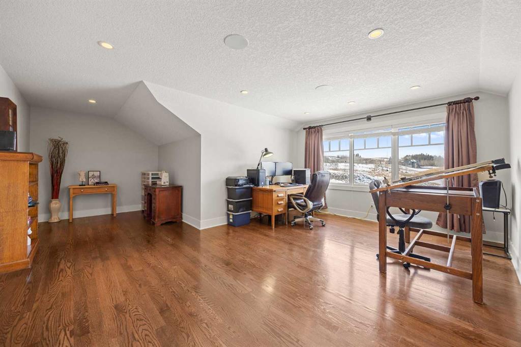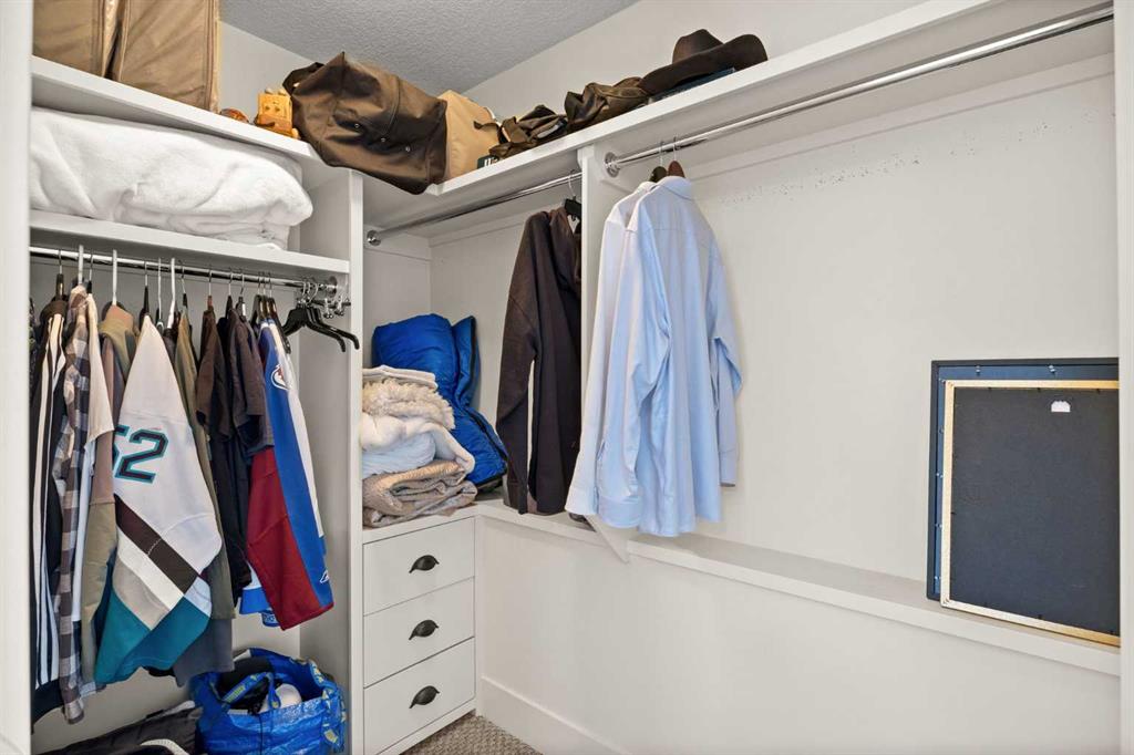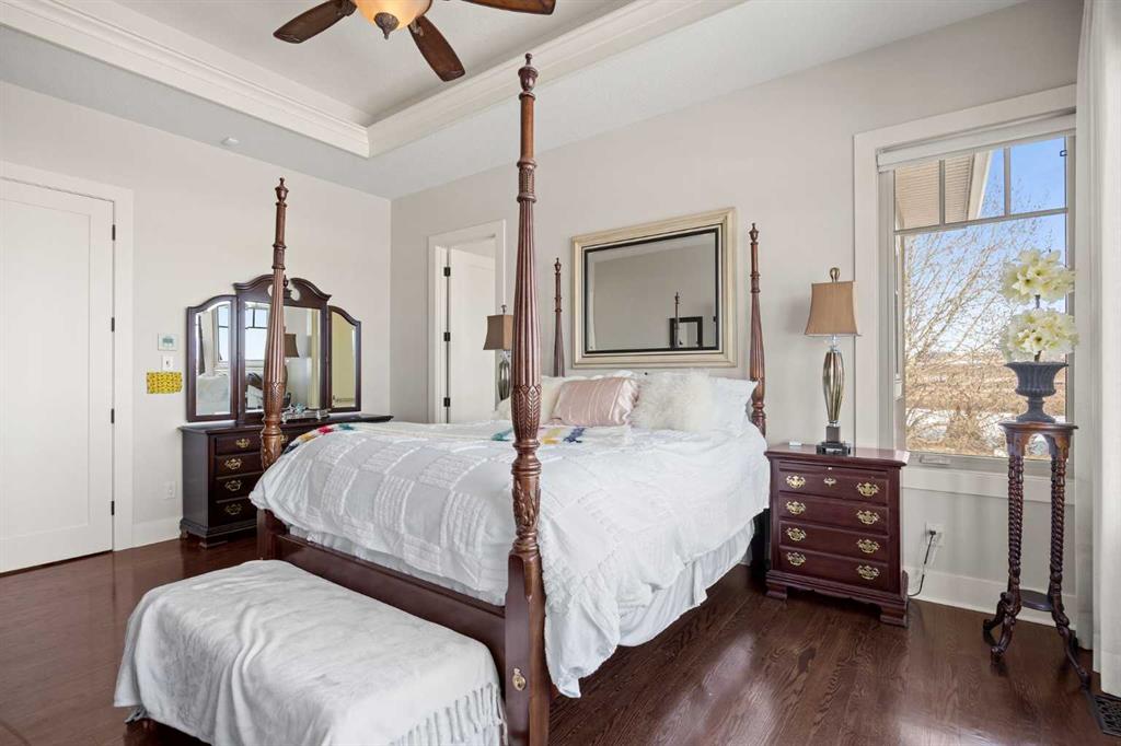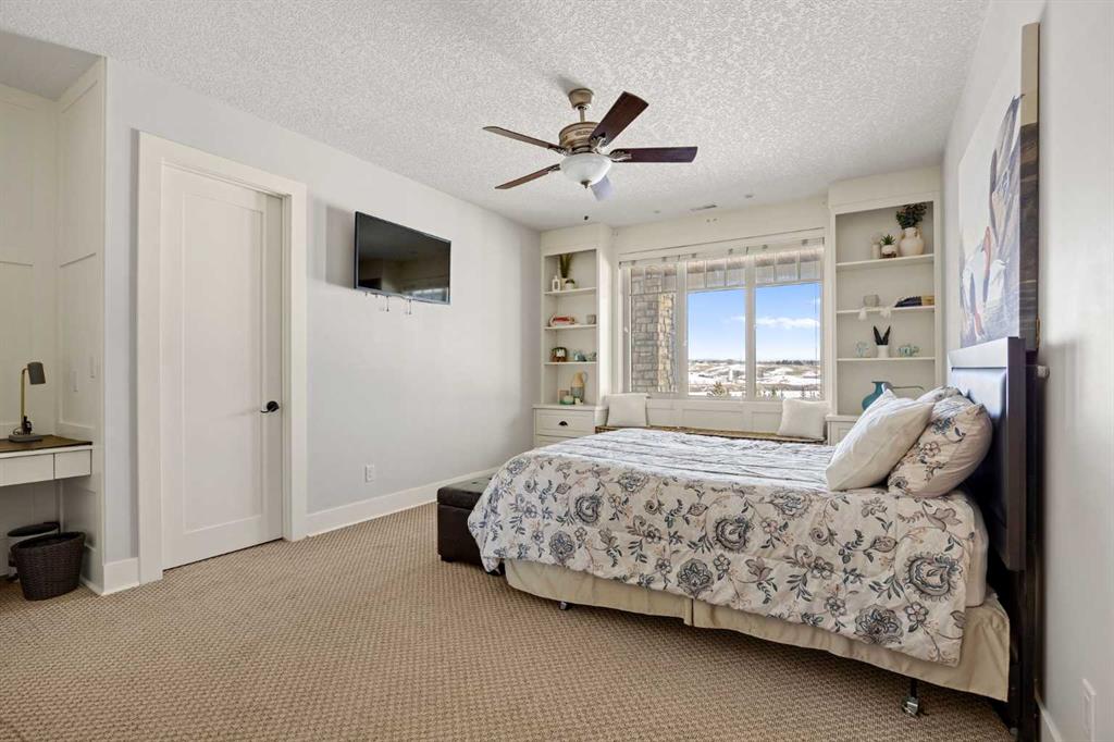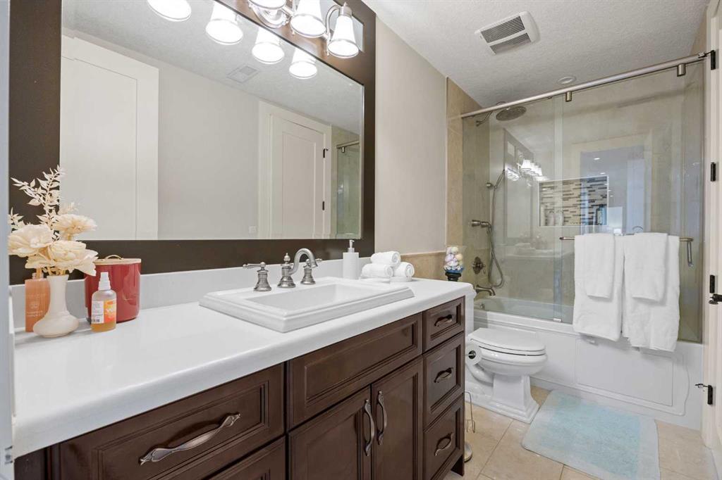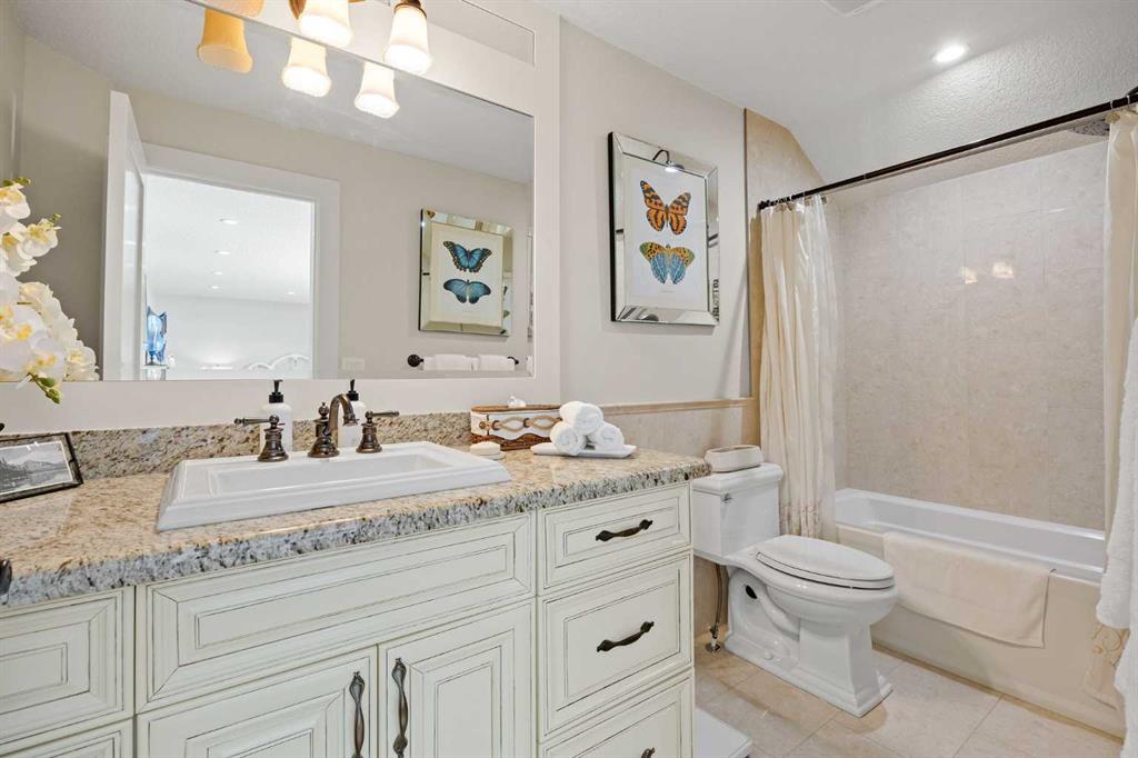 The fully developed walkout basement expands the home’s versatility with three additional bedrooms, multiple bathrooms, a large family room, full bar, gym, and flexible spaces including a den and extensive storage . In-floor heating throughout the lower level and primary ensuite adds an extra layer of comfort year-round, while direct access to the lower patio creates a seamless indoor-outdoor connection.