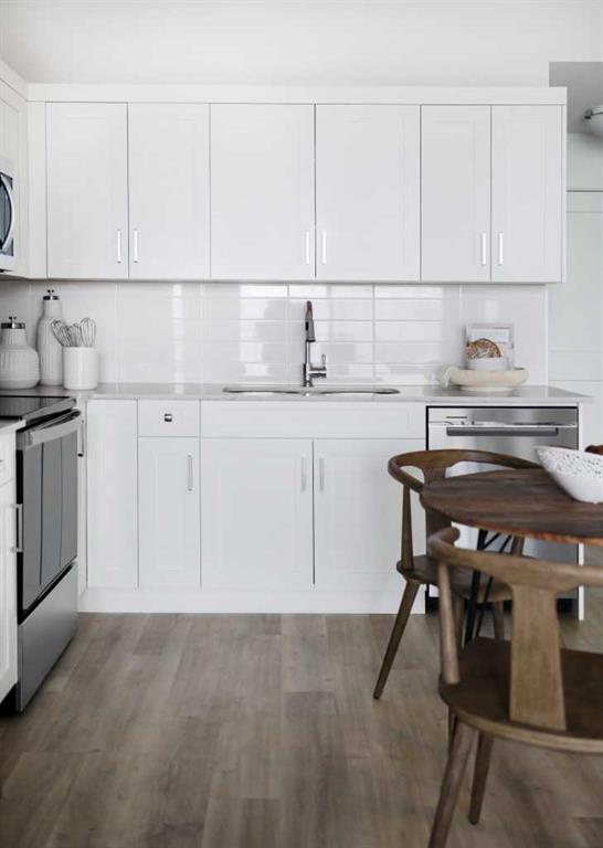 This home showcases a modern designer exterior with premium, hail-resistant, and sound-dampening fibre cement siding. Inside, enjoy 9′ knockdown ceilings and luxury vinyl plank flooring throughout. The kitchen features maple dovetail cabinet boxes with soft-close doors and drawers, quartz countertops, a full-height backsplash, and stainless steel appliances including a fridge, smooth-top self-cleaning range, and over-the-range microwave with hood fan.