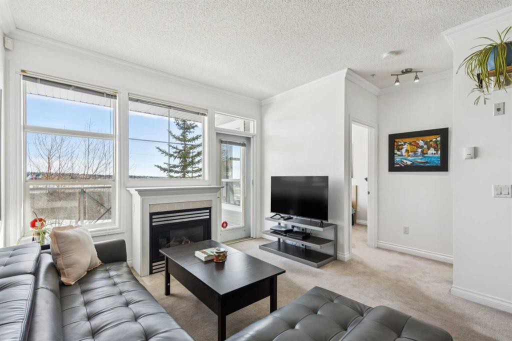 The kitchen opens seamlessly into the bright and spacious living room, where large windows flood the space with natural light, creating a warm and inviting atmosphere. A beautiful textured accent wall adds character and modern style to the living area. From here, step through the glass patio doors onto your private balcony, complete with a gas BBQ line—perfect for outdoor dining or relaxing while taking in the stunning views and peaceful surroundings.