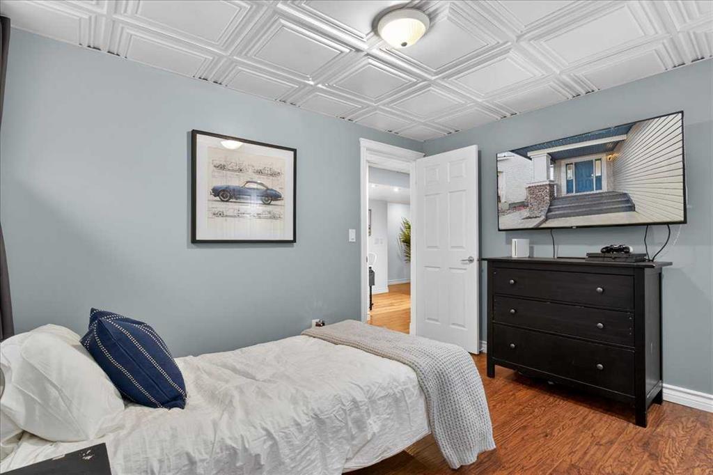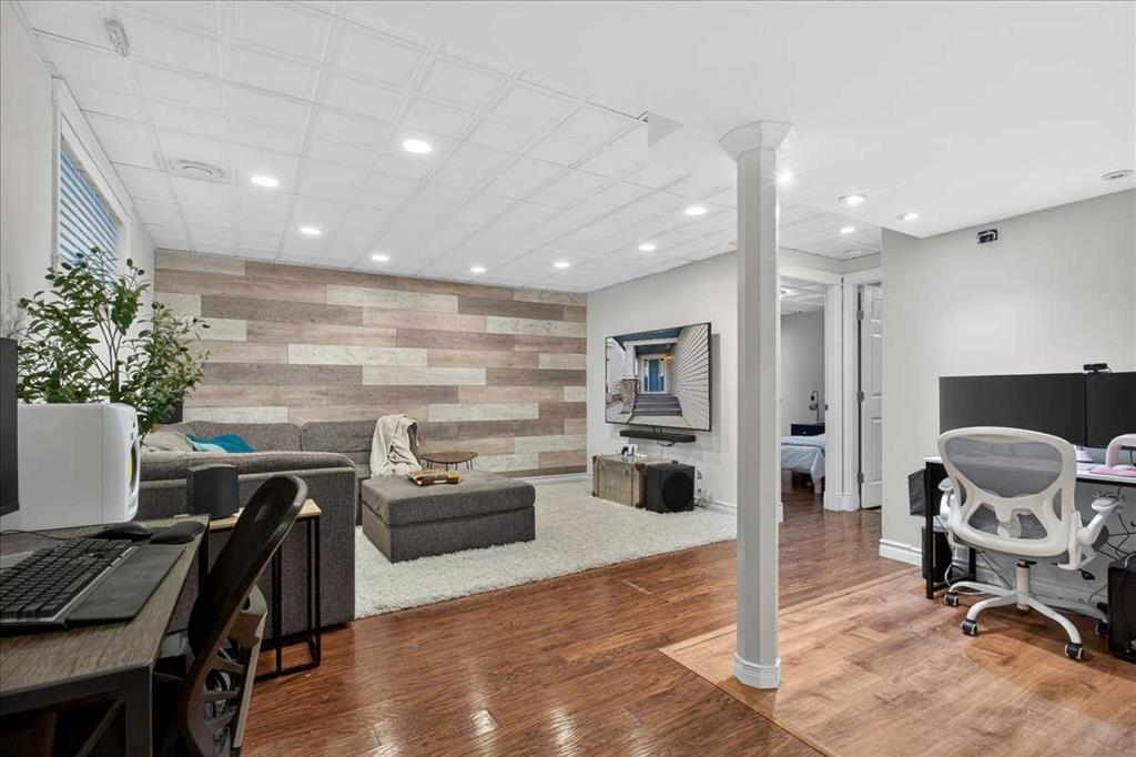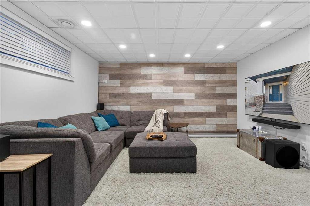 The fully finished basement offers a large recreation room and a fourth bedroom with double closets, providing flexible space for guests, teens, or a home office.