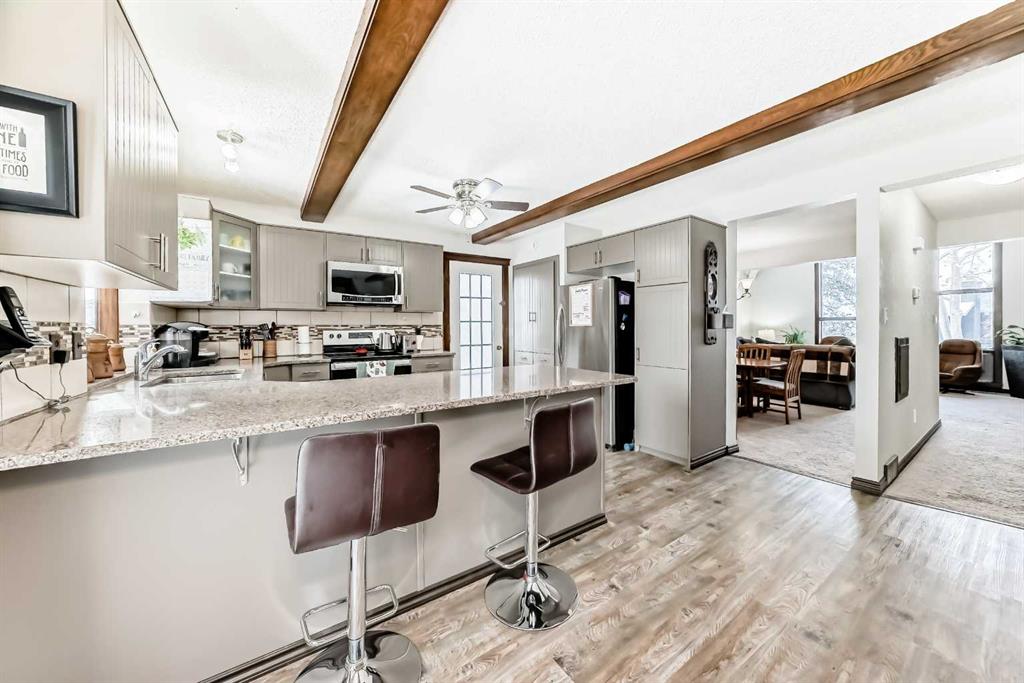 The main floor offers well-defined living spaces while still maintaining an open feel. The dining area flows naturally into the vaulted living room, creating a great space for gathering. At the back of the home, the kitchen and family room have a cozy feel with a fireplace, wet bar, and easy access to the large back deck with built-in hot tub. The kitchen has been thoughtfully updated over the years and includes a newer stove (2021) and dishwasher (2022). A natural gas line makes BBQ season easy.