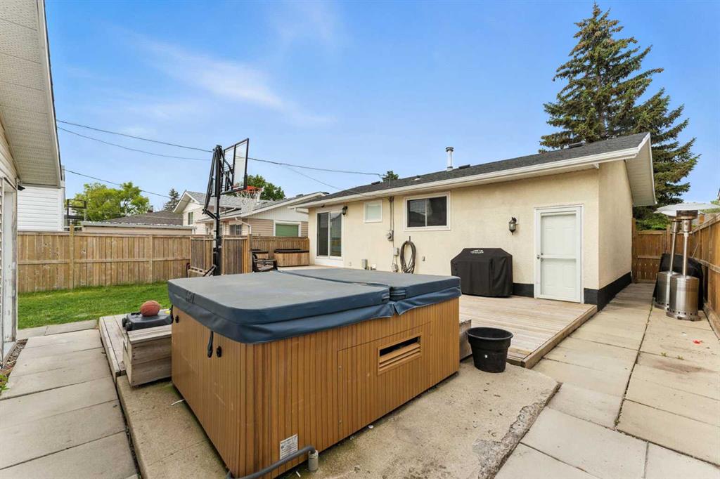 Enjoy outdoor living in your private backyard oasis, featuring a large deck, hot tub, and firepit area.