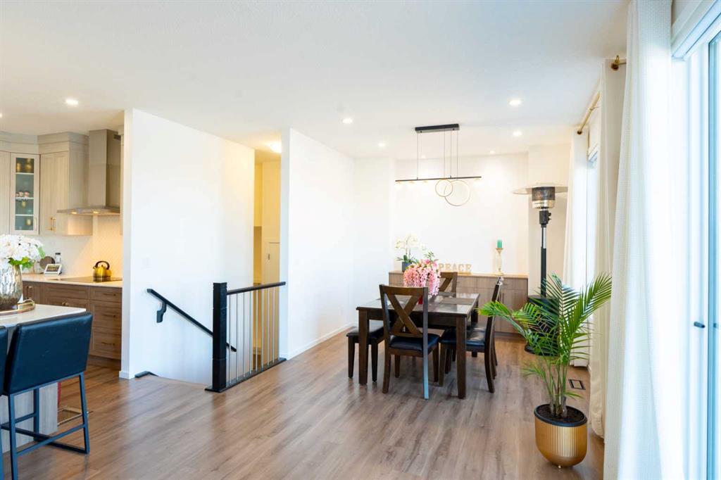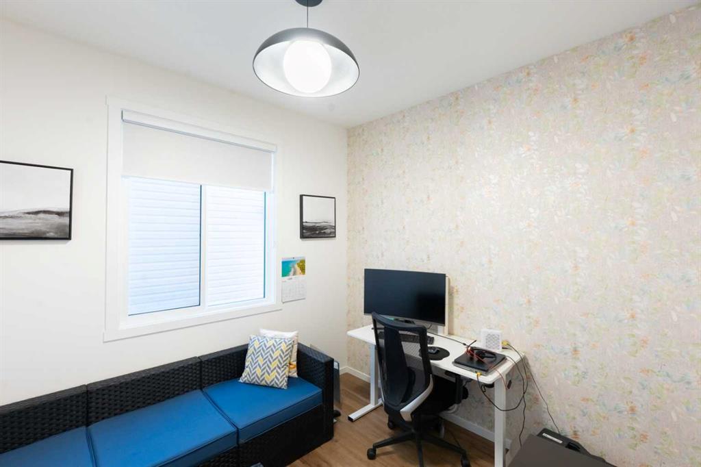 Thoughtfully designed with both everyday functionality and elevated style in mind, the bright open-concept main floor features luxury vinyl plank flooring and expansive windows that flood the home with light from both exposures. The spacious great room offers a loft-inspired feel and is anchored by an upgraded electric fireplace set against a striking modern black panel accent wall — creating a warm yet contemporary focal point.