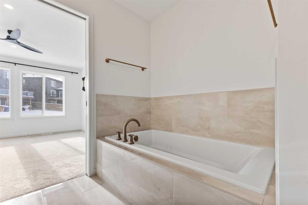 Upstairs, glass-panel railings and a bright upper hallway continue the home’s airy feel. The primary suite is spacious and luxurious, featuring a soaker tub, dual sinks, walk-in closet with built-in storage, and stylish brass fixtures atop custom quartz counters.
