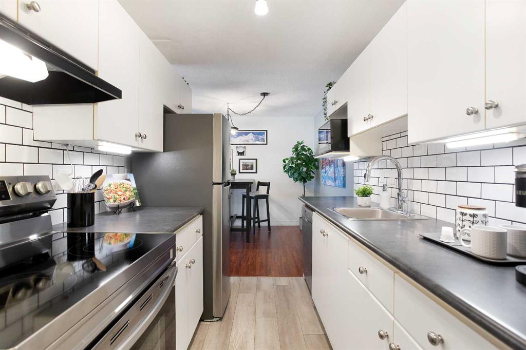 Welcome to Glenmore on the Parc in sought-after Glamorgan—80 Galbraith Drive SW, Unit 22C—a bright top-floor 2-bedroom, 1-bath condo offering 857 sq ft of comfortable, low-maintenance living. The east-facing exposure brings in beautiful morning light while maintaining a private-feeling outlook. The kitchen is a standout with newer countertops and flooring, crisp subway-tile backsplash, and updated appliances including a newer fridge and stove—perfect for everyday cooking in a clean, modern space.