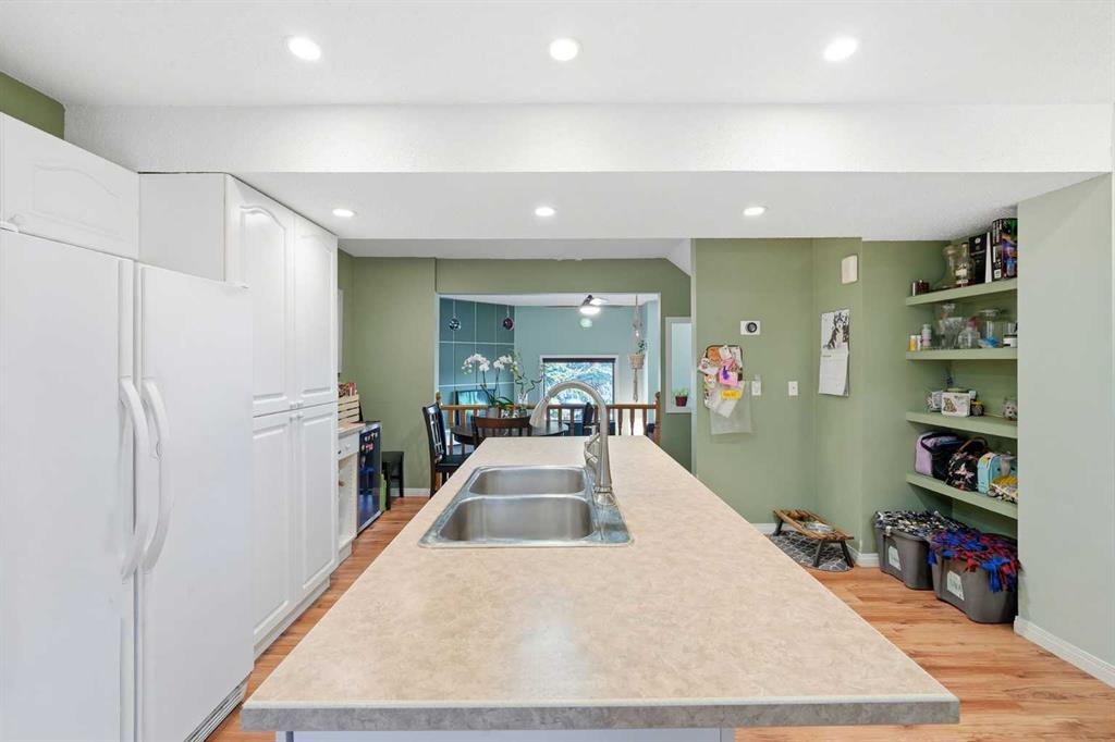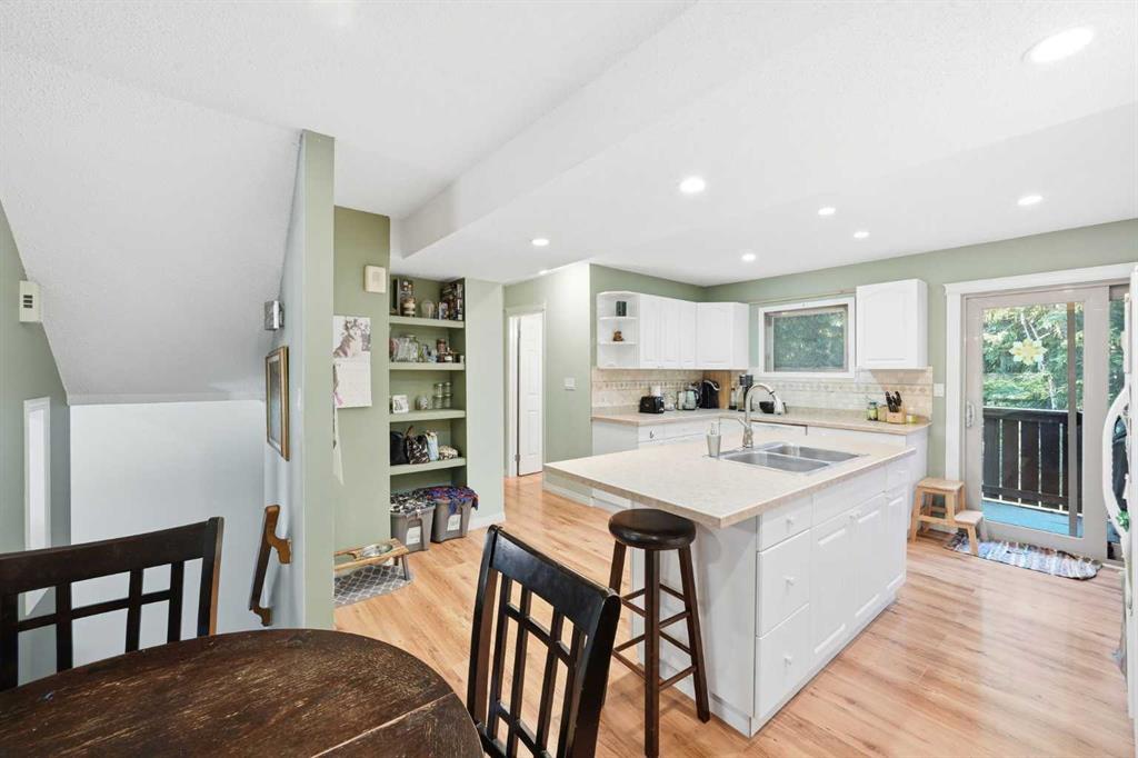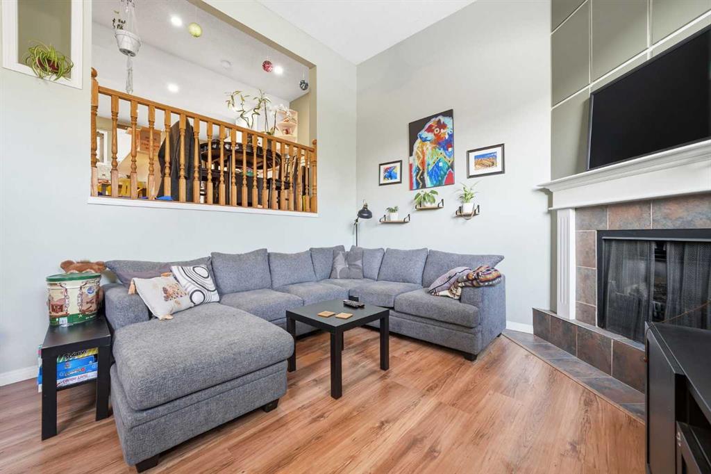The home opens into a warm and welcoming living room with vaulted ceilings and a corner fireplace, creating an ideal gathering space for movie nights or evenings by the fire. Just a few steps up, the bright, open kitchen and dining area offers ample cabinetry, generous prep space, and a centre island perfect for casual meals or entertaining.