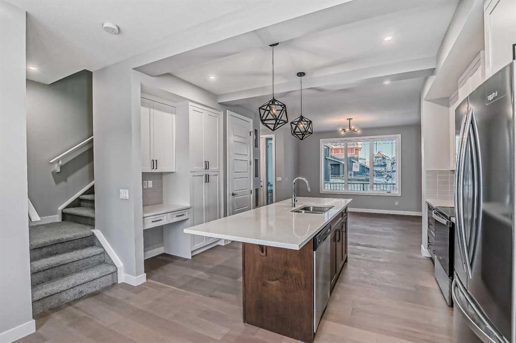 IMMEDIATE POSSESSION! BRAND NEW HOME by Douglas Homes, Master Builder in central Greystone, short walking distance to the Bow River, shopping & interconnected pathway system. Featuring the Melbourne with additional SIDE ENTRY. Located down the street from the community Kids Play Park (already completed) on a sunny west facing backyard, great for entertaining. This gorgeous 3 bedroom, 2 & 1/2 half bath home offers over 1225 sq ft of living space. Loads of Designer/upgraded features in this beautiful, open floor plan. The main floor greets you with a grand glazed 8′ front door, entry closet with 8′ door, soaring 9′ ceilings, oversized windows , & 8′ 0″ passage doors. Distinctive Engineered Hardwood floors flow through the Foyer, Hall, Great Room, Kitchen & Nook adding a feeling of warmth & style. The two sided Kitchen is completed with an oversized entertainment island (9’0″ single level island) & breakfast bar, roomy cabinet pantry, Quartz Countertops, 42″ Cabinet Uppers accented by decorative drywall bulkhead, Pots & Pans Drawers, soft close doors & drawers throughout, new stainless appliance package including Microwave/Hood Fan combo over the stove , smooth top electric Range, Fridge & built-in Dishwasher. The main floor is completed with an expansive, open Great Room with Napoleon “Entice” fireplace, spacious Nook finished with over height windows, rear entry with full French Door & transom above, closet & 1/2 bath . Upstairs you’ll find a well sized Primary Bedroom with 3 piece Ensuite including separated Quartz vanity with undermounted sink & oversized 5’0″ x 3’0″ shower with tiled walls & ceramic tile flooring. There is also a generous sized walk-in closet accessed from the bedroom. There are two additional good sized bedrooms with roomy closets. The second floor is completed by a main bathroom with combination Tub/Shower with tiled walls, Quartz countertop with undermounted sink & in-vanity drawer all completed by ceramic tile flooring. You’re certain to love the convenience of the 2nd Laundry for stacked washer/dryer also completed with tile flooring. This is a very popular plan, great for young families or for the sizing down crowd. Spacious, Beautiful and Elegant! The perfect place for your perfect home. Call today! Photos are from prior build & are reflective of fit, finish & included features. Note: Front elevation of home & interior photos are for illustration purposes only. Actual elevation style, interior colors/finishes, & upgrades may be different than shown & the Seller is under no obligation to provide them as such. Directions: Directions: Come to the Show Home first at 500 River Avenue. Showings only during Show Home hours & days. THIS HOME IS UNDER CONSTRUCTION
