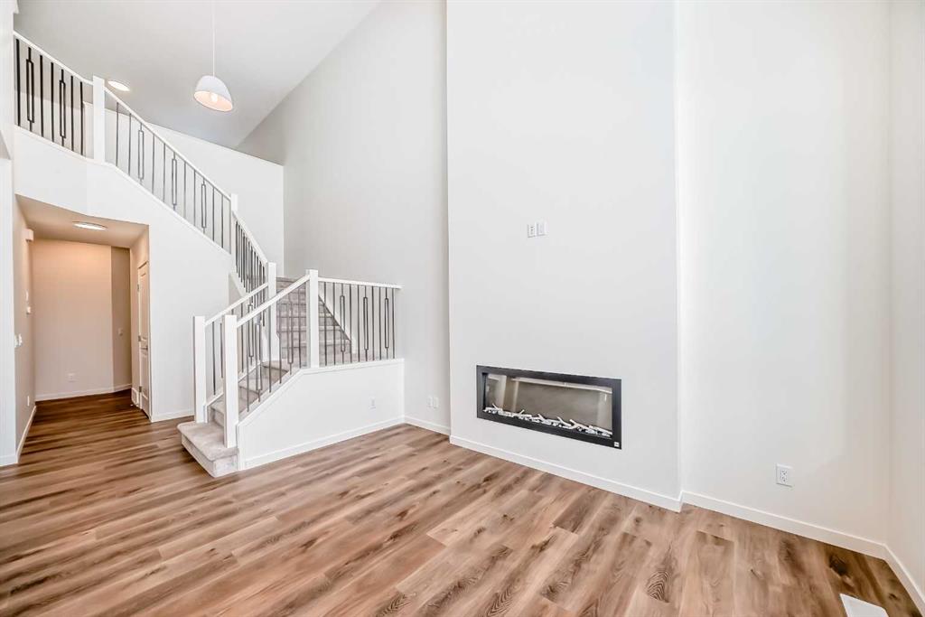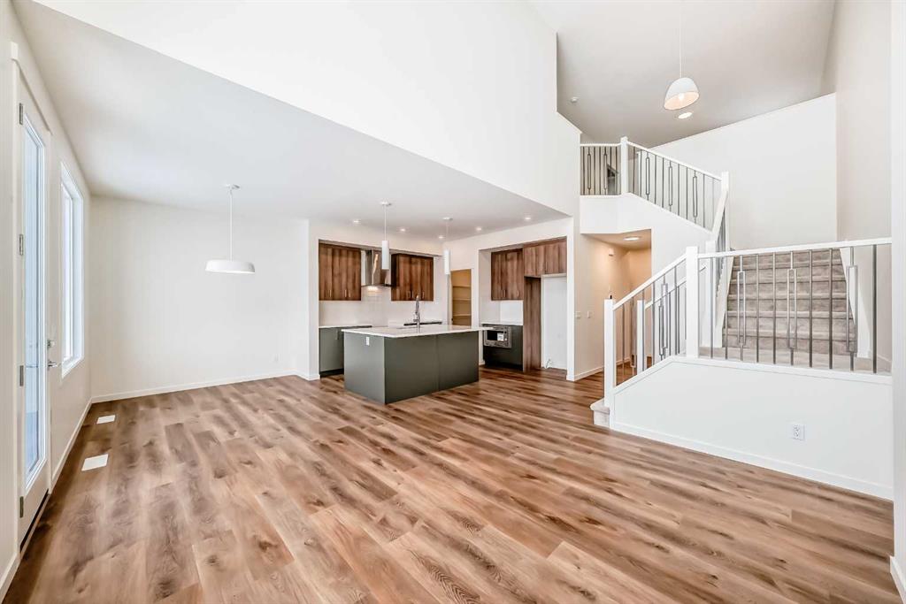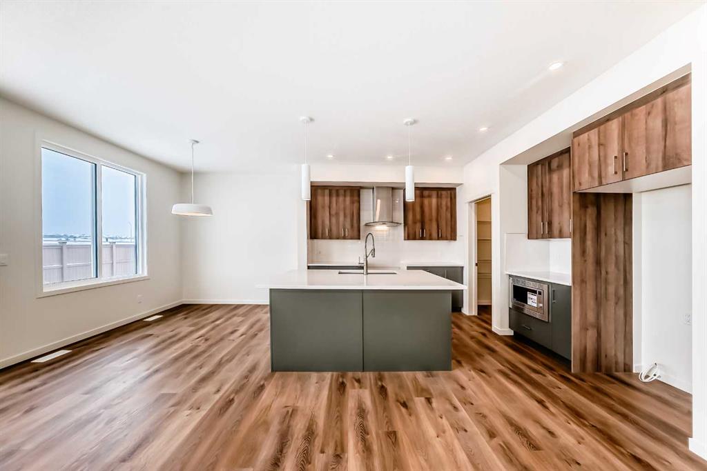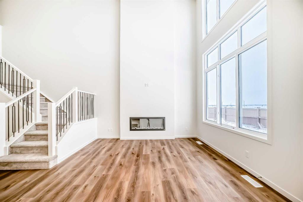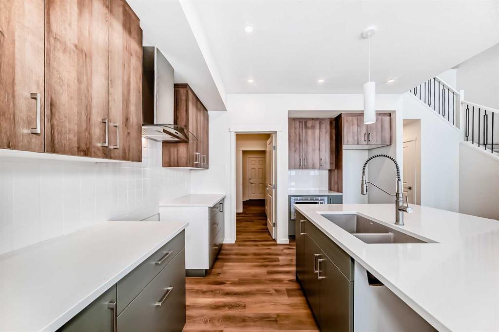 Welcome to the “Grada” by Hopewell Residential, where elevated design and everyday functionality come together in Calgary’s visionary garden-to-table community of Rangeview. Offering 2,119 sq. ft., 4 total bedrooms, and a thoughtfully designed layout that balances style with practicality, this is a home that feels as good as it looks. From the moment you step inside, you’ll appreciate how well this home is designed for modern family living. Just off the front entry, a main floor bedroom is paired with a convenient 3-piece bathroom, creating exceptional flexibility for a variety of lifestyles. Whether used for multi-generational living, a live-in nanny, overnight guests, or even as a private home office, this space adds versatility that is increasingly hard to find. As you move further into the home, the main floor opens beautifully into a spacious dining area and inviting lifestyle room, creating an effortless flow for both everyday routines and entertaining. The open-to-above living room creates a dramatic sense of space, while floor-to-ceiling windows flood the home with natural light. A beautiful fireplace anchors the room, adding warmth and character to this impressive central gathering space. The kitchen is a true standout, blending contemporary style with timeless finishes. Designed to impress, it features quartz countertops, a large central island, built-in microwave, upgraded storage drawers, and a striking stand-alone hood fan wrapped in a classic white 4×4 backsplash that adds texture and charm. The two-tone cabinetry offers a designer look with modern green lower cabinets paired with wood grain upper cabinetry, creating a warm and sophisticated aesthetic that sets this home apart. Upstairs, the thoughtful layout continues with a central bonus room overlooking the main living space below and benefiting from the home’s oversized two-storey windows, which fill the upper level with light and create an airy, open feel. You’ll also find three spacious bedrooms, including a well-appointed primary retreat featuring a step-in shower for a spa-inspired feel. A full bathroom and conveniently located upper floor laundry. The lower level provides excellent future potential with a 9-foot foundation, giving you flexibility to expand your living space over time or explore the possibility of a secondary suite (a secondary suite would be subject to approval and permitting by the city/municipality). Located in Rangeview, one of Calgary’s most unique new southeast communities, this home offers more than just beautiful interior finishes—it offers a lifestyle rooted in connection, nature, and community. Designed around a garden-to-table vision, Rangeview brings residents together with thoughtfully planned green spaces, pathways, gathering areas, and a strong sense of belonging. It’s the perfect setting for families looking for a fresh start in a neighbourhood built with lifestyle in mind. Discover the perfect blend of comfort, style, and community with The Grada in Rangeview.