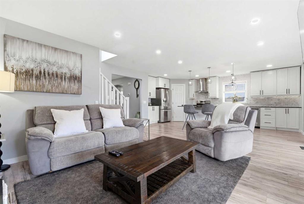 The main floor offers a bright and open-concept layout, featuring an updated kitchen with modern finishes, white cabinetry, and ample workspace. The spacious living room is filled with natural light from large windows and anchored by a cozy gas fireplace. You’ll also find a private front office, a separate dining area, and a convenient 2-piece bathroom on the main level. Laminate flooring throughout the main floor, along with updated railings, adds a fresh and modern feel.