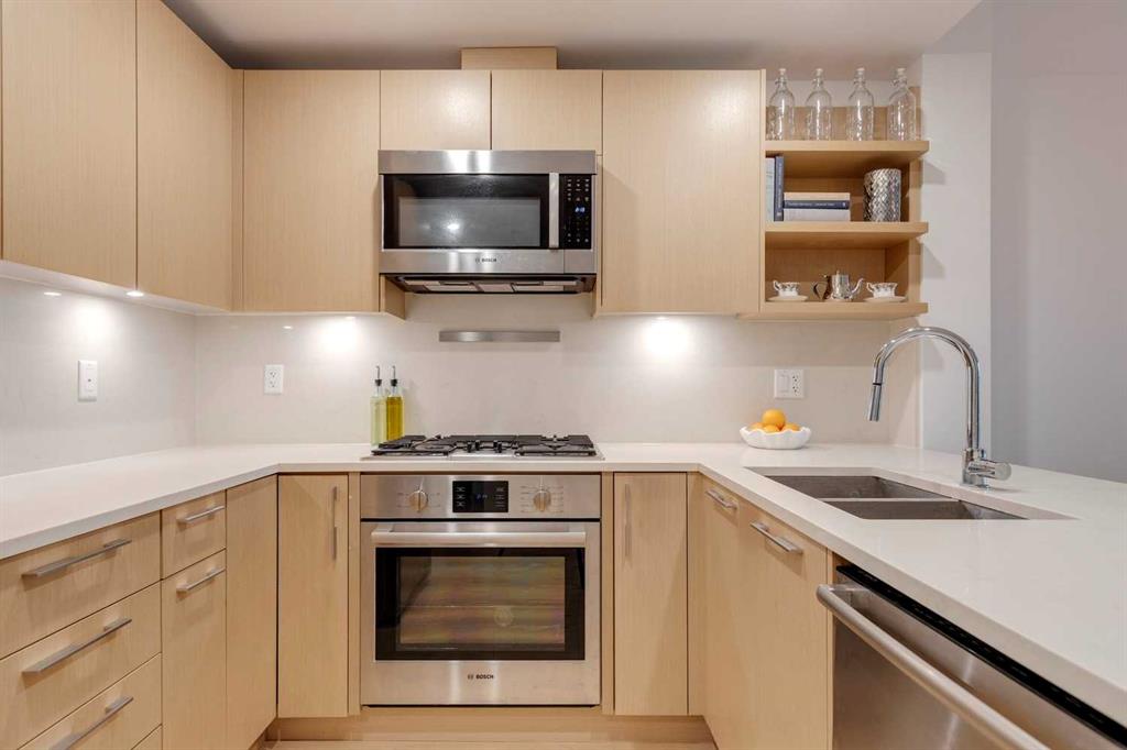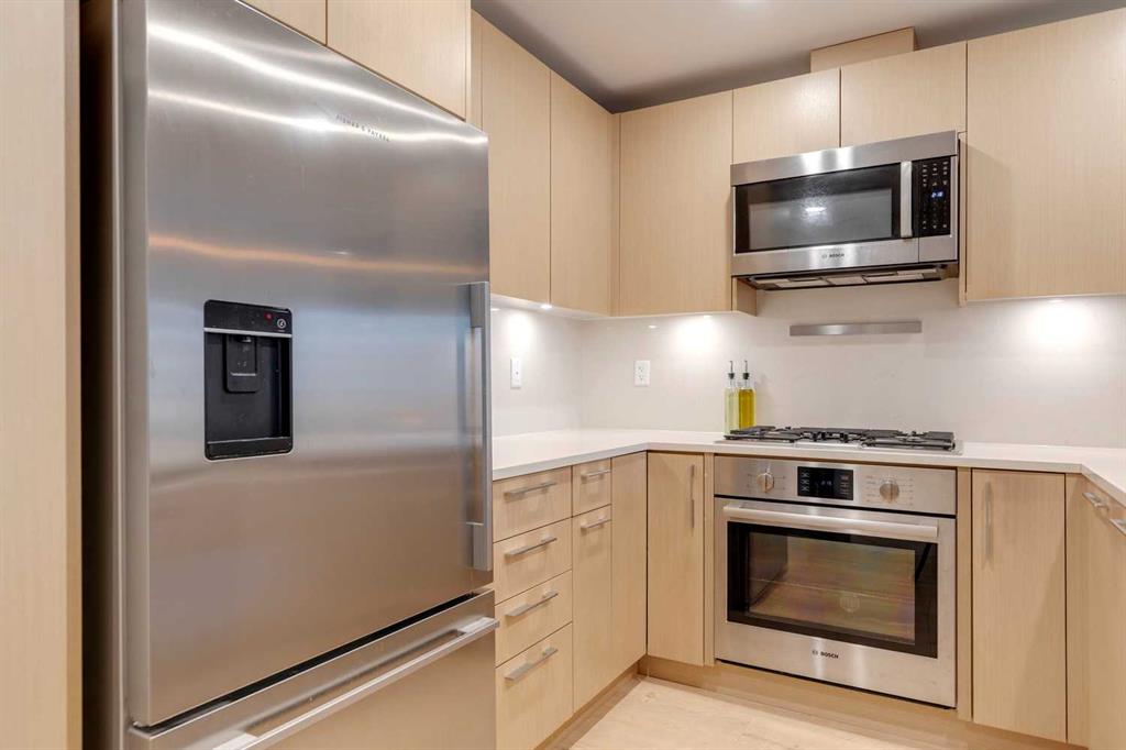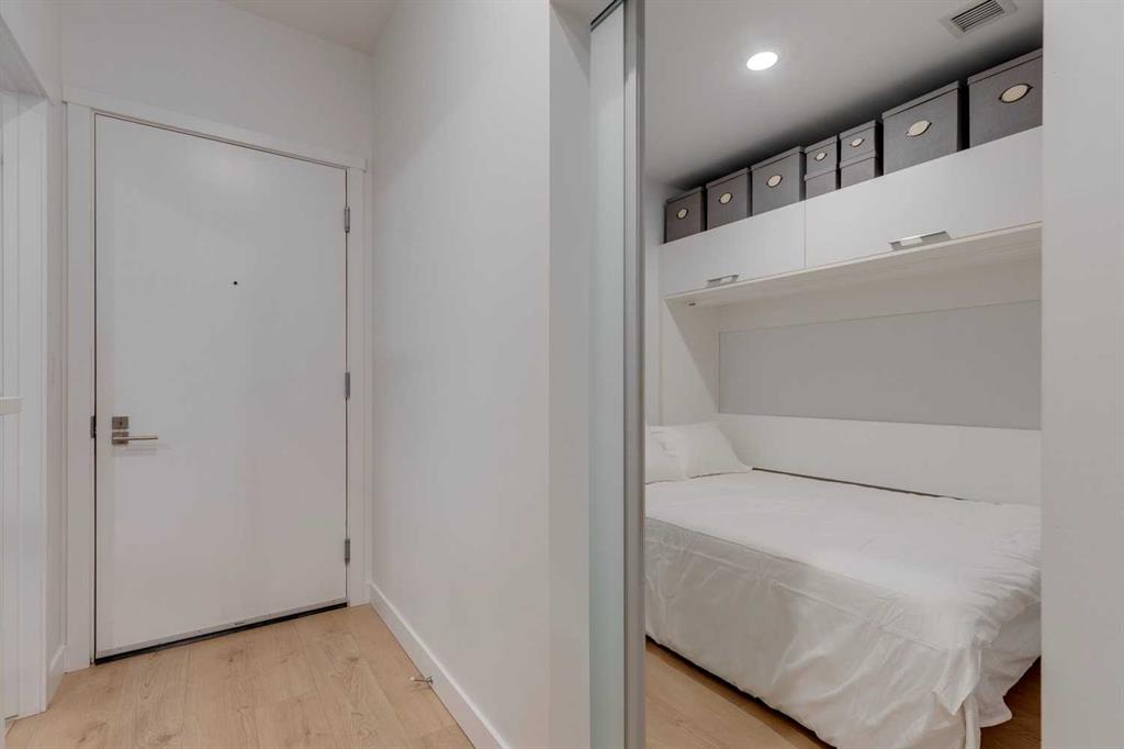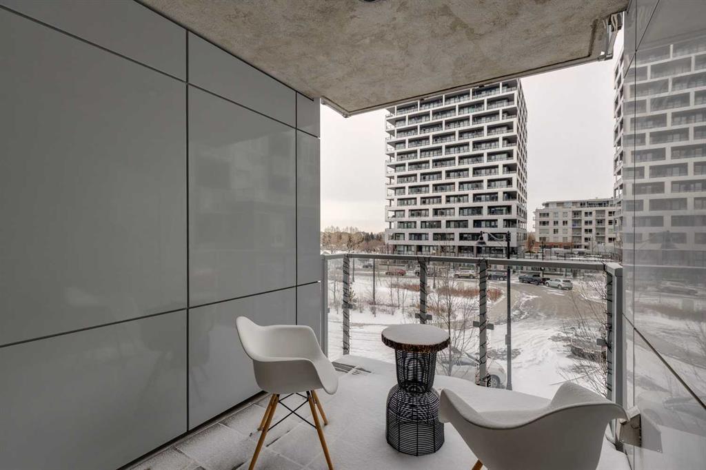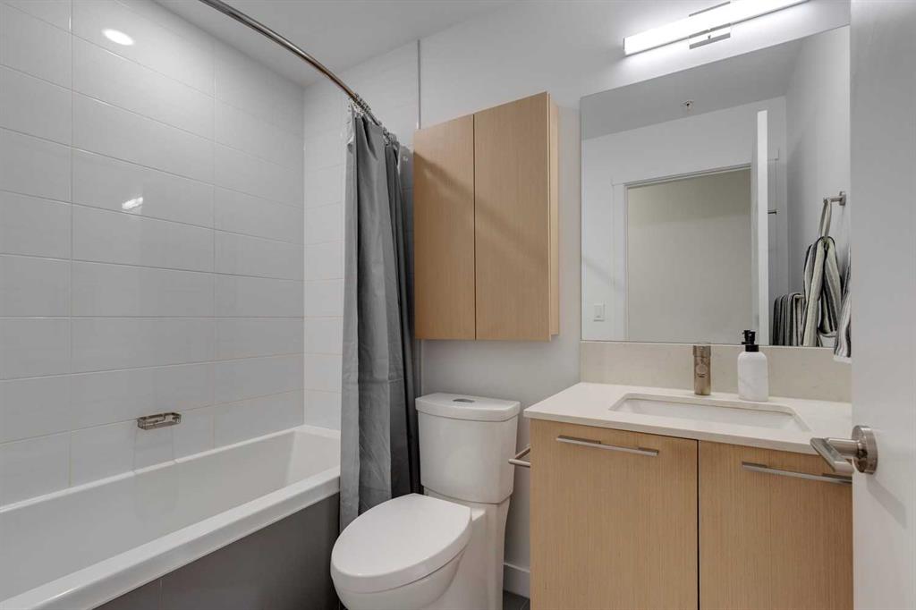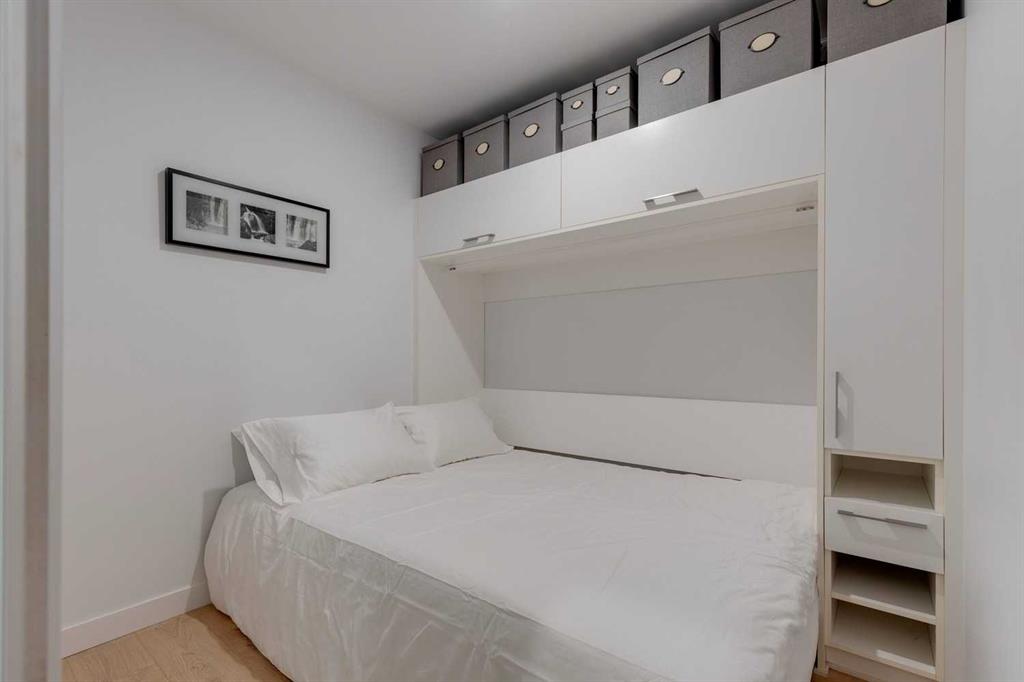 Welcome to this premium inner-city condo offering a thoughtfully designed two-bedroom layout ideal for modern urban living. A light colour palette and engineered hardwood flooring create a bright and inviting feel throughout. The kitchen is beautifully finished with quartz countertops, premium Bosch appliances, and a gas range, combining style with everyday practicality. South-facing windows flood the home with natural light throughout the day, enhancing the open and airy feel of the space. The primary bedroom includes a private ensuite bathroom, and features smart storage solutions, with discreet cabinetry above the bathroom mirror. The functional second bedroom features a built-in Murphy bed, allowing the space to easily transition between a comfortable guest room and a dedicated home office. A standout feature is the large storage room and laundry area, a rare offering in condo living that provides exceptional functionality and organization. Residents of this building enjoy concierge service along with an impressive selection of amenities, including two fully equipped gyms, a dedicated spin room, and a yoga studio. The rooftop patio offers outstanding views of downtown, comfortable seating area and vegetable boxes. Additional conveniences include a car wash, secure bike storage, and a dog wash, all designed to enhance everyday condo living. Freshly painted and impeccably maintained, this condo is located in a well-appointed building that delivers quality construction and an exceptional inner-city lifestyle with easy access to dining, shopping, and transit. Make Bridgeland your home today.