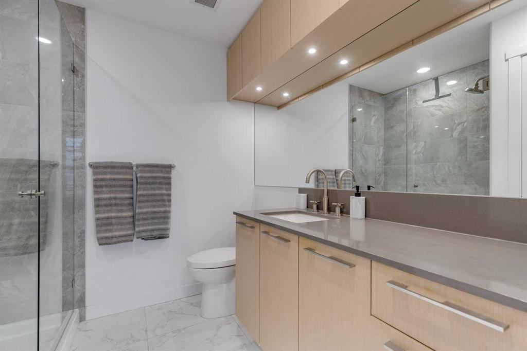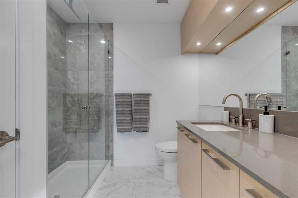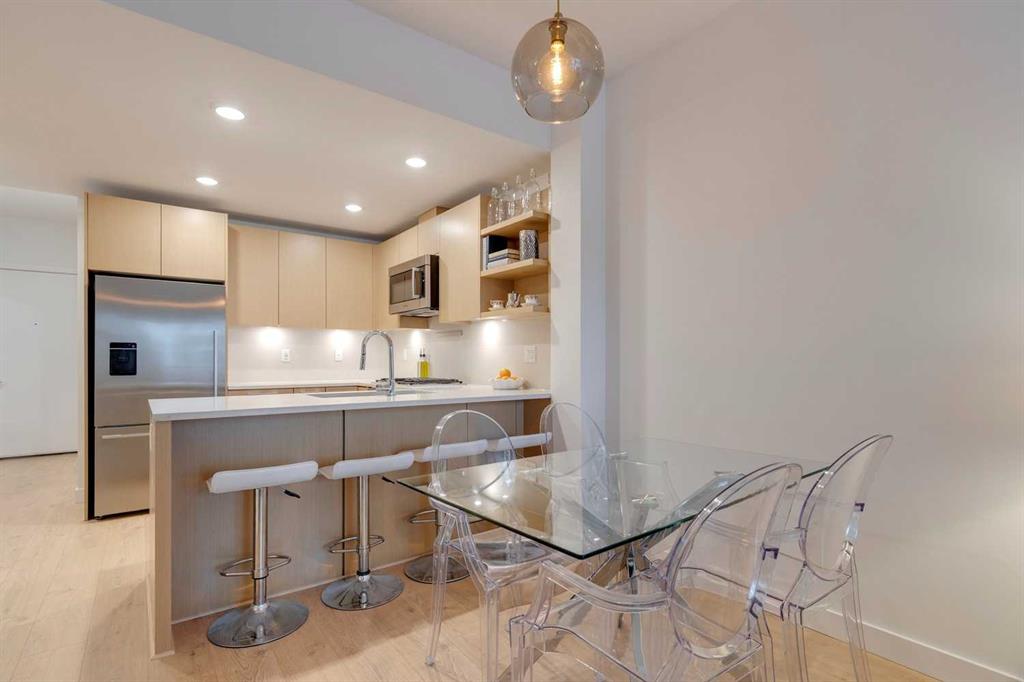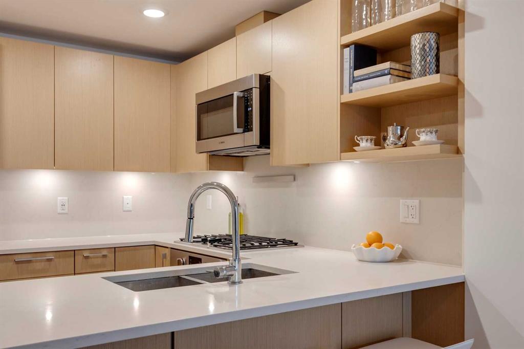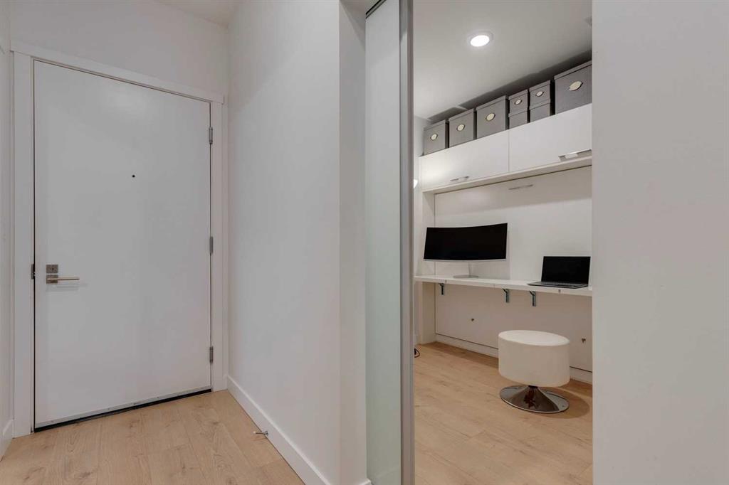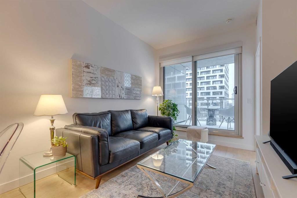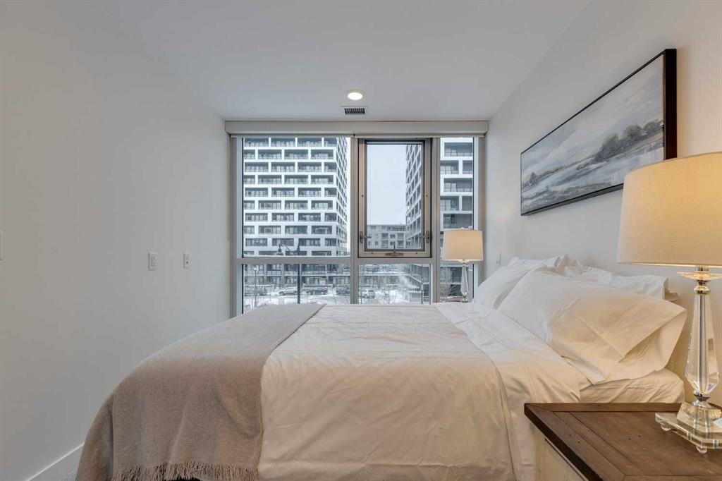 Welcome to this premium inner-city condo offering a thoughtfully designed two-bedroom layout ideal for modern urban living. A light colour palette and engineered hardwood flooring create a bright and inviting feel throughout. The kitchen is beautifully finished with quartz countertops, premium Bosch appliances, and a gas range, combining style with everyday practicality. South-facing windows flood the home with natural light throughout the day, enhancing the open and airy feel of the space. The primary bedroom includes a private ensuite bathroom, and features smart storage solutions, with discreet cabinetry above the bathroom mirror. The functional second bedroom features a built-in Murphy bed, allowing the space to easily transition between a comfortable guest room and a dedicated home office. A standout feature is the large storage room and laundry area, a rare offering in condo living that provides exceptional functionality and organization. Residents of this building enjoy concierge service along with an impressive selection of amenities, including two fully equipped gyms, a dedicated spin room, and a yoga studio. The rooftop patio offers outstanding views of downtown, comfortable seating area and vegetable boxes. Additional conveniences include a car wash, secure bike storage, and a dog wash, all designed to enhance everyday condo living. Freshly painted and impeccably maintained, this condo is located in a well-appointed building that delivers quality construction and an exceptional inner-city lifestyle with easy access to dining, shopping, and transit. Make Bridgeland your home today.