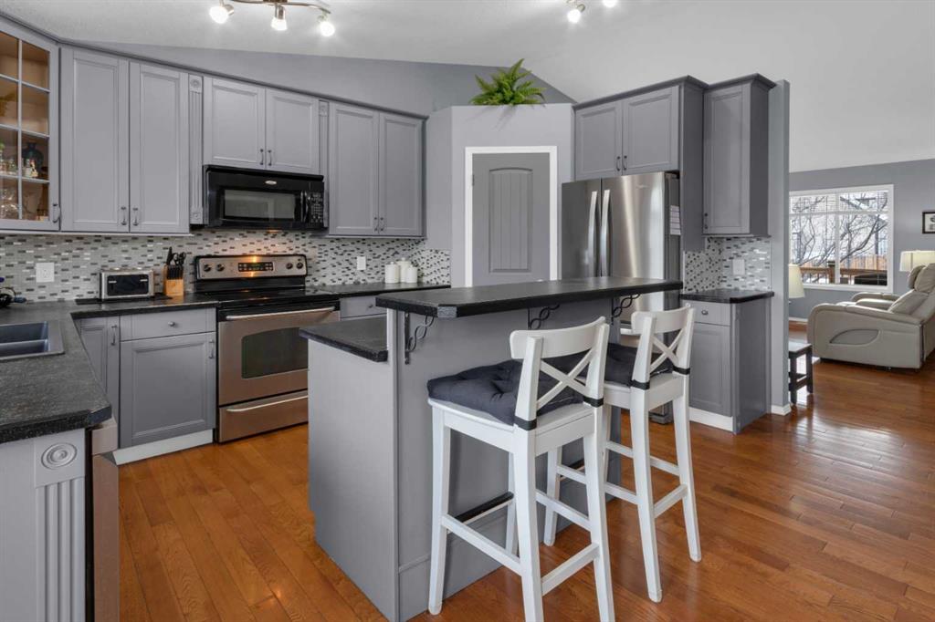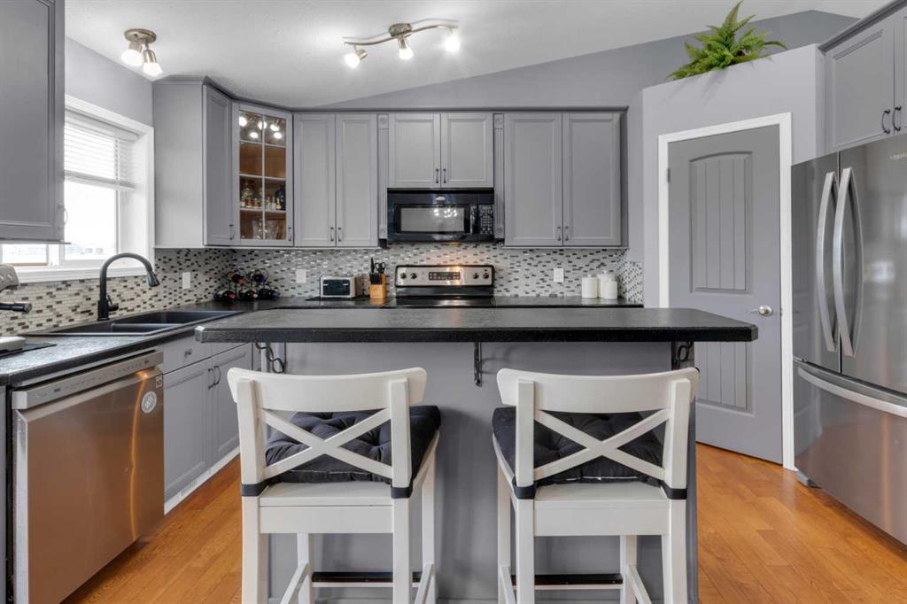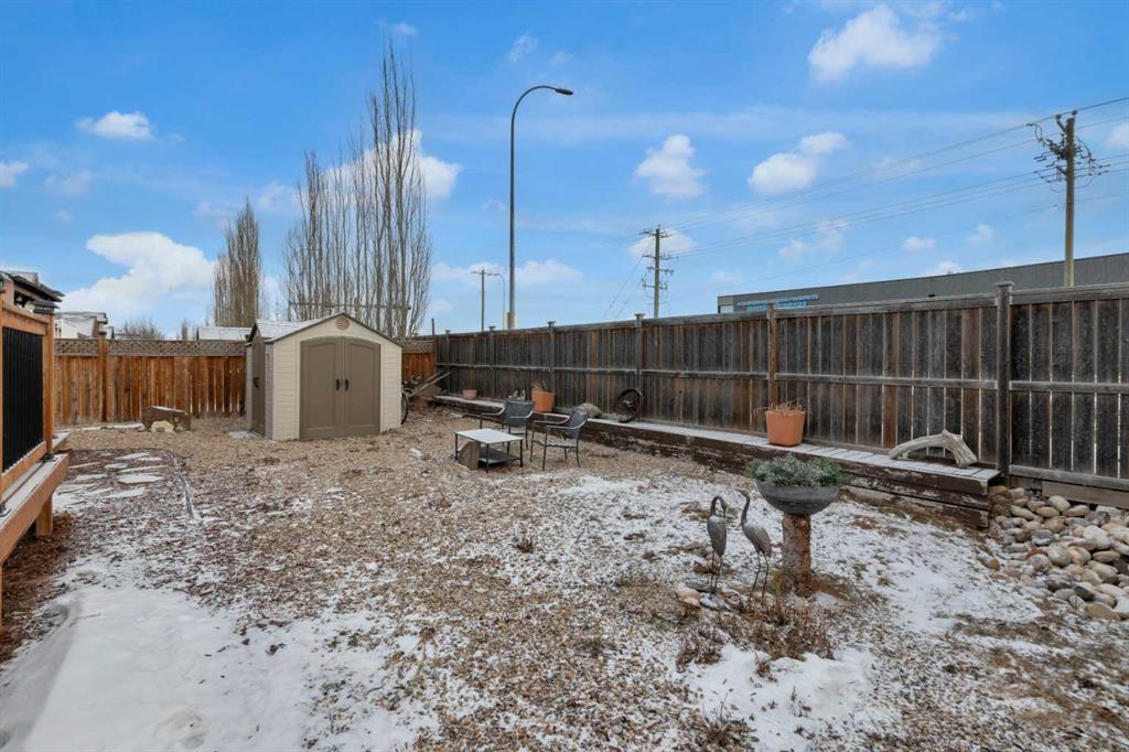 HOME SWEET HOME! This is your AMAZING opportunity to enjoy the perks of small town living in a wonderfully maintained, move-in ready bungalow in the heart of charming Strathmore backing on to a school/green space! This stunning home offers 3 bedrooms, 2.5 bathrooms, 2,183+ fully developed SQFT throughout and a double attached garage. The inviting curb appeal and front porch leads in you inside where you will find your gleaming hardwood flooring, vaulted ceilings and an abundance of windows flooding the home in natural sunlight. The main floor offers a spacious and large living room perfectly complimented by a cozy gas fireplace, a foyer, formal dining area, a wonderful 4 piece bathroom, convenient laundry room and the gourmet chef’s kitchen complete with custom cabinetry, center island with built-in storage, corner pantry, stainless steel appliances and a garden door that leads you to the rear deck. Completing this floor is a great-sized bedroom and the magnificent primary retreat with a large walk-in closet and an elegant 4 piece ensuite bathroom. The fully finished basement features a huge recreation room/living room perfect for a growing family, a 3rd bedroom, a 2 piece vanity bathroom (roughed in for a shower) and the all the storage space you could require. The hot water tank is newer and 60 gallon. Outside, there is the double attached garage with 2 additional driveway parking spots and the fully fenced, low-maintenance backyard providing you with your own private oasis with a pergola, large deck and shed. Located close to all major amenities including steps from a school, playground and park, shopping, walking paths, Strathmore Lake and a quick 30 minute drive to Calgary. This is the opportunity you have been looking for, book your private viewing today of this GEM!