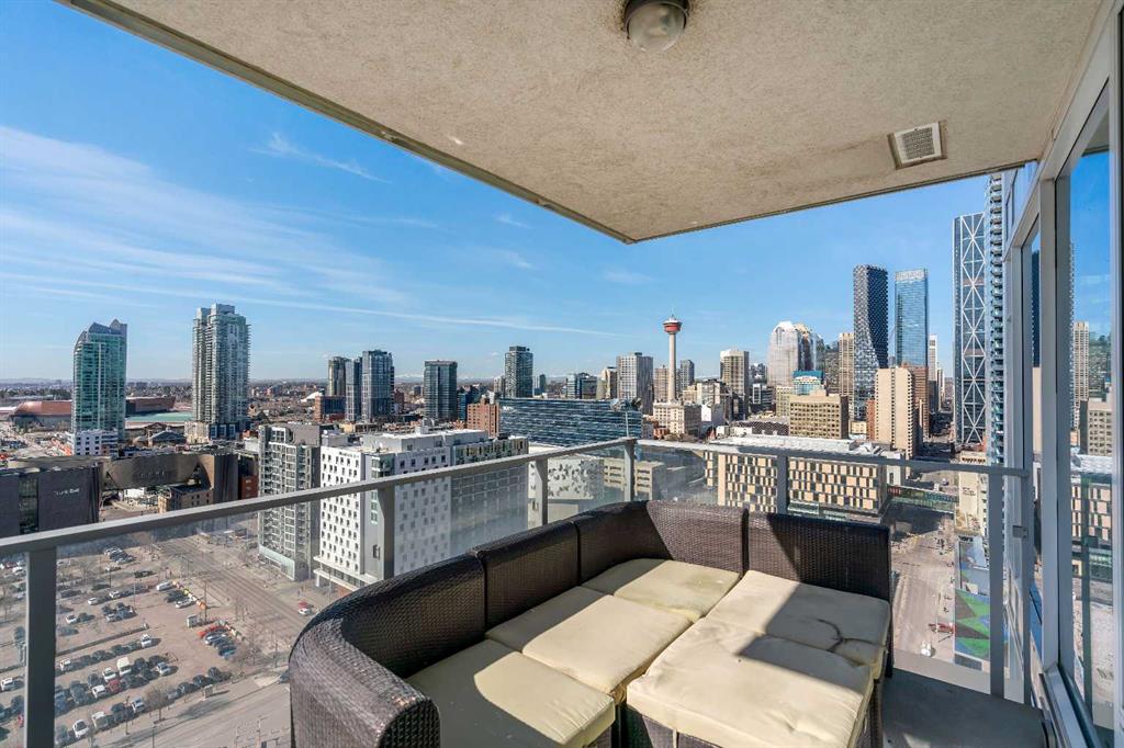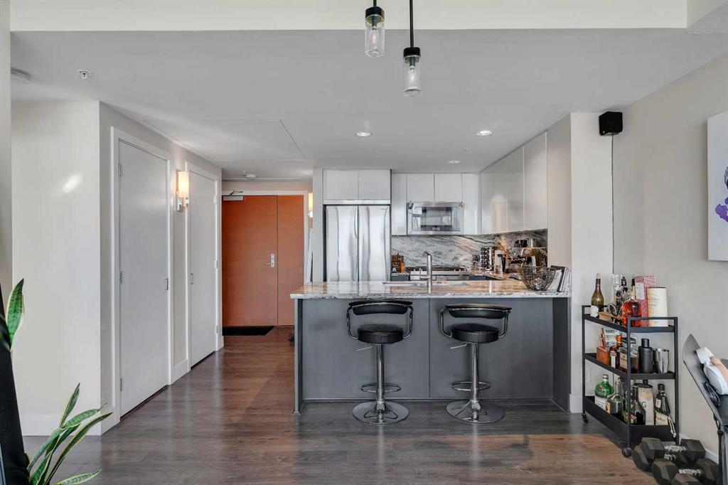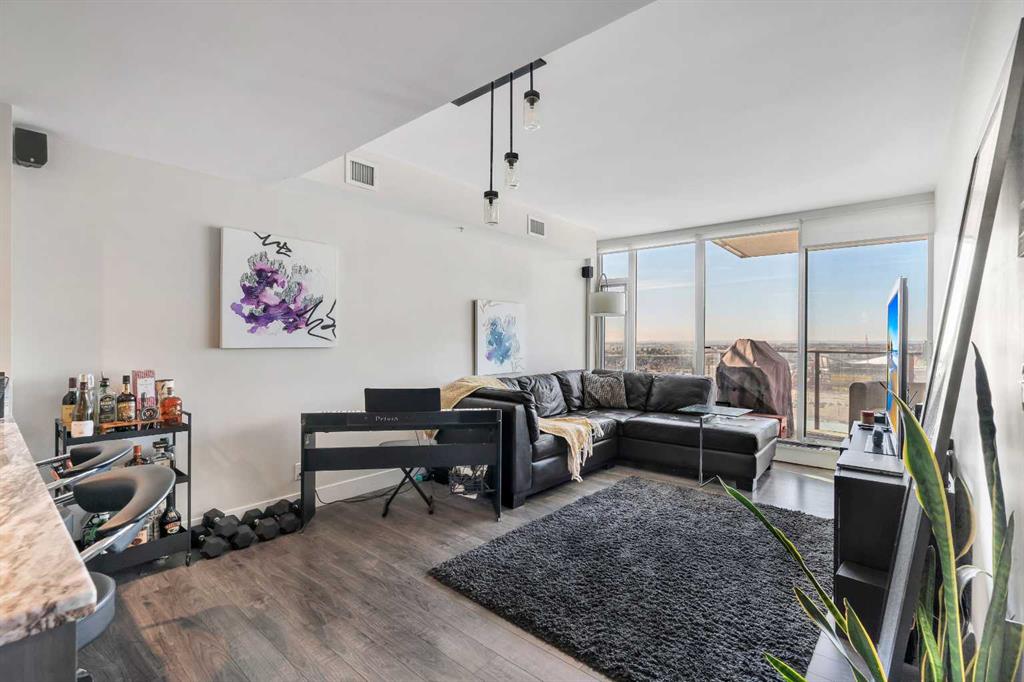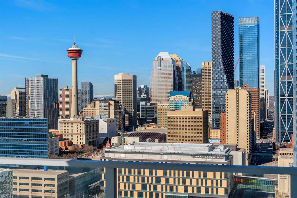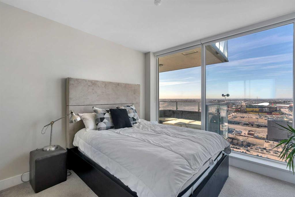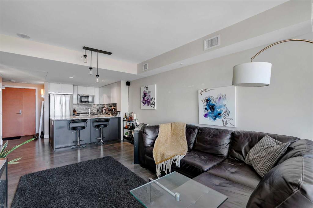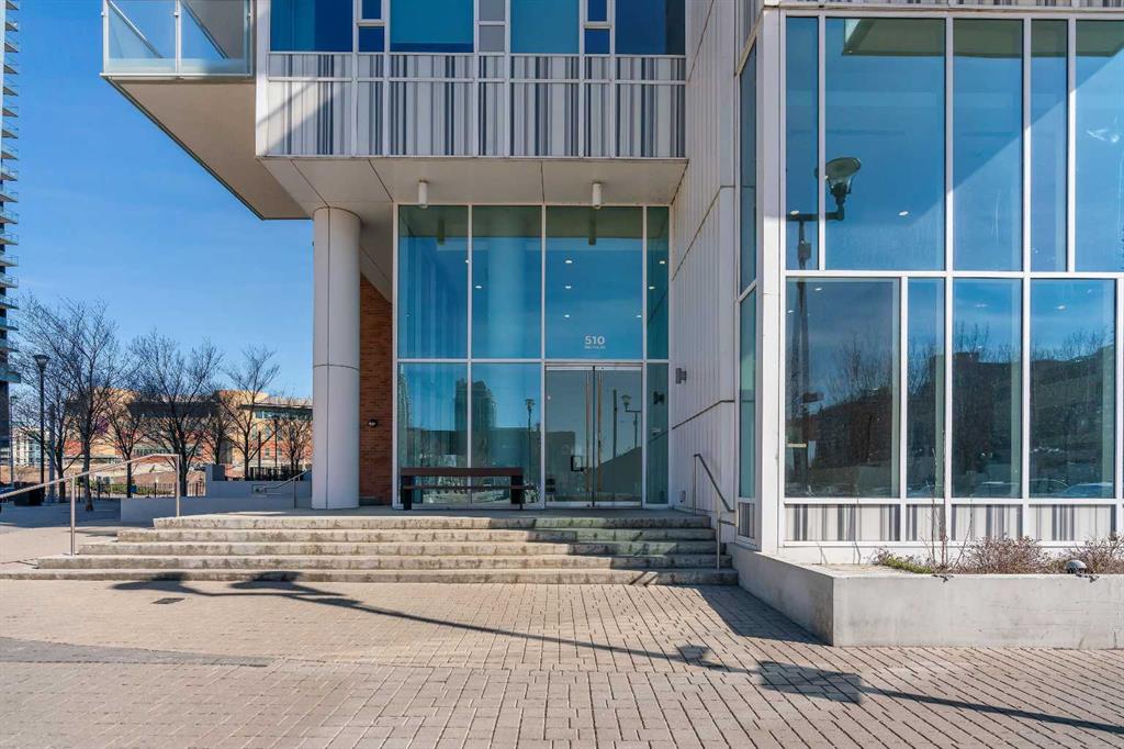 Life in East Village connects modern design with one of Calgary’s most dynamic urban settings, where river pathways, culture, and dining sit just steps from home. South exposure fills this upgraded residence with natural light while showcasing sweeping skyline views that define the downtown experience. An open-concept layout brings everyday living and entertaining together with ease, anchored by a chef-inspired kitchen designed for both function and style. Full-height cabinetry extends storage, granite countertops and matching backsplash create a seamless finish, while a gas stove adds precision for cooking at home. A peninsula island with breakfast bar seating encourages casual meals, conversation or a comfortable workspace. Floor-to-ceiling windows stretch across the living area, framing panoramic city views and drawing the outdoors in throughout the day. Evening hours transform the space into a front-row setting for Calgary Tower lights and Stampede fireworks, adding a sense of energy without leaving home. Rest comes easily in the bedroom where another wall of glass continues the view and creates a calm, light-filled retreat. A 4-piece bathroom pairs clean design with everyday functionality, while in-suite laundry adds practical convenience to daily routines. Step outside to a private balcony that invites summer barbeques or quiet moments overlooking the city skyline. Ownership here extends beyond the unit with access to a well-equipped fitness centre, steam room and sauna that support an active lifestyle. Social spaces include a resident lounge with kitchen and pool table, along with a second-level terrace and rooftop garden designed for gathering and relaxation. A 24-hour concierge adds security and convenience, ensuring packages and guests are handled with ease, while visitor parking accommodates friends and family. Walkability defines this location with the Bow River pathways, Central Library, Studio Bell, Stampede Grounds, and C-Train access all within minutes, along with grocery options, cafes, and a wide range of dining and nightlife along 17th Avenue. Urban living here balances connection, comfort and a view that continues to impress in every season.