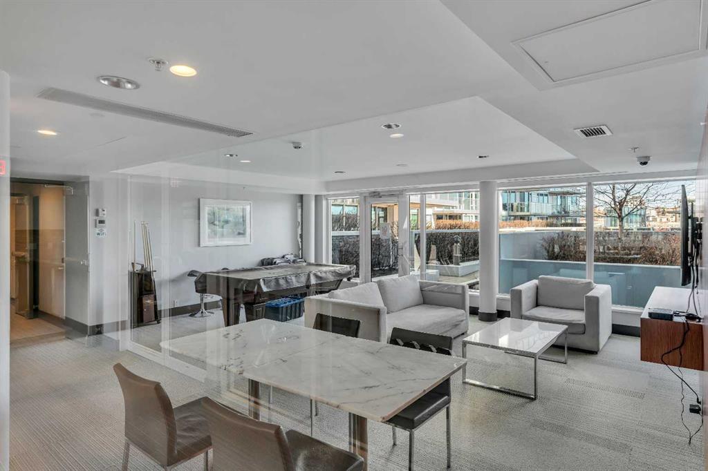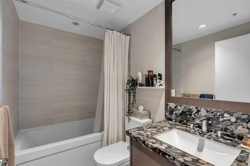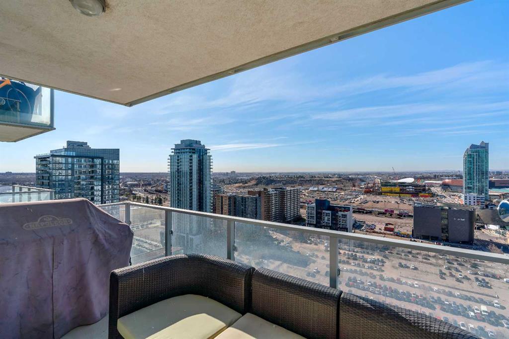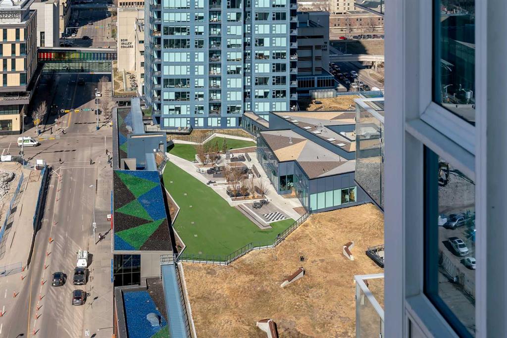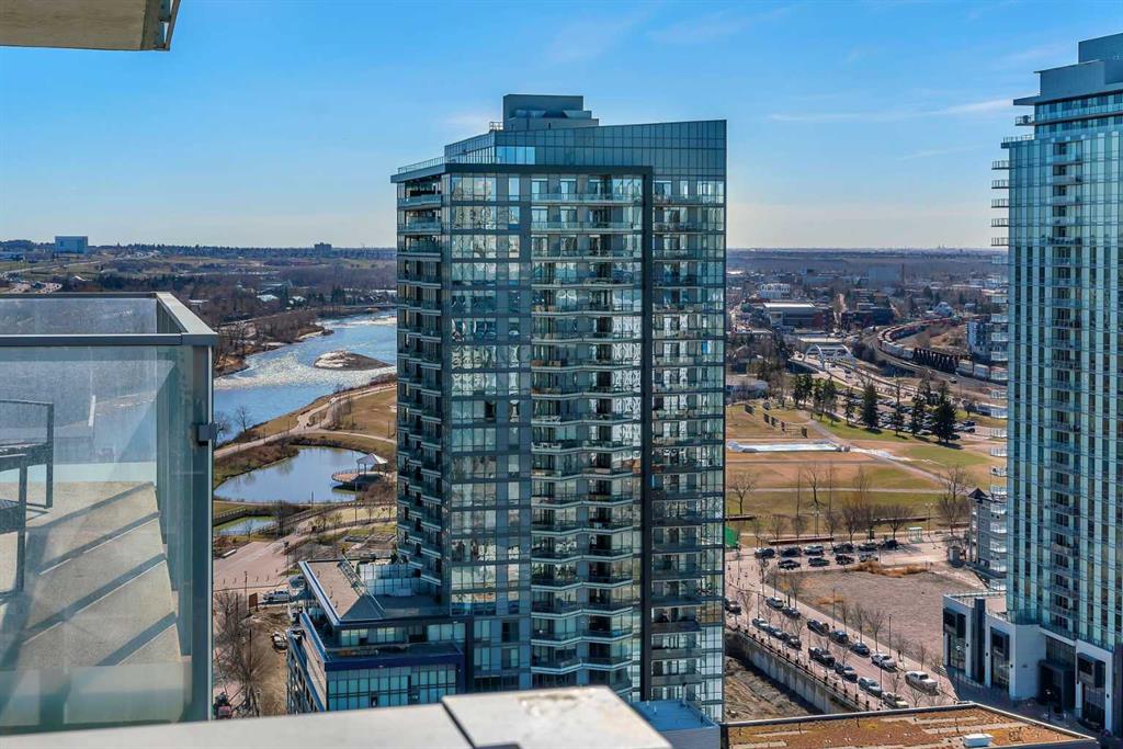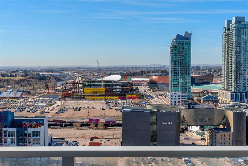 Life in East Village connects modern design with one of Calgary’s most dynamic urban settings, where river pathways, culture, and dining sit just steps from home. South exposure fills this upgraded residence with natural light while showcasing sweeping skyline views that define the downtown experience. An open-concept layout brings everyday living and entertaining together with ease, anchored by a chef-inspired kitchen designed for both function and style. Full-height cabinetry extends storage, granite countertops and matching backsplash create a seamless finish, while a gas stove adds precision for cooking at home. A peninsula island with breakfast bar seating encourages casual meals, conversation or a comfortable workspace. Floor-to-ceiling windows stretch across the living area, framing panoramic city views and drawing the outdoors in throughout the day. Evening hours transform the space into a front-row setting for Calgary Tower lights and Stampede fireworks, adding a sense of energy without leaving home. Rest comes easily in the bedroom where another wall of glass continues the view and creates a calm, light-filled retreat. A 4-piece bathroom pairs clean design with everyday functionality, while in-suite laundry adds practical convenience to daily routines. Step outside to a private balcony that invites summer barbeques or quiet moments overlooking the city skyline. Ownership here extends beyond the unit with access to a well-equipped fitness centre, steam room and sauna that support an active lifestyle. Social spaces include a resident lounge with kitchen and pool table, along with a second-level terrace and rooftop garden designed for gathering and relaxation. A 24-hour concierge adds security and convenience, ensuring packages and guests are handled with ease, while visitor parking accommodates friends and family. Walkability defines this location with the Bow River pathways, Central Library, Studio Bell, Stampede Grounds, and C-Train access all within minutes, along with grocery options, cafes, and a wide range of dining and nightlife along 17th Avenue. Urban living here balances connection, comfort and a view that continues to impress in every season.