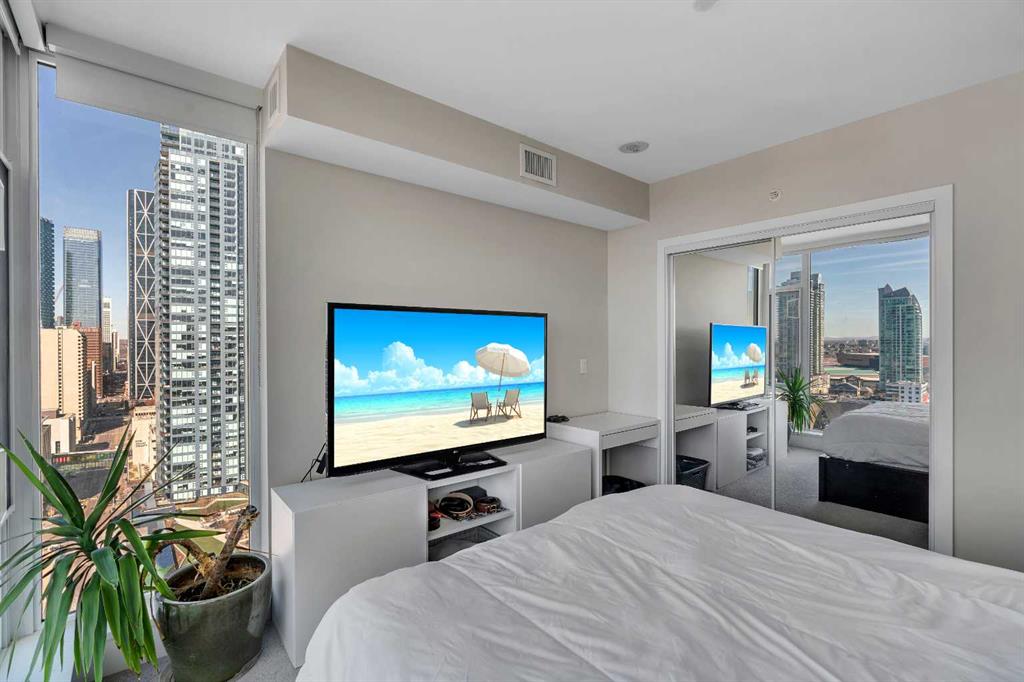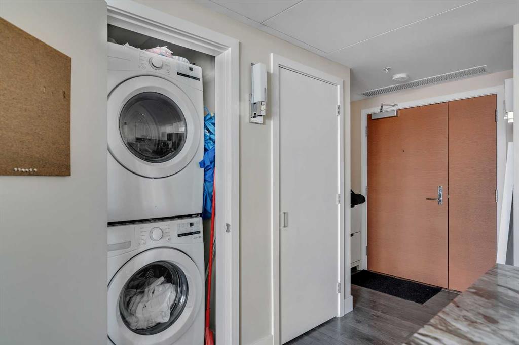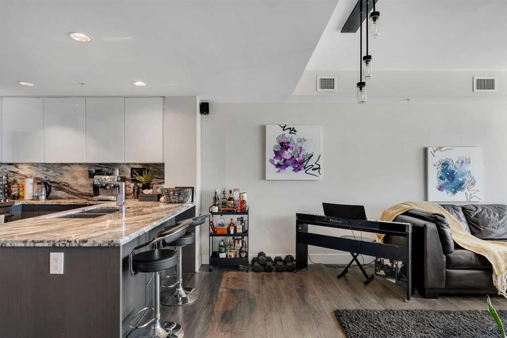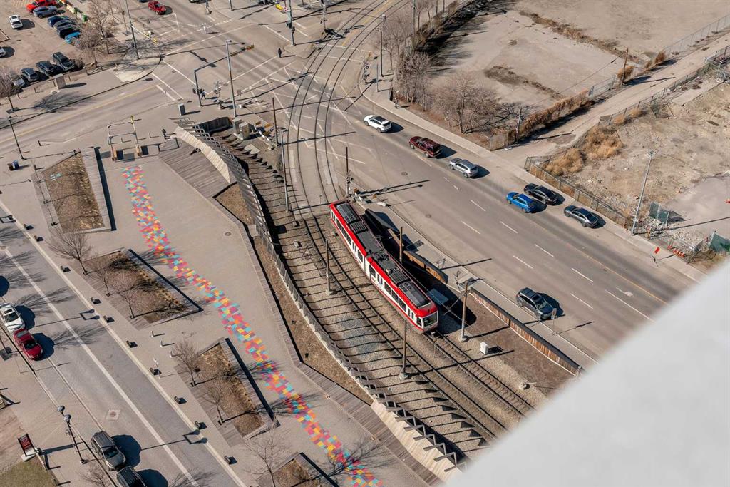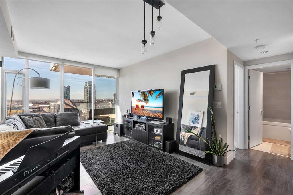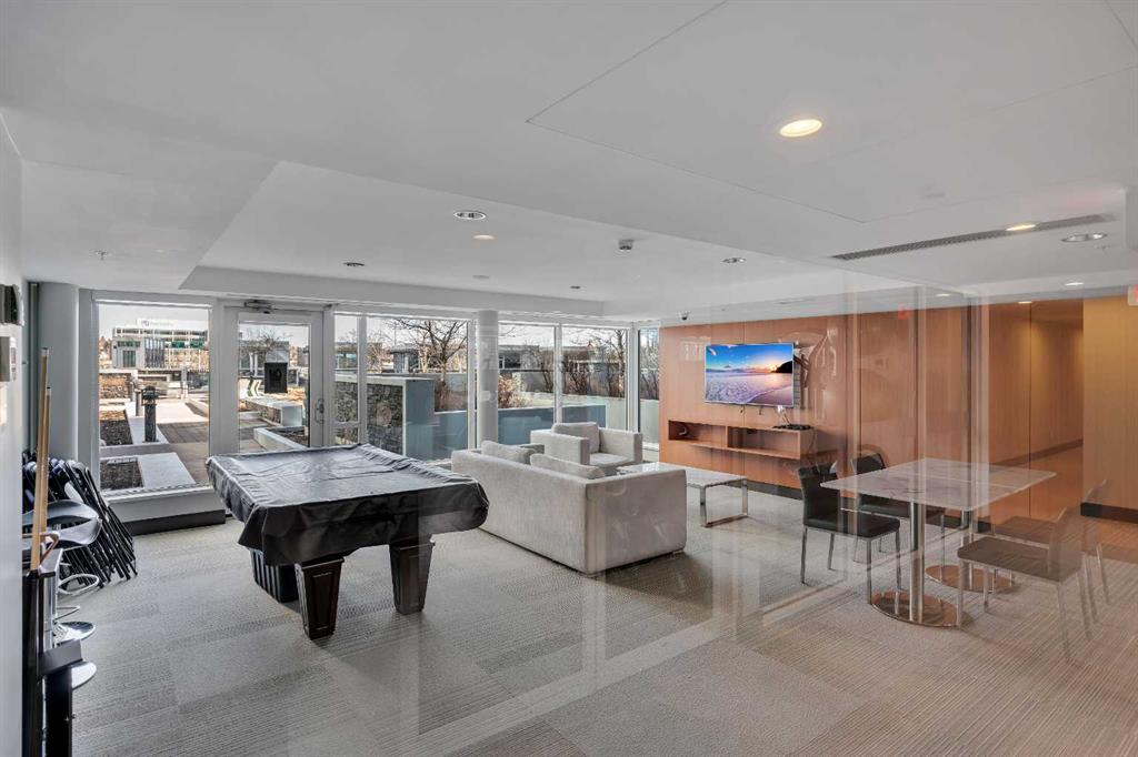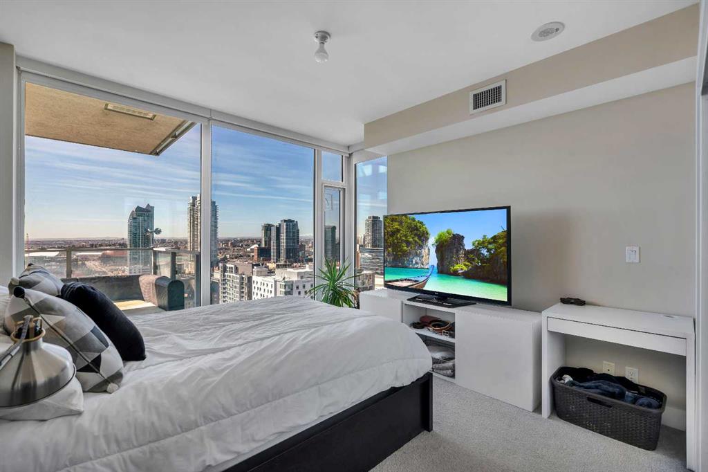 Life in East Village connects modern design with one of Calgary’s most dynamic urban settings, where river pathways, culture, and dining sit just steps from home. South exposure fills this upgraded residence with natural light while showcasing sweeping skyline views that define the downtown experience. An open-concept layout brings everyday living and entertaining together with ease, anchored by a chef-inspired kitchen designed for both function and style. Full-height cabinetry extends storage, granite countertops and matching backsplash create a seamless finish, while a gas stove adds precision for cooking at home. A peninsula island with breakfast bar seating encourages casual meals, conversation or a comfortable workspace. Floor-to-ceiling windows stretch across the living area, framing panoramic city views and drawing the outdoors in throughout the day. Evening hours transform the space into a front-row setting for Calgary Tower lights and Stampede fireworks, adding a sense of energy without leaving home. Rest comes easily in the bedroom where another wall of glass continues the view and creates a calm, light-filled retreat. A 4-piece bathroom pairs clean design with everyday functionality, while in-suite laundry adds practical convenience to daily routines. Step outside to a private balcony that invites summer barbeques or quiet moments overlooking the city skyline. Ownership here extends beyond the unit with access to a well-equipped fitness centre, steam room and sauna that support an active lifestyle. Social spaces include a resident lounge with kitchen and pool table, along with a second-level terrace and rooftop garden designed for gathering and relaxation. A 24-hour concierge adds security and convenience, ensuring packages and guests are handled with ease, while visitor parking accommodates friends and family. Walkability defines this location with the Bow River pathways, Central Library, Studio Bell, Stampede Grounds, and C-Train access all within minutes, along with grocery options, cafes, and a wide range of dining and nightlife along 17th Avenue. Urban living here balances connection, comfort and a view that continues to impress in every season.