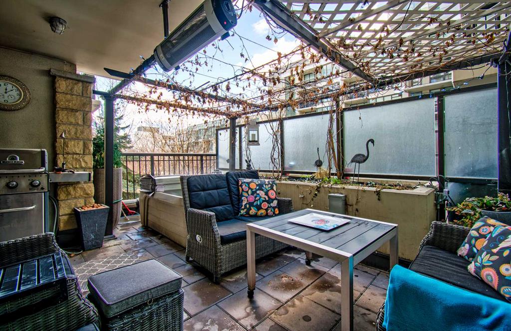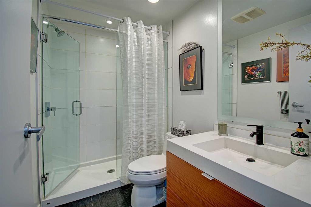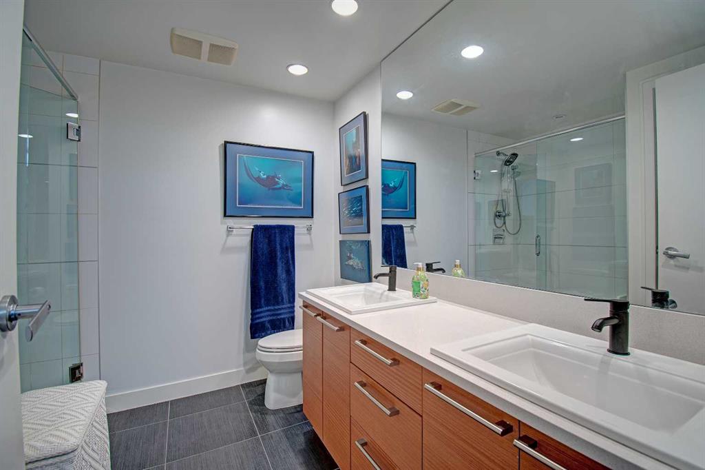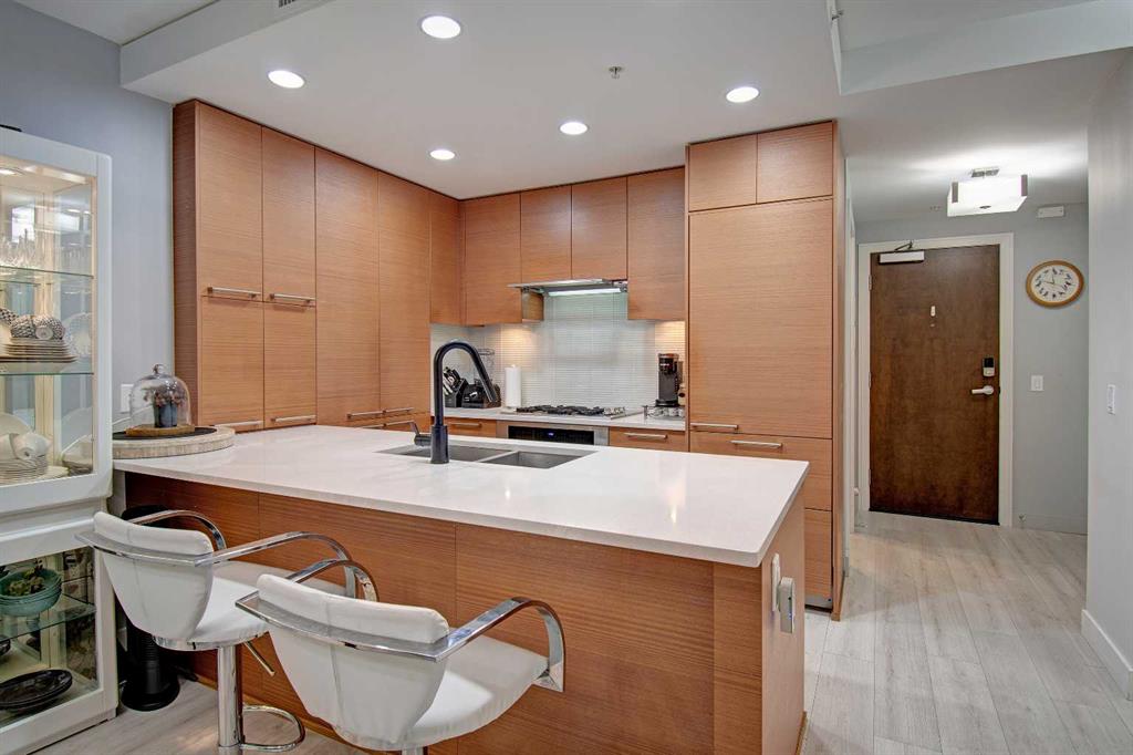 FINALLY, IT IS HERE FOR YOU!! WELCOME TO THIS EXQUISITE LUXURY CONDOMINIUM IN THE PRESTIGIOUS “WATERFRONT”. Unparalleled Living Experience in The Heart of The City. This Unit Makes It Perfect for Entertaining Guests or Enjoying Quiet Evenings at Home. OFFERING YOU SECURITY AND SAFETY SITUATED BETWEEN CALGARY’S DOWNTOWN CORE AND PRINCE’S ISLAND PARK. THIS IS A CONCRETE BUILDING With High End Finishes and Luxurious Amenities; Cleanliness Is The Motto Here. Concierge Service From 8:00am To 8:00pm Daily. Well Appointed Fitness Centre, Relaxing Hot Tub and Rejuvenating Steam Room, Party Room, Bicycle Storage and Awesome Theatre Room for Residents Use. Building Offers a Stylish Meeting Or Gathering Room Perfect for Hosting Events. UNIT HAS 9 FT CEILINGS AND THE COMFORT OF CENTRAL AIR. The Unit Features 2 BEDROOMS, 2 FULL BATHROOMS, Nice Closet Spaces. Primary Bedroom (Room for King Size Bed) With 4 Pc Ensuite. The Modern Kitchen Features Sleek Cabinetry, Pantry, High-End Stainless-Steel Appliances, Gas Top Stove and Ample Quartz Counterspace for Meal Preparation Featuring Dual Sinks. The Adjacent Dining and Living Room with Gas Fireplace Beckons You to Relax. THERE ARE PATIO DOOR EXITS FROM BOTH THE PRIMARY BEDROOM AND THE LIVING ROOM TO A LARGE BALCONY WHERE YOU ENJOY THE VIEW OF THE IMPRESSIVE OUTDOOR COURTYARD. BALCONY HAS OVERHEAD HEATING LAMPS PLUS GAS OUTLET FOR BBQ. The IN-SUITE LAUNDRY Completes The Unit Space with The Stacked Washer & Dryer to Stay. Separate Assigned Storage Locker On Same Floor as Unit as Well As A Private Guest Suite #253. BONUS: TWO ASSIGNED UNDERGROUND AND HEATED PARKING STALLS #697 AND #883 (RARE FIND). THERE IS VISITOR HEATED UNDERGROUND PARKING ON LEVEL P1 AS WELL AS 2 CAR WASH BAYS. With Easy Access to The Extensive River Walking Pathway System. If You Are Looking for A Special Retreat, Privacy and Safety – This Is It and You Can Proudly Call This Your Home. QUIET, SECURE BUILDING WITH SO MANY AMENITIES!! THE BEST OF URBAN LIVING. (See Video of This Listing!)