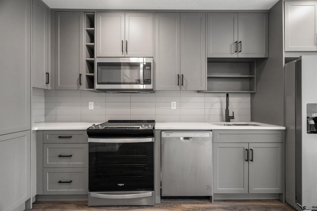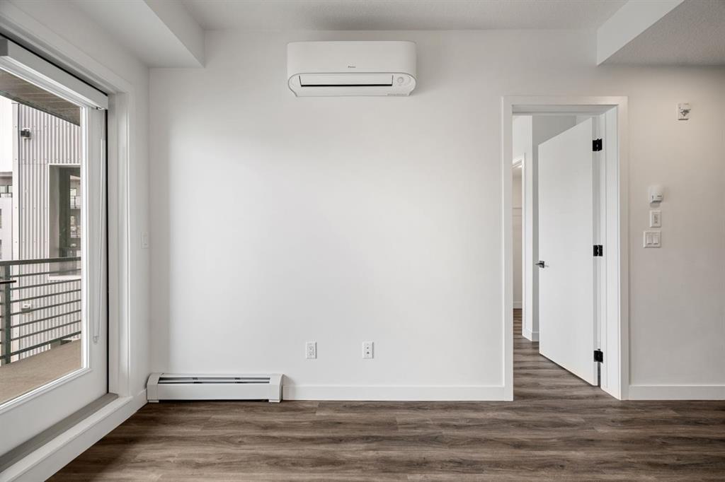 Step inside to discover an open-concept layout that maximizes space and natural light. The kitchen is thoughtfully designed with quartz countertops, sleek full-height cabinetry with soft-close doors, and stainless steel Whirlpool appliances, making it both functional and stylish. The living and dining area flows seamlessly onto a generous west-facing balcony, that includes a built-in gas line for BBQs — an inviting space for entertaining or simply enjoying sunsets.