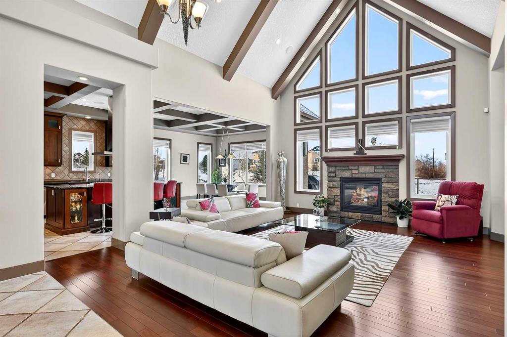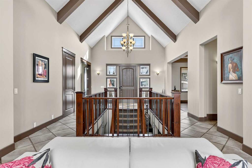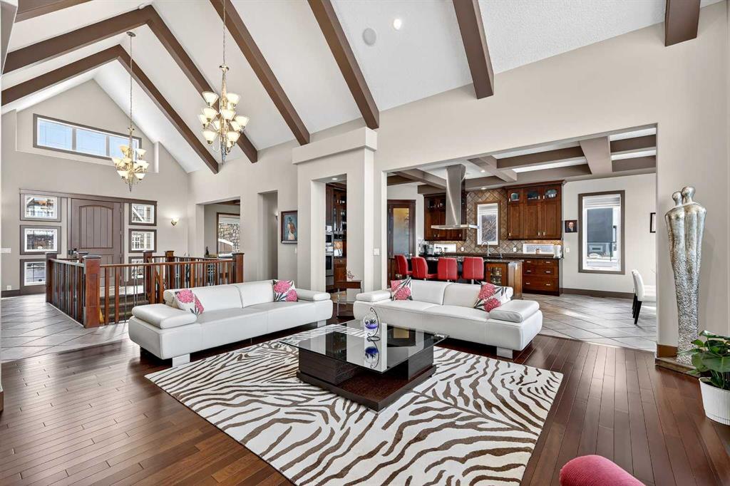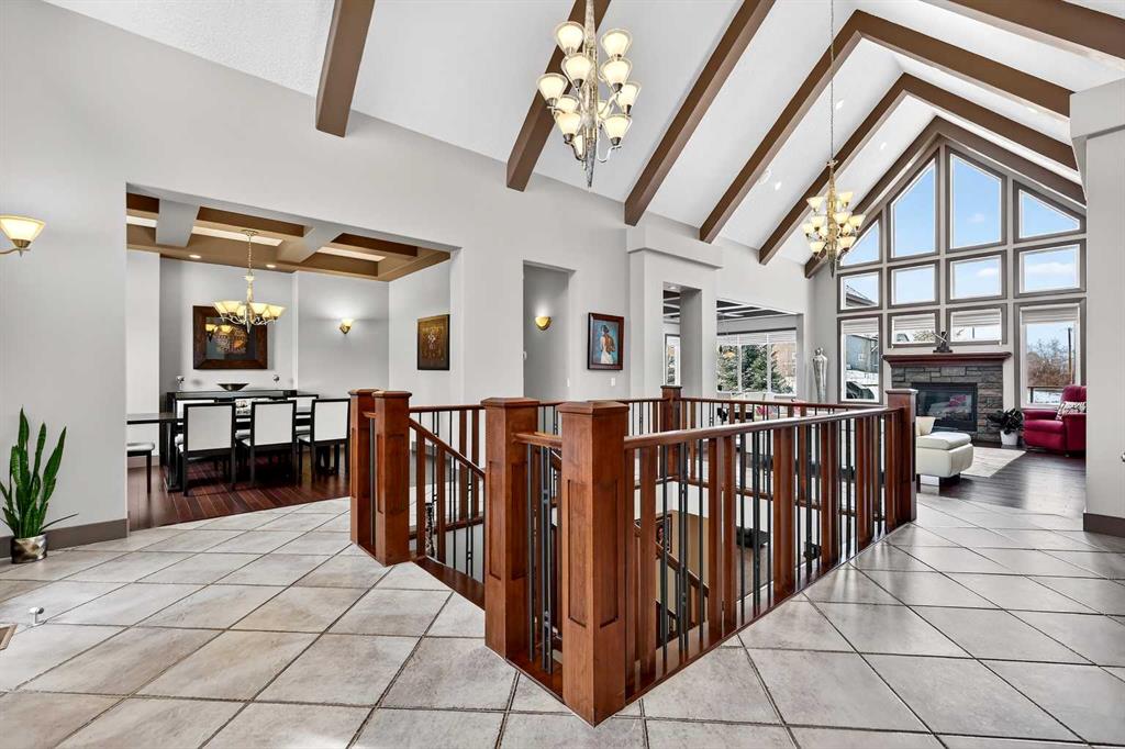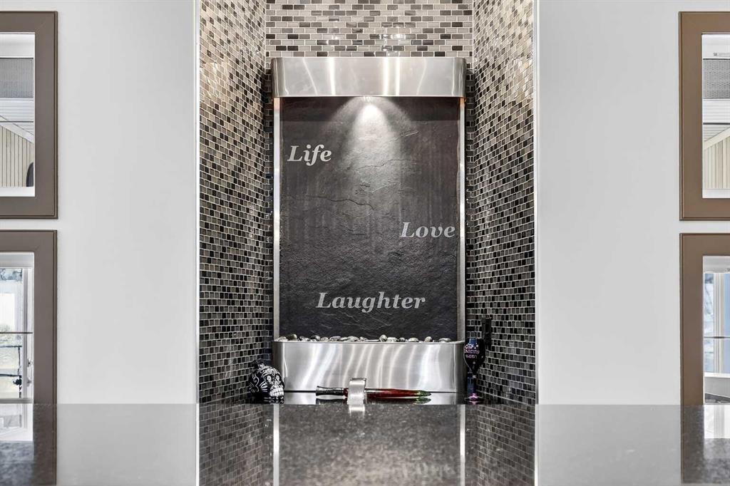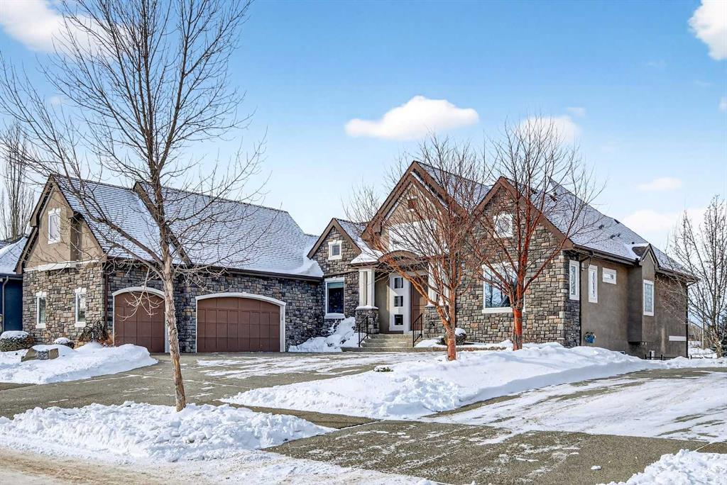 Welcome to an extraordinary walkout bungalow in the prestigious community of Heritage Pointe — a residence of architectural significance and uncompromising quality, offering over 4,200 sq. ft. of exquisitely developed living space in a serene, estate setting. From the moment you enter, soaring nearly 20-foot vaulted ceilings with dramatic exposed beam structures draw your eyes upward, creating a breathtaking first impression. A grand, central staircase elegantly anchors the home and sets the tone for the refined design carried throughout. The main living area is nothing short of spectacular — a massive great room framed by three tiers of stunning windows that flood the space with natural light while accentuating the dramatic ceiling lines. A striking central fireplace adds warmth and balance. A formal dining room with coffered ceiling sits on one side, while a spacious executive den or office on the other provides the perfect work-from-home retreat. Designed for elevated entertaining, the chef’s kitchen features a statement island with professional Thermador gas cooktop and Faber island-mounted canopy hood. Premium built-in appliances include a Miele steam oven, Bosch convection microwave, wall oven with warming drawer (2023), a 42” built-in KitchenAid refrigerator, and LG dishwasher (2023). A generous walk-in pantry and a bright breakfast nook with coffered ceiling overlooking the backyard complete this exceptional culinary space. The primary retreat is a private sanctuary, offering direct access to the upper deck and a spa-inspired ensuite with an oversized central soaker tub set beneath an arched ceiling feature, dual vanities, an expansive tiled shower with bench and glass enclosure, built-in cabinetry, water closet, and a spacious walk-in closet. Descend the showpiece staircase to a spectacular lower level designed for leisure and entertaining. A stunning custom bar with classic martini pendant lighting, dual televisions, and an elegant water feature creates a refined lounge atmosphere. The expansive recreation area, dedicated media room, and two additional bedrooms — each with walk-in closets and connected by a beautifully appointed Jack-and-Jill bath with dual vanities and oversized shower — offer exceptional space for family and guests alike. Year-round enjoyment awaits in the fully enclosed sunroom featuring a hot tub and access to the patio. The professionally landscaped backyard is a private oasis with mature trees, a water feature, putting green, and tranquil greenspace with walking path beyond. Completing the home is an oversized triple attached heated garage with epoxy flooring, built-in cabinetry, and wheelchair lift. An aggregate driveway, gemstone lighting, and timeless stone accents further elevate the curb appeal. Set within a coveted lake community where nature surrounds you and peaceful luxury defines daily life, this is a truly sophisticated estate — designed to impress and destined to be cherished.