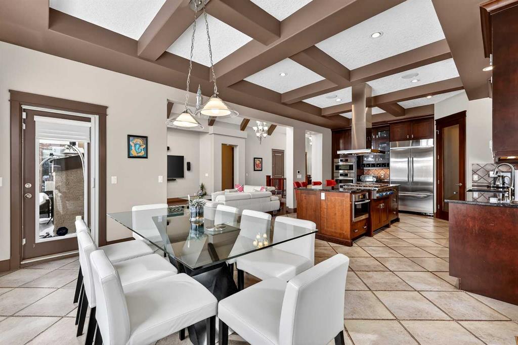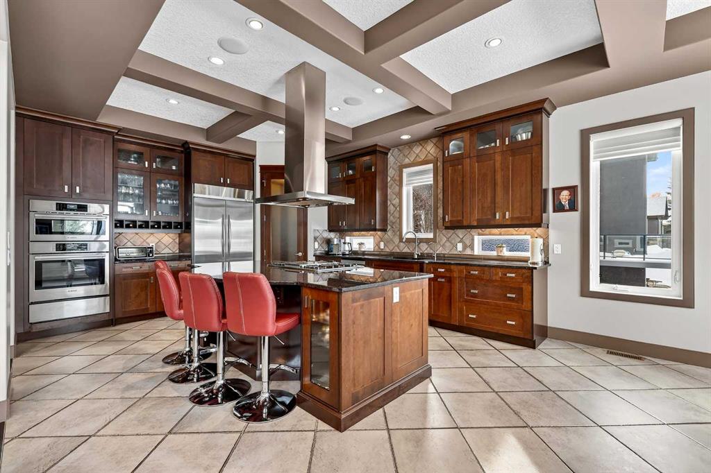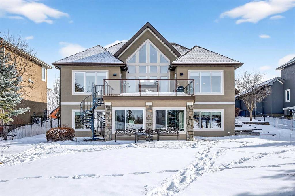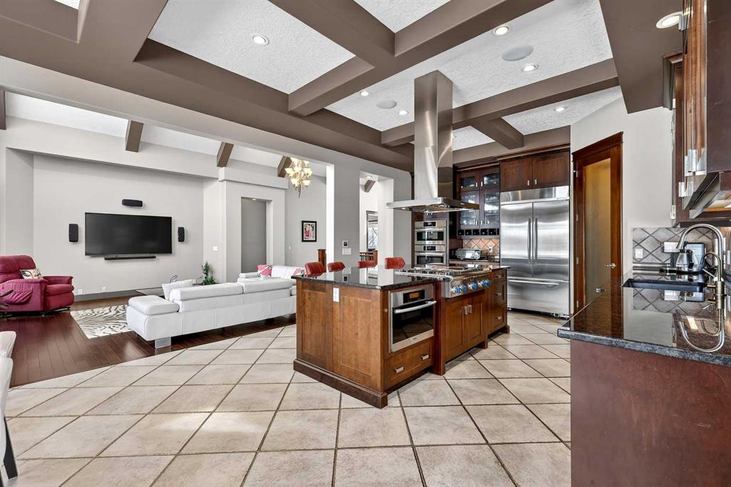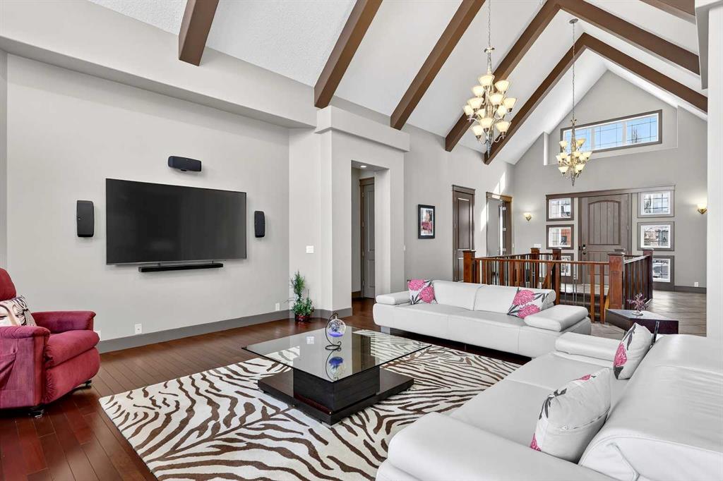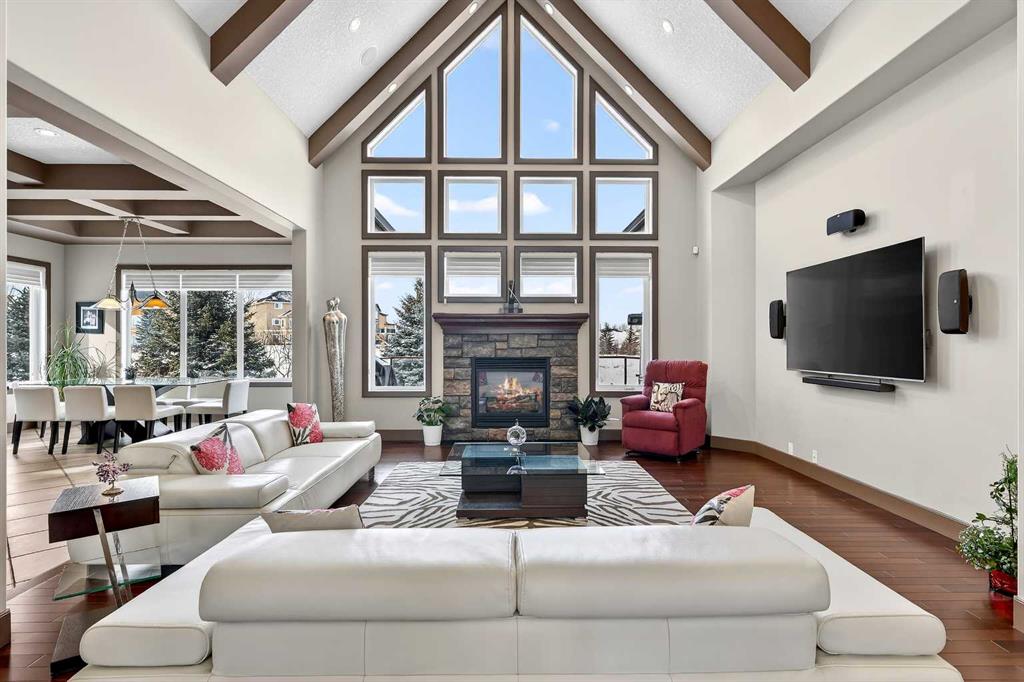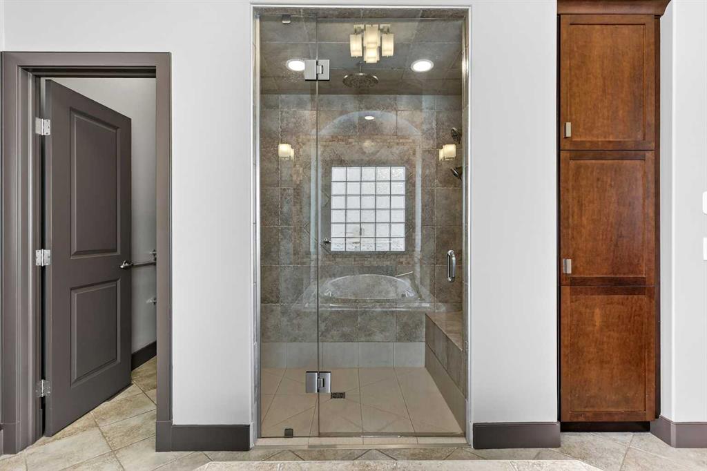 Welcome to an extraordinary walkout bungalow in the prestigious community of Heritage Pointe — a residence of architectural significance and uncompromising quality, offering over 4,200 sq. ft. of exquisitely developed living space in a serene, estate setting. From the moment you enter, soaring nearly 20-foot vaulted ceilings with dramatic exposed beam structures draw your eyes upward, creating a breathtaking first impression. A grand, central staircase elegantly anchors the home and sets the tone for the refined design carried throughout. The main living area is nothing short of spectacular — a massive great room framed by three tiers of stunning windows that flood the space with natural light while accentuating the dramatic ceiling lines. A striking central fireplace adds warmth and balance. A formal dining room with coffered ceiling sits on one side, while a spacious executive den or office on the other provides the perfect work-from-home retreat. Designed for elevated entertaining, the chef’s kitchen features a statement island with professional Thermador gas cooktop and Faber island-mounted canopy hood. Premium built-in appliances include a Miele steam oven, Bosch convection microwave, wall oven with warming drawer (2023), a 42” built-in KitchenAid refrigerator, and LG dishwasher (2023). A generous walk-in pantry and a bright breakfast nook with coffered ceiling overlooking the backyard complete this exceptional culinary space. The primary retreat is a private sanctuary, offering direct access to the upper deck and a spa-inspired ensuite with an oversized central soaker tub set beneath an arched ceiling feature, dual vanities, an expansive tiled shower with bench and glass enclosure, built-in cabinetry, water closet, and a spacious walk-in closet. Descend the showpiece staircase to a spectacular lower level designed for leisure and entertaining. A stunning custom bar with classic martini pendant lighting, dual televisions, and an elegant water feature creates a refined lounge atmosphere. The expansive recreation area, dedicated media room, and two additional bedrooms — each with walk-in closets and connected by a beautifully appointed Jack-and-Jill bath with dual vanities and oversized shower — offer exceptional space for family and guests alike. Year-round enjoyment awaits in the fully enclosed sunroom featuring a hot tub and access to the patio. The professionally landscaped backyard is a private oasis with mature trees, a water feature, putting green, and tranquil greenspace with walking path beyond. Completing the home is an oversized triple attached heated garage with epoxy flooring, built-in cabinetry, and wheelchair lift. An aggregate driveway, gemstone lighting, and timeless stone accents further elevate the curb appeal. Set within a coveted lake community where nature surrounds you and peaceful luxury defines daily life, this is a truly sophisticated estate — designed to impress and destined to be cherished.
