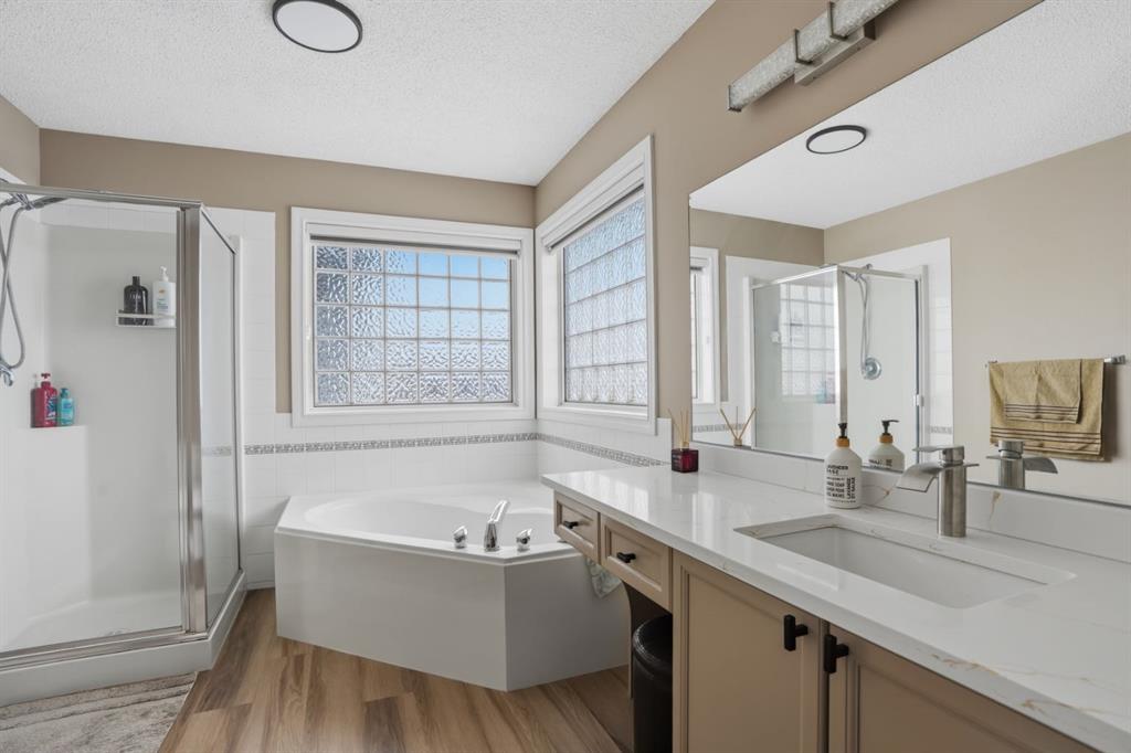 Upstairs you’ll find three generously sized bedrooms and two full bathrooms, including a comfortable primary retreat with its own ensuite, while the additional bedrooms share a well-appointed full bathroom. The ensuite bathroom has a deep soaking tub, walk-in shower and an extended single vanity with a make-up counter.