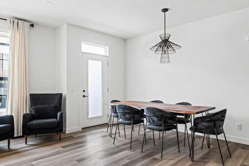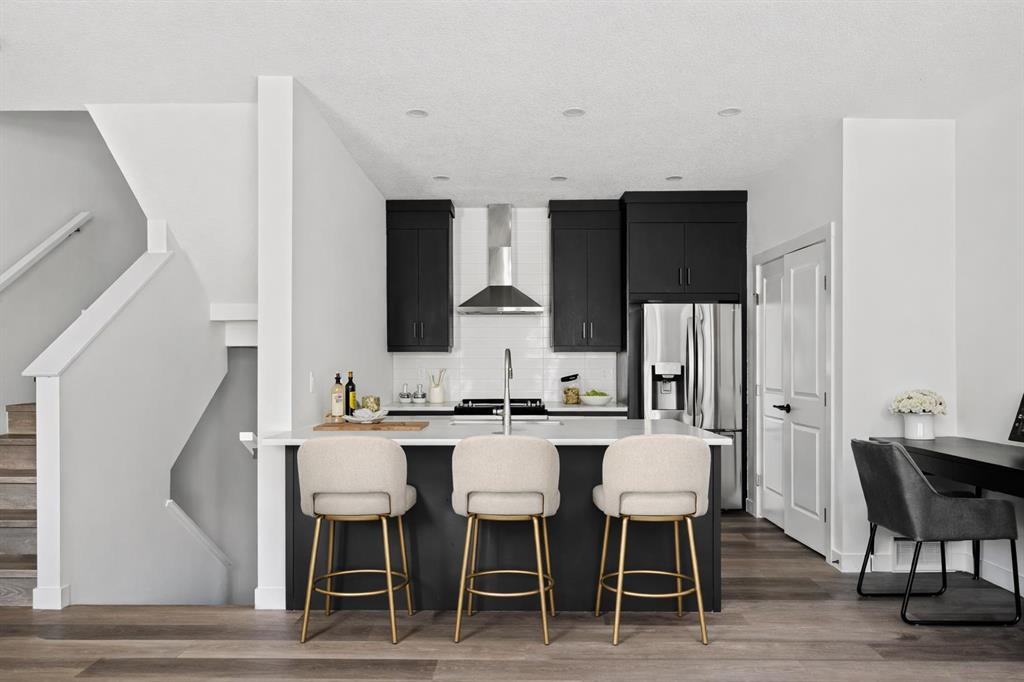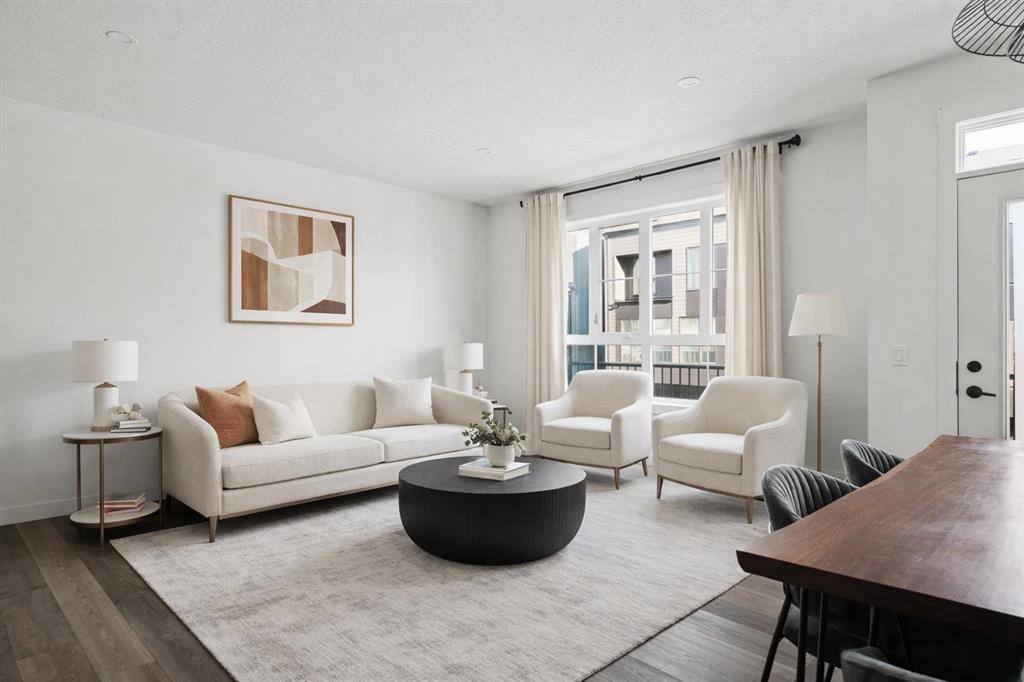 Welcome home to this beautifully maintained townhome in Crown Park, Calgary’s newest inner-city community. Offering over 1,400 sq. ft. of thoughtfully designed living space, this home features 2 bedrooms, 2.5 bathrooms, a private single attached garage, and a convenient driveway for additional parking. This well-appointed 3-storey townhome showcases an open-concept floor plan designed for both everyday living and entertaining. The layout places the kitchen between the living room and dining area, creating a seamless flow throughout the main level, ideal for entertaining or for families with children. The kitchen is finished with full-height soft-close cabinetry, quartz countertops, a large pantry, and a stainless-steel appliance package that includes an electric range, chimney hood fan, and built-in microwave. Just off the dining area is access to a spacious private balcony spanning the entire width of the home, perfect for outdoor relaxation or hosting guests. Luxury vinyl plank flooring runs throughout the main level, while large windows and 9-foot ceilings enhance the bright, inviting atmosphere. The same luxury vinyl plank flooring continues up the stairs and throughout the upper level, offering a carpet-free interior that is both pet-friendly and easy to maintain. Upstairs, the primary bedroom features a walk-through wardrobe and private ensuite complete with a walk-in shower. A second generously sized bedroom, an additional full bathroom, and convenient upper-level laundry complete the upper floor. The main entry level includes a welcoming foyer with a coat closet and access to a discreetly located 2-piece powder room for guests. Situated in the highly desirable Crown Park community, this home offers an exceptional location near Shaganappi Golf Course, walking trails along the Bow River, transit access, and a wide array of nearby dining, shopping, and entertainment amenities. Perfect for professionals, couples, or downsizers seeking low-maintenance living in a prime inner-city setting.