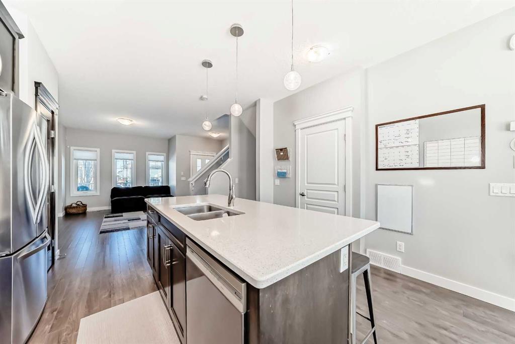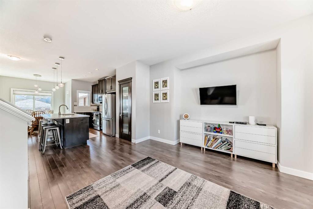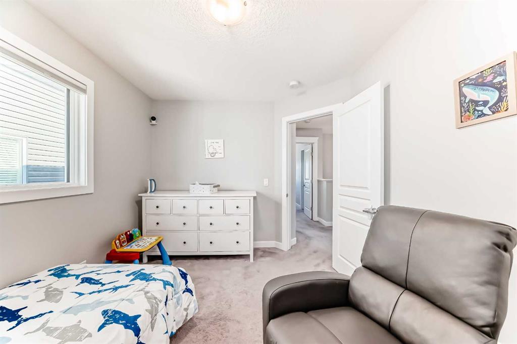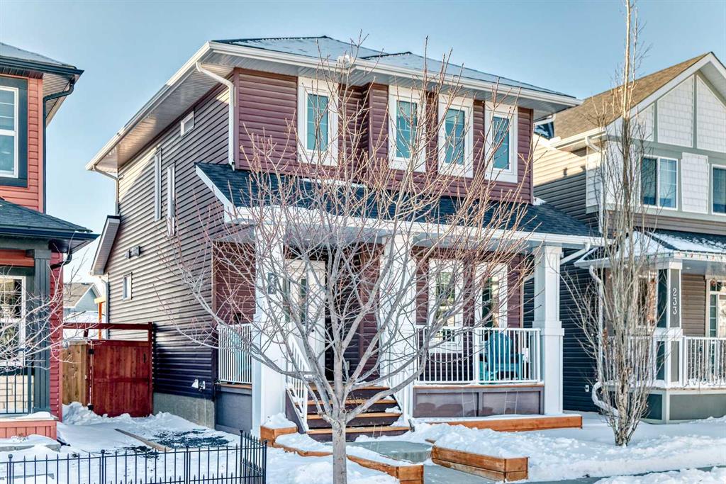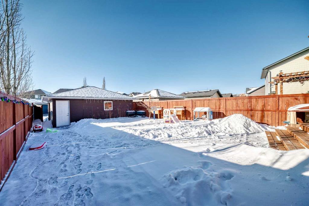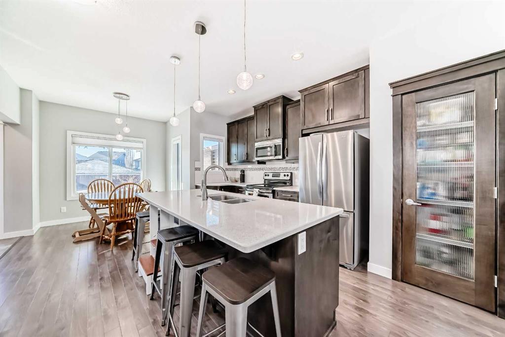 Perfect home for first time owners or a growing family, 2015 vintage 3+ bedroom 2 storey in Airdrie’s district of Ravenswood. Lovely curb appeal with covered veranda. Upgraded wood laminate flooring on main floor with tiled front and rear entries. Large and spacious kitchen with 8 foot working island, separate pantry, 9 ft ceilings and tall cabinetry, dining room nook over looks rear yard, spacious great room expanding into flex space before kithen area, main floor laundry room with storage space. 3 Bedroom upstairs, 4 pce ensuite plus 4 pce for other bedrooms, All bedrooms have walk-in closets. Huge lot (142 ft+ long lot with sunny western exposure). Rear yard b. house and garage is about 65 ft long and 30 ft wide., lots of room for children or adults to play. Huge 16 ft X 18 ft wood deck with pergola, small decorative rocked side yards for low maintenance. Completely fenced lot. Basement fully dev’d with 9 foot ceilings, raised floors with laminate flooring, an office/bedroom, large recreation room, large storage room. High efficient furnace, A/C, over sized water heater for future teenagers. Oversized double garage 24 ft wide and 22 ft deep. Large lots are rare without backing onto busy locations.