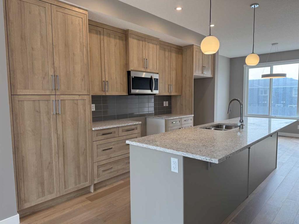 The contemporary kitchen is beautifully appointed with quartz countertops, ample cabinetry, a central island, and a premium builder-grade stainless steel appliance package, flowing seamlessly into the dining nook and great room, making the space ideal for both daily living and entertaining…