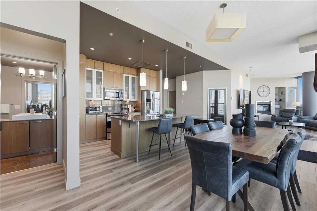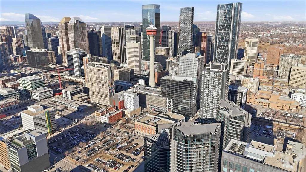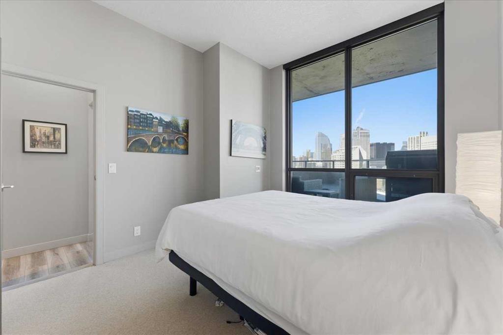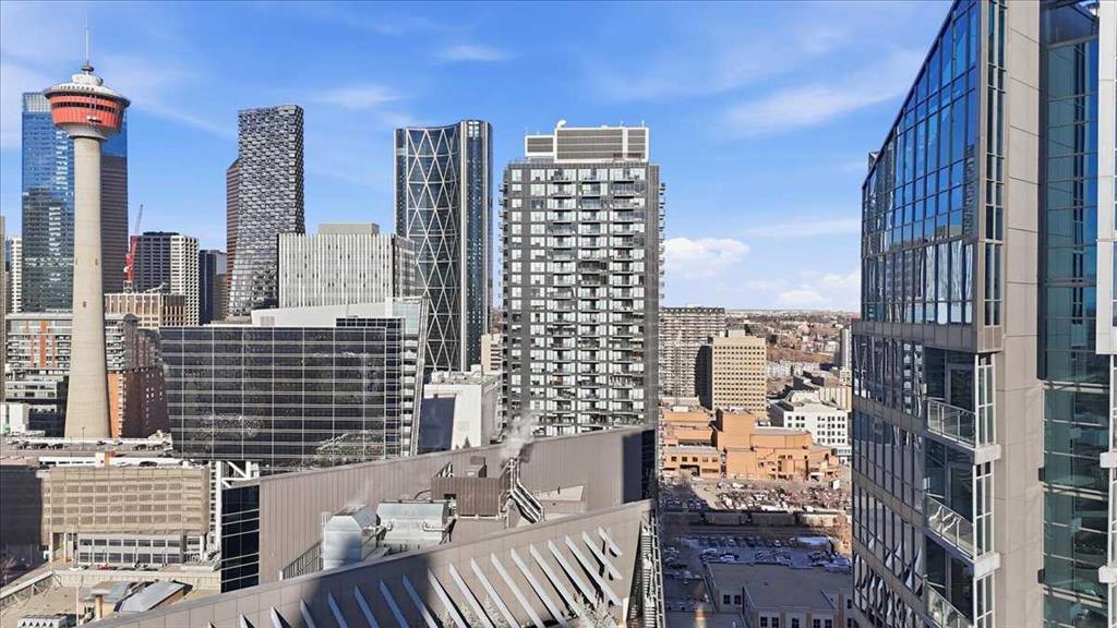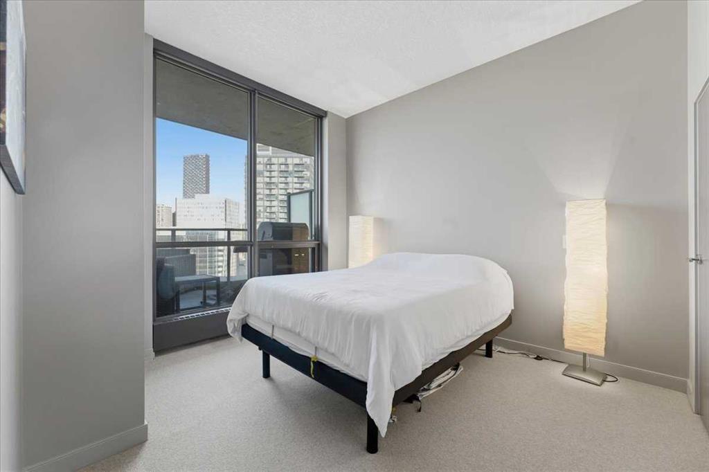 Situated in the heart of Beltline, Keynote One offers ultra convenient downtown living just steps to Stampede Park, BMO Centre, and Calgary’s Saddledome. This Sub-Penthouse unit offers soaring floor to ceiling windows, OVERSIZED balcony, additional second balcony off the master bedroom, with breath-taking views of the cities’ skyline. One of the rare chances to own a unit offering TWO TITLED VIP parking stalls right next to the elevator. Upgrades include new Vinyl Plank flooring, washer/dryer, water filtration system (ion filter), and new sink. Open concept, modern and industrial describe the vibe of this layout featuring TWO bed / TWO baths, boasting unbeatable privacy and functionality. Lie in your master retreat, enjoy the two-way fireplace, soak in the first- class views of the Calgary Tower and city skyline. Feel the grandness of the master ensuite with second balcony, double sinks, separate shower, massive tub, and OVER-SIZED double walk -in closet with custom California Closet built -ins. Keynote offers an on-site manager, access to the fully equipped fitness facilities (weights and cardio room), two guest suites, owner’s lounge with TVs, pool table, partial kitchen, BBQs, outdoor patio, plus 15 rooftop oasis, bike storage, and direct access to Sunterra Market. This unbeatable location offers high-quality living, the Plus 15 Skywalk system, and easy access to main thoroughfares for city-wide access. Weather you are looking for your next home or a prime investment opportunity, this is downtown living done right.