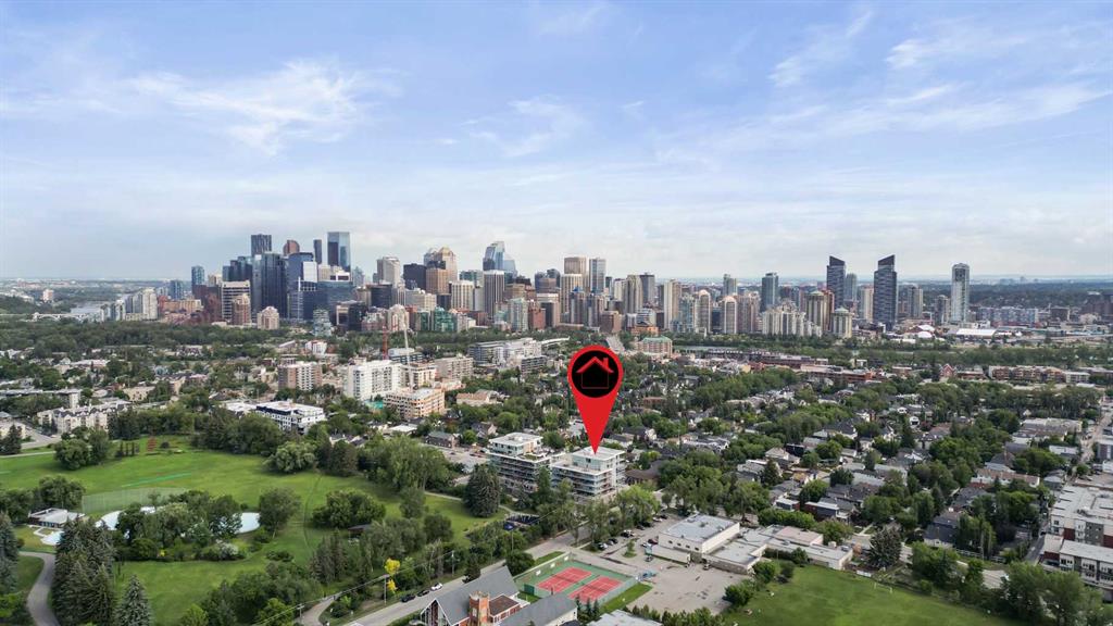 Welcome to Ezra on Riley Park, a truly unique address in the heart of Hillhurst, where stylish city living meets the serenity of nature. Nestled along the edge of the iconic Riley Park, this sophisticated 2-bedroom, 2-bath condo offers a rare opportunity to experience the best of inner-city Calgary—with breathtaking views, upscale design, and unmatched walkability. From the moment you step inside, you’ll feel the difference. A spacious foyer welcomes you with beautiful textured engineered hardwood flooring, leading you into a thoughtfully designed open-concept living space filled with natural light streaming in through floor-to-ceiling windows. This home is perfectly framed by views of the lush greenspace just beyond, creating a seamless connection between indoor luxury and outdoor beauty. The kitchen and living area blend harmoniously, surrounded by oversized windows and double French sliding doors that open onto an expansive wrap-around balcony—an incredible outdoor living space measuring over 59 feet in total length, ideal for morning coffee, evening cocktails, or relaxing in your private oasis above the park. The modern kitchen boasts sleek stainless steel appliances, stylish white cabinetry with fridge panels to match, elegant glass tile backsplash, durable and beautiful silgranite sink and quartz countertops for a clean, contemporary finish. Both bedrooms are bright and inviting, featuring built-in closet organizers and a soft, modern color palette. The primary suite enjoys its own wing of the wraparound balcony and a private 4-piece ensuite, complete with classic tile flooring, full tile shower and tub combo and quartz vanity with undermount sink and built-in vanity. The second full bathroom, located near the entry for guests or family, mirrors the home’s elevated aesthetic. You’ll also appreciate the in-suite laundry room, central air conditioning, and ample storage throughout. Additional highlights include a titled underground parking stall in a secure, heated parkade, assigned storage locker, access to a premium fitness centre and chic party room with your very own wine locker, pet-friendly and impeccably maintained building. Beyond your doorstep is the best of Calgary’s urban lifestyle. Riley Park as your backyard, complete with a cricket pitch, wading pool, new playground, and the Senator Patrick Burns Rock Garden. Steps from the Hillhurst Sunnyside community centre with tennis courts, weekly farmer’s markets, and live music. Easy stroll to the Kensington shopping district, Bow River pathways, SAIT, Jubilee Auditorium, cafés, transit, and the downtown core Ezra on Riley Park is more than a condo—it’s a lifestyle of tranquility, convenience, and contemporary charm in one of Calgary’s most vibrant, connected neighborhoods. Don’t miss this rare opportunity to live stylishly above the park—schedule your private showing today.