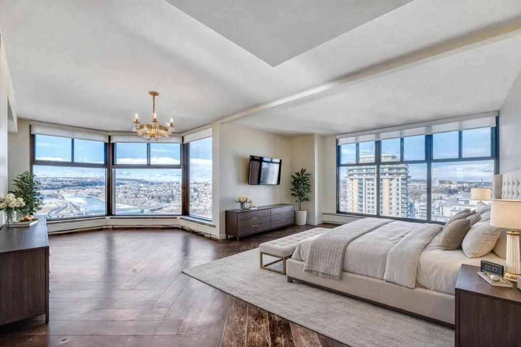 Perched on the 24th floor of Westmount Place, this just over 2,400 square foot residence delivers a level of space, privacy, and sophistication rarely found in downtown Calgary. Floor-to-ceiling windows showcase unobstructed views of the Bow River, city skyline, and the Rocky Mountains, creating a breathtaking backdrop day and night.