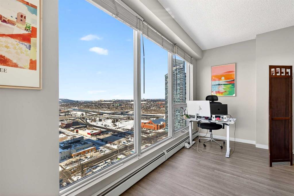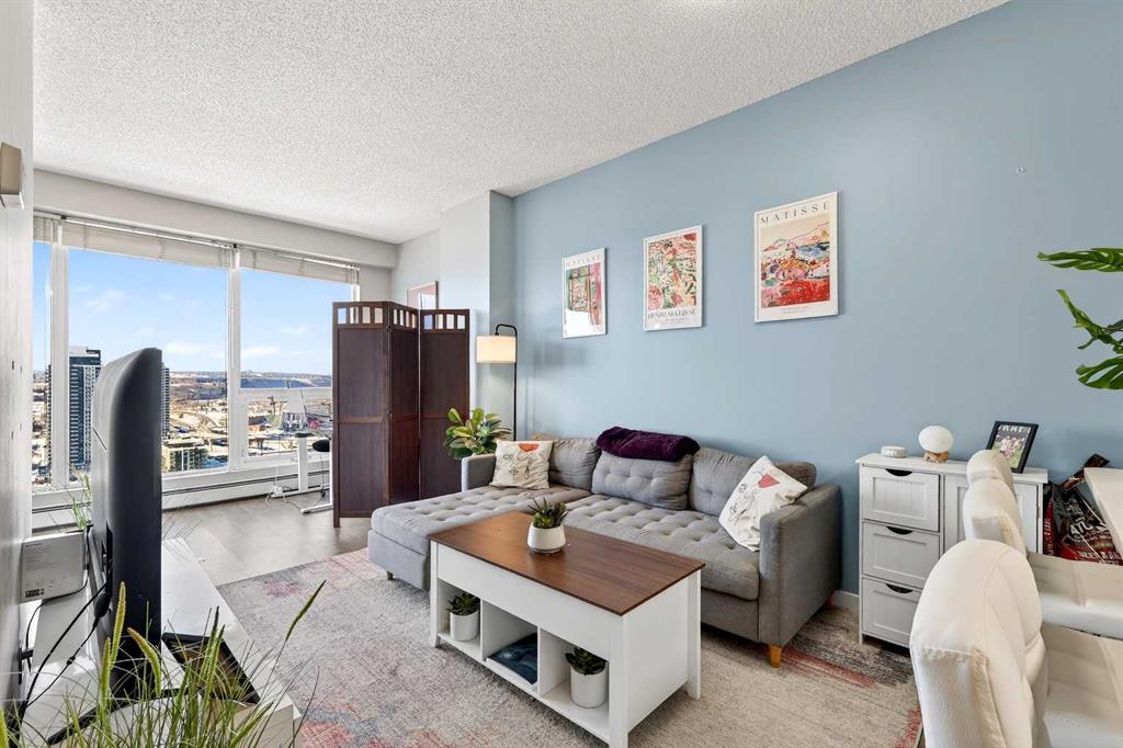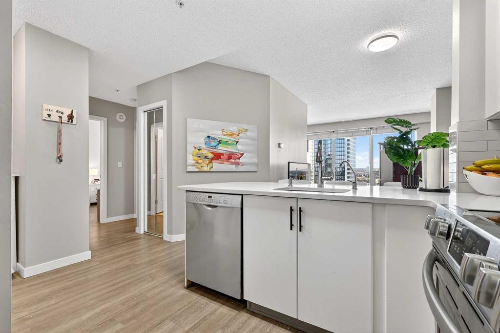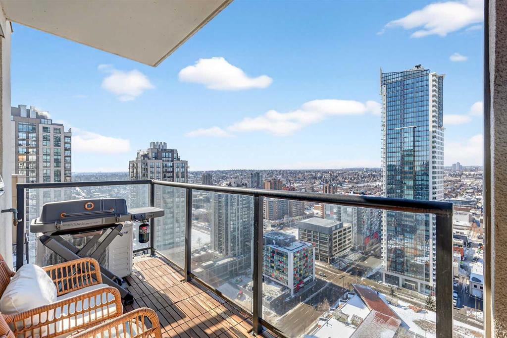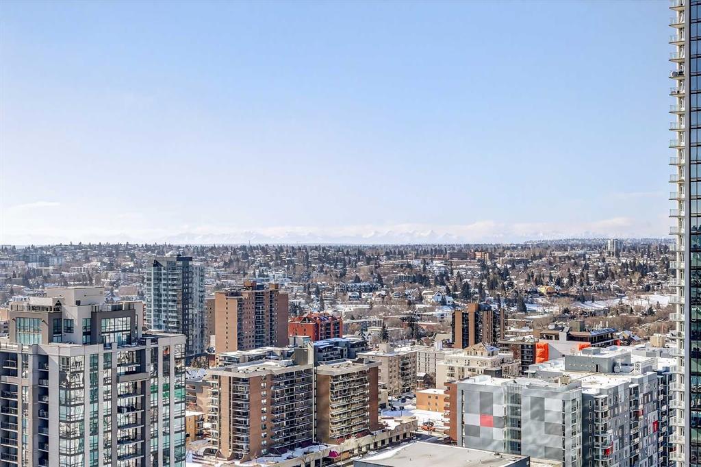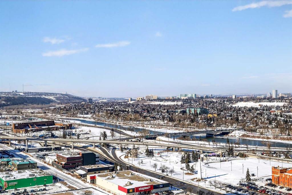 Take in breathtaking mountain and Bow River views from the 24th floor of the highly desirable Vantage Pointe. This beautifully updated two bedroom, two bathroom condo offers the ideal blend of comfort, style, and unbeatable inner city convenience. Perfectly positioned just steps from Calgary Co-op and within easy walking distance to downtown and the vibrant energy of Uptown 17th Avenue, you will love the incredibly walkable lifestyle. Restaurants, cafés, shopping, and everyday amenities are all right at your doorstep. Inside, the modern kitchen showcases stainless steel appliances and quartz countertops, seamlessly connecting to the bright, open concept living area. Expansive windows flood the space with natural light while perfectly framing the stunning mountain and river views. Additional features include in suite laundry, air conditioning, and a private balcony with a gas BBQ hookup that is ideal for relaxing or entertaining. This pet friendly building offers a fitness centre, secure entry, visitor parking, and an impressive lobby. A titled underground parking stall is included, and the low condo fees cover heat, electricity, water, sewer, and parking, ensuring easy, worry free ownership. An exceptional opportunity for a first time buyer, a professional working downtown, or an investor seeking a prime rental property in a sought after location. Enjoy elevated urban living with spectacular views every day.