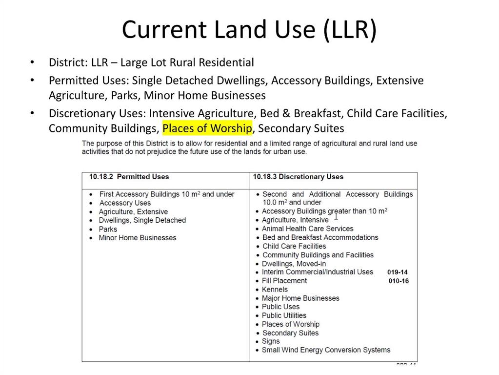 Currently zoned LLR, Large Lot Rural Residential, the land permits single detached homes, accessory buildings, and agriculture, with discretionary uses such as child-care facilities, B&B operations, community buildings, and places of worship. A land use redesignation is already underway, proposing: