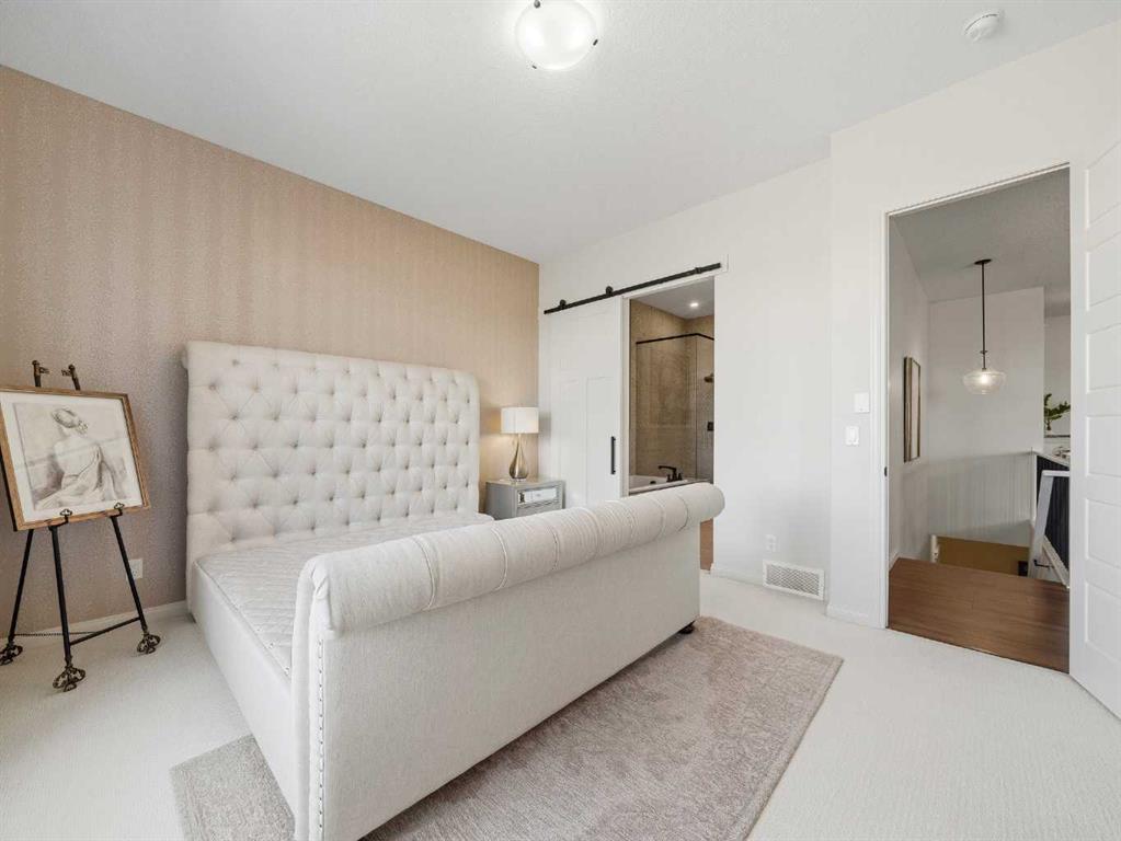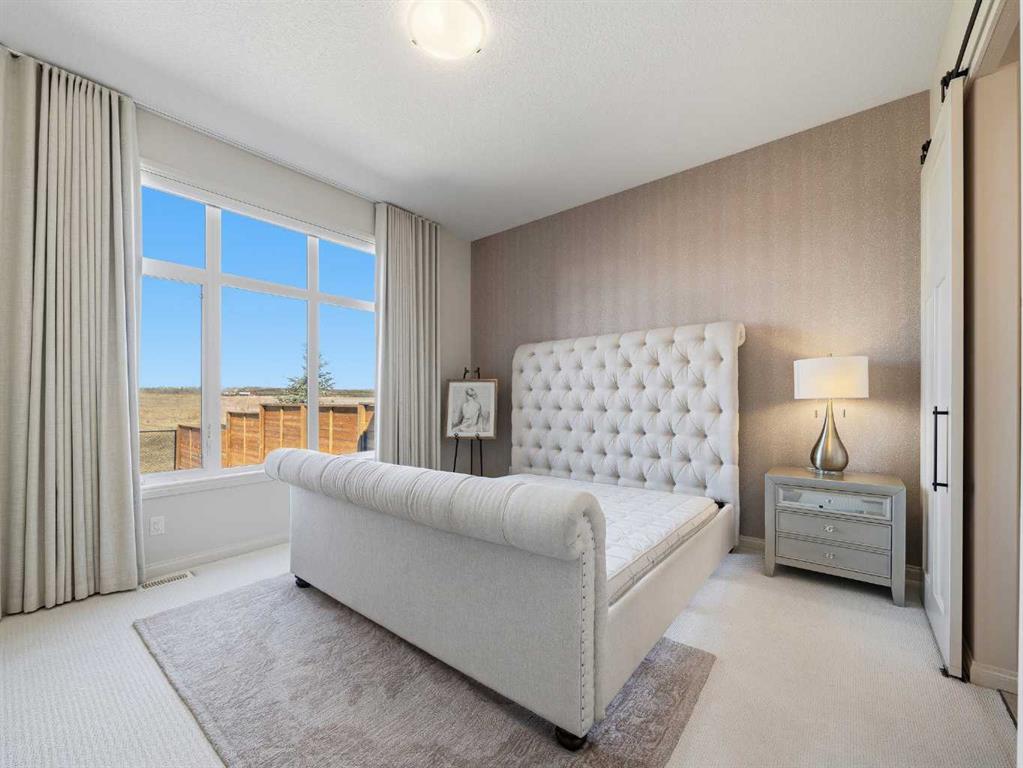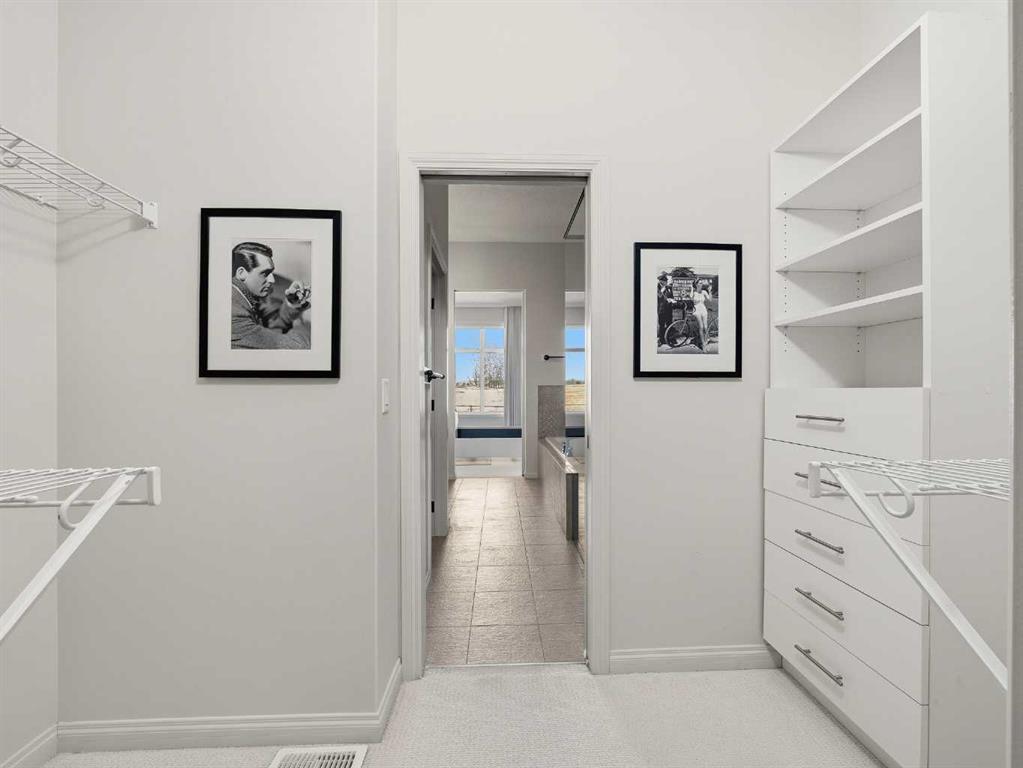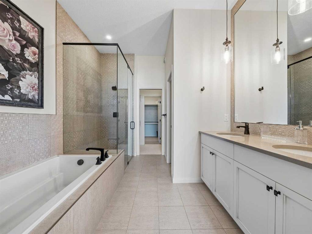 The primary retreat accommodates a king-sized bed and features a spa-like ensuite with heated floors, double comfort-height sinks, oversized shower, separate WC, and a walk-through closet leading directly to the laundry room. Thoughtful design continues with a mudroom offering bench seating and access to the extra-tall garage.